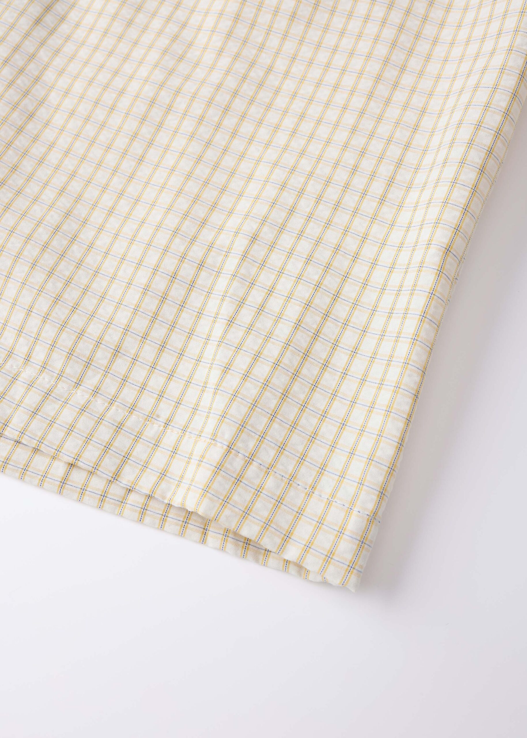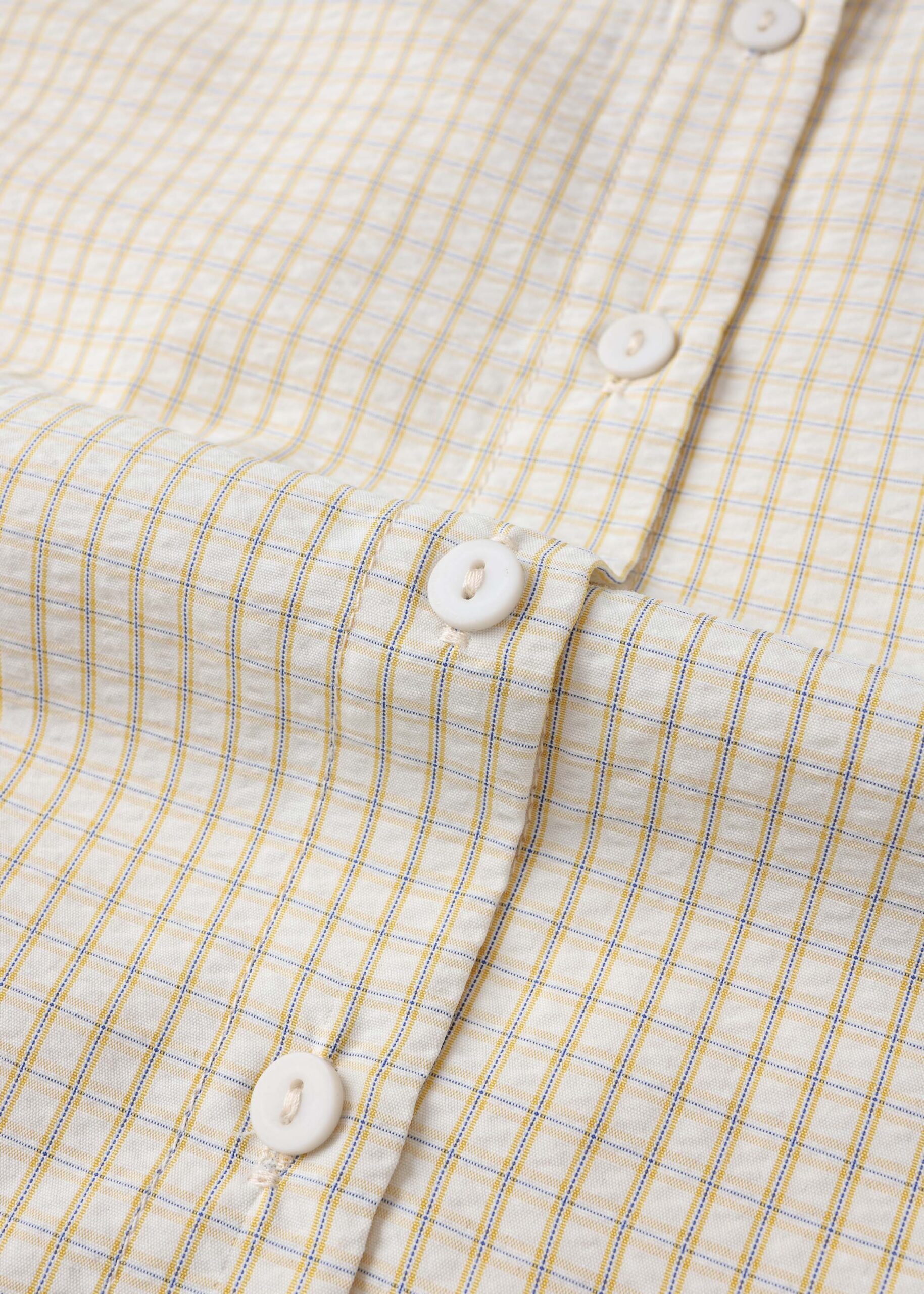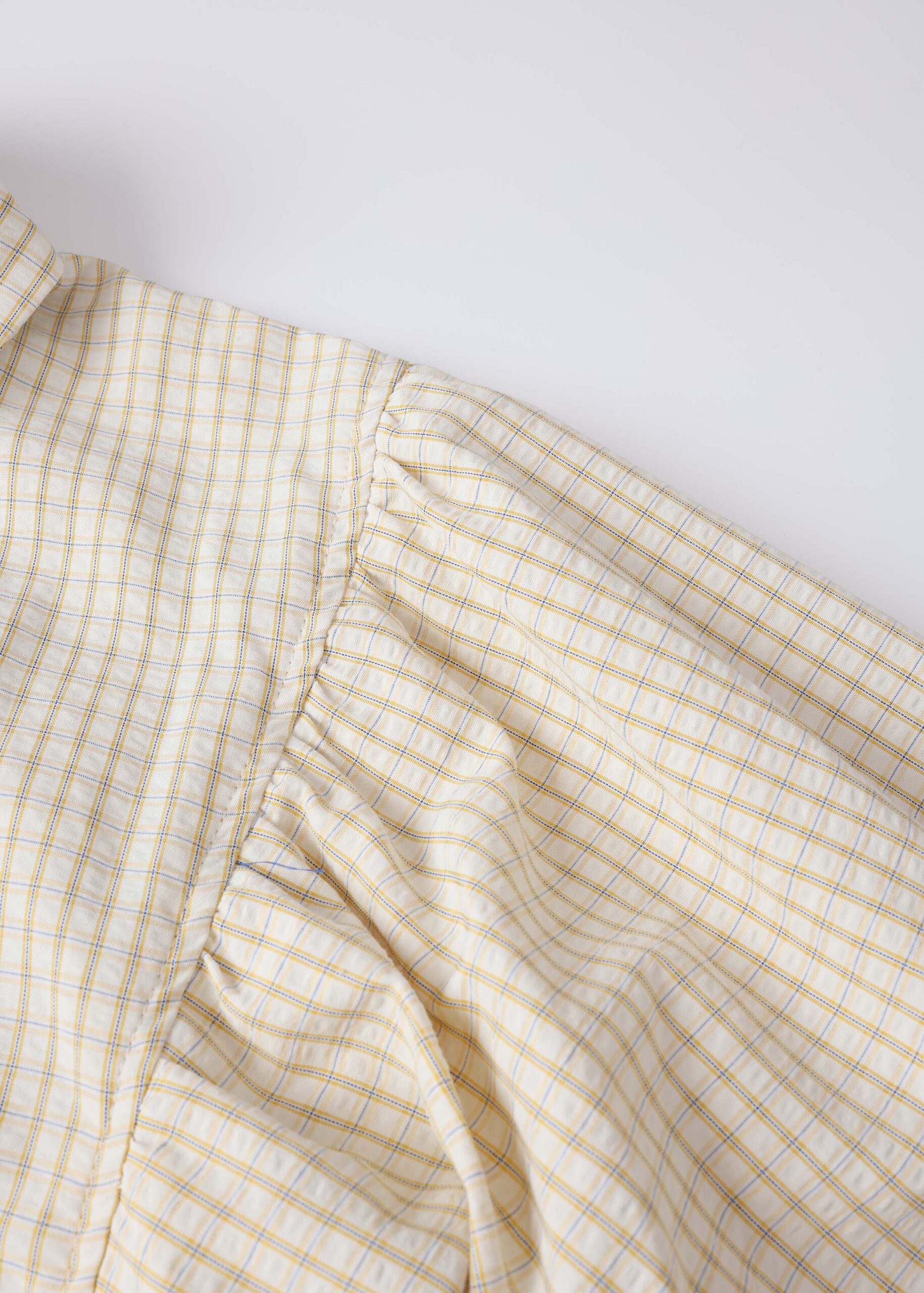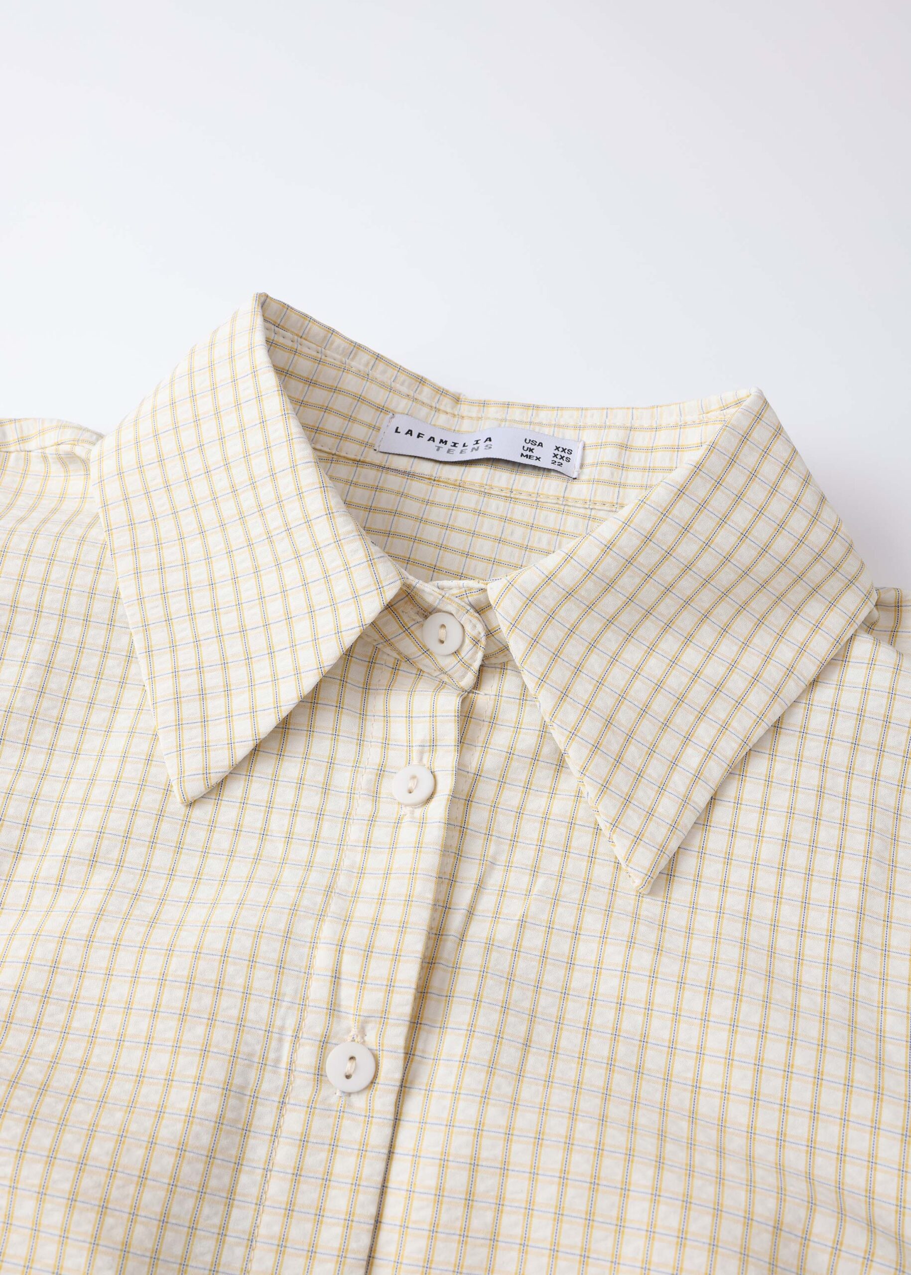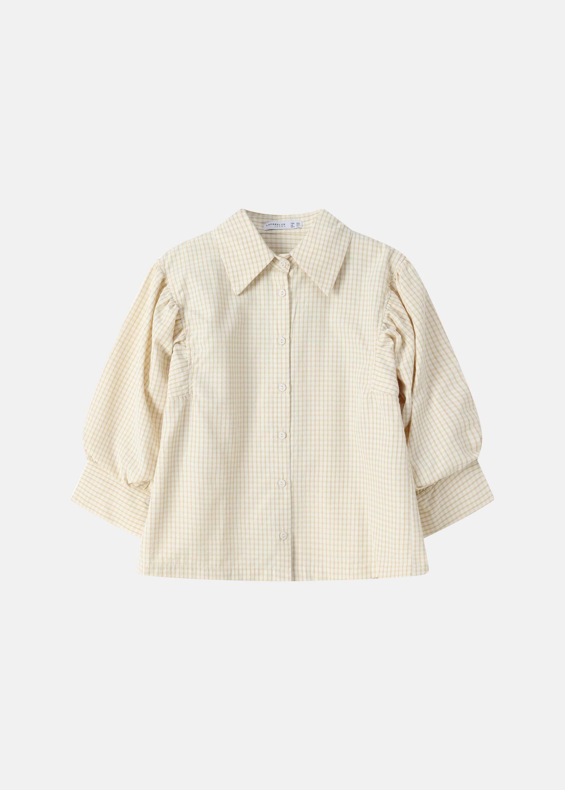 Girl shirt, gingham patterned, classic collar, front buttons to close, long sleeves with wide cuffs, unique and modern