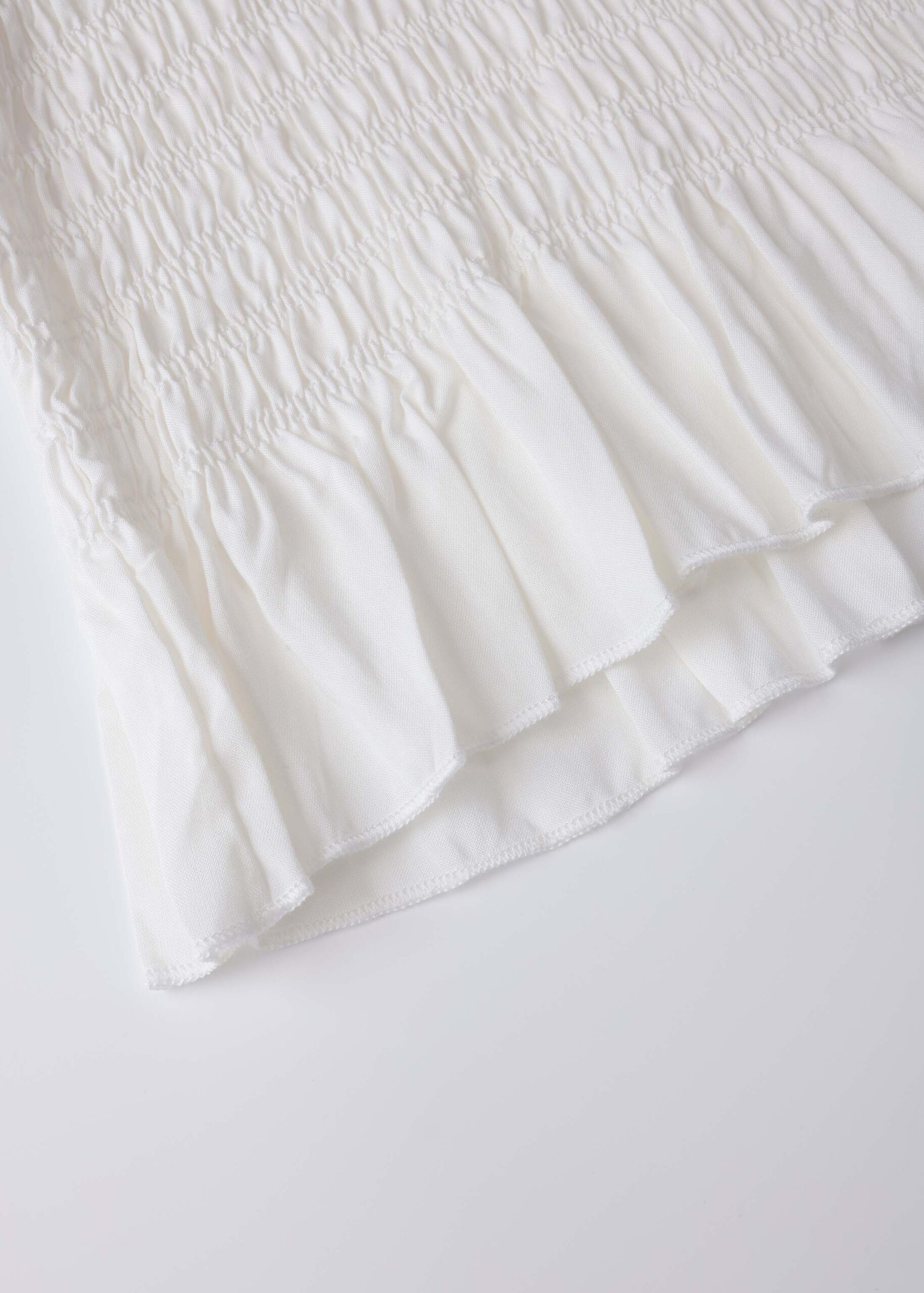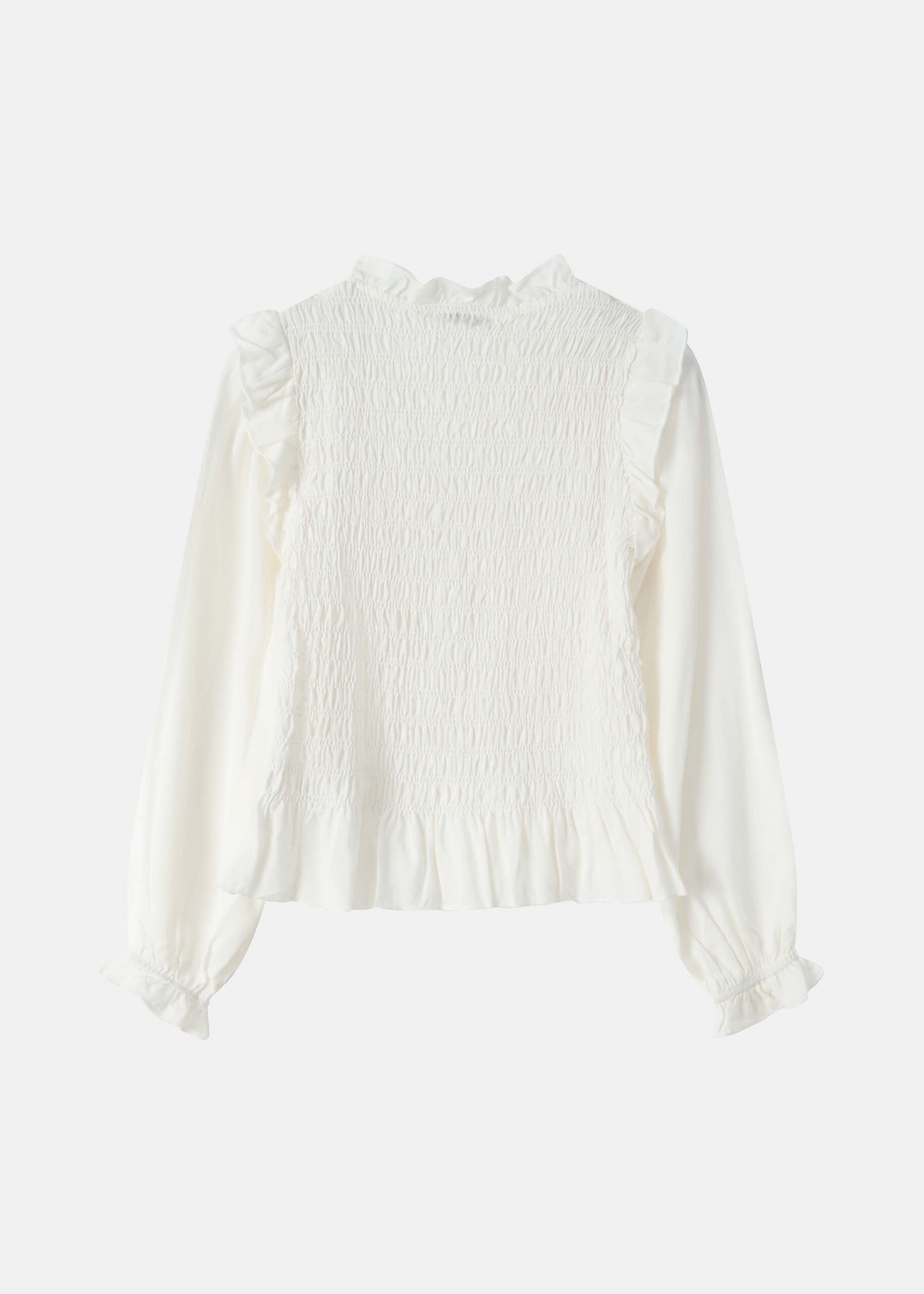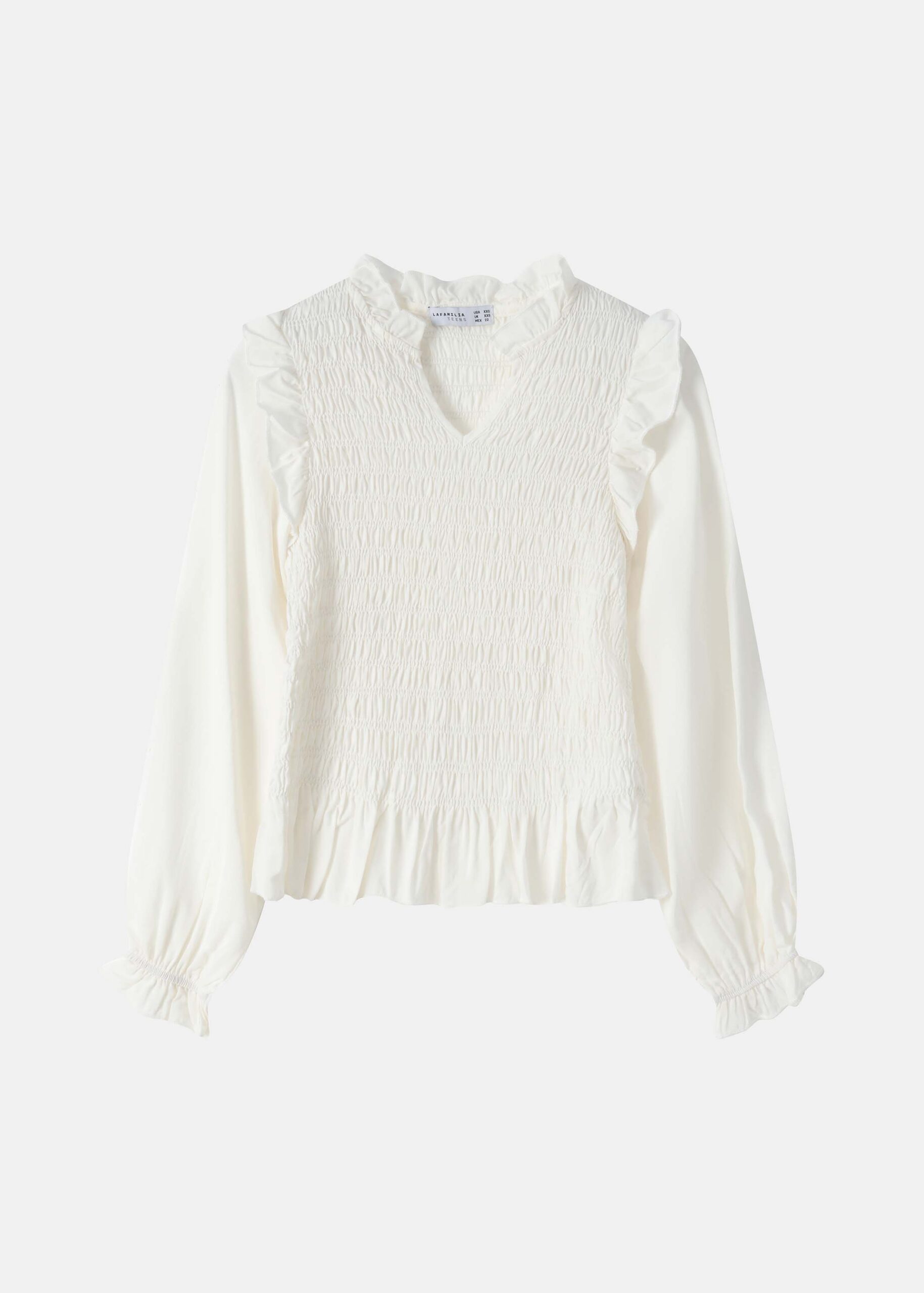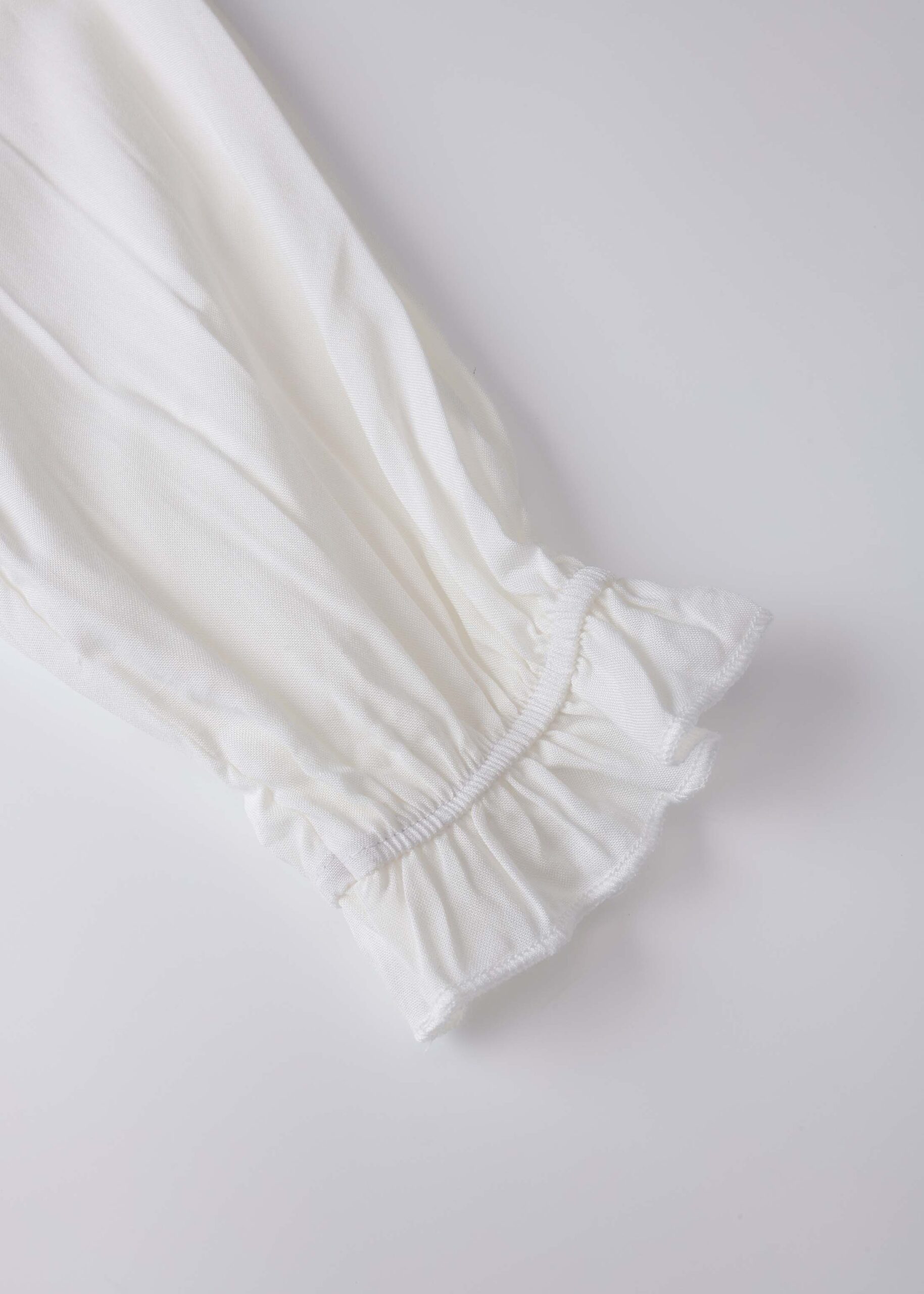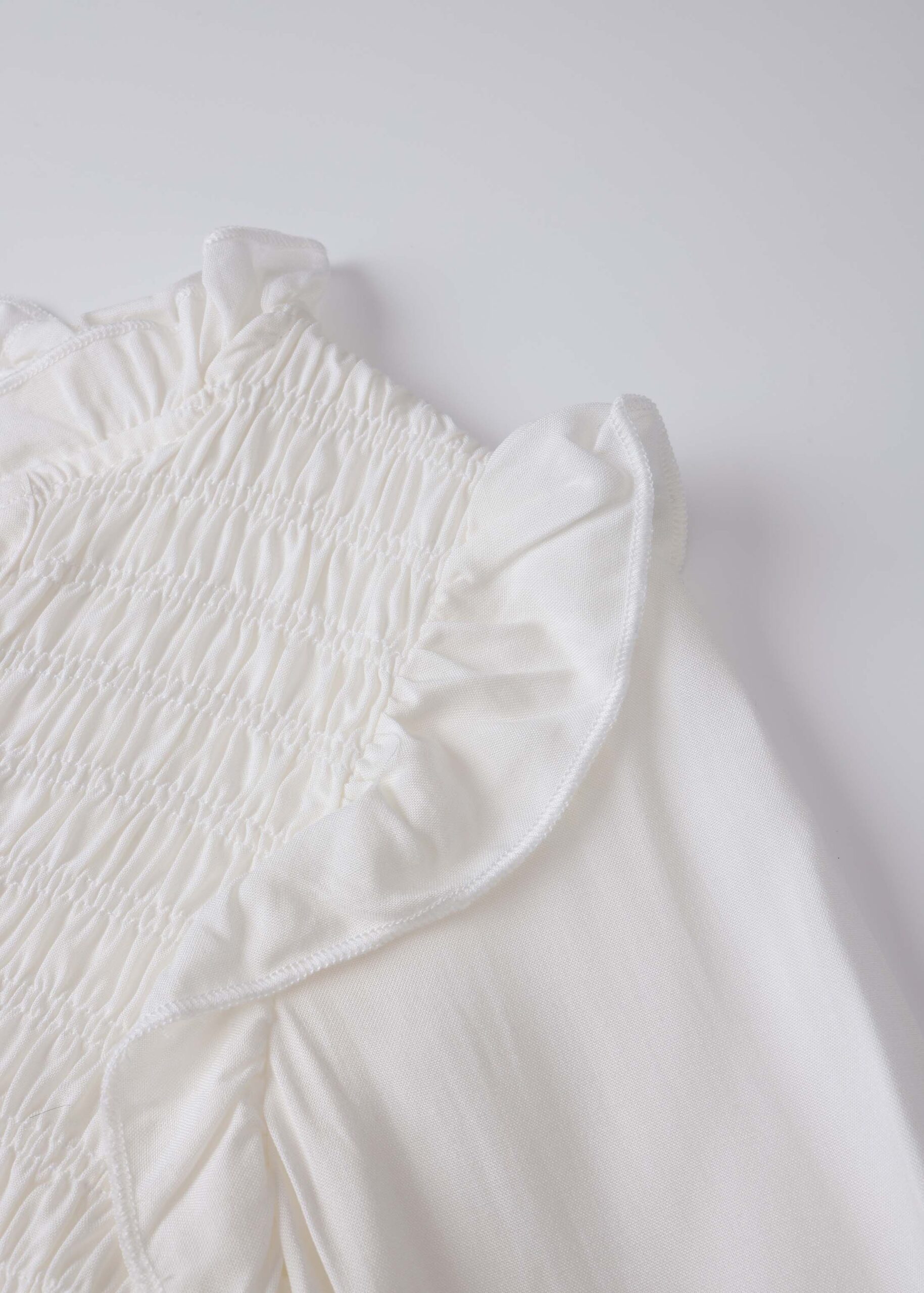 Girl blouse, smock, V neck, long sleeves with elastic ruffled cuff, ruffled hem, unique and modern