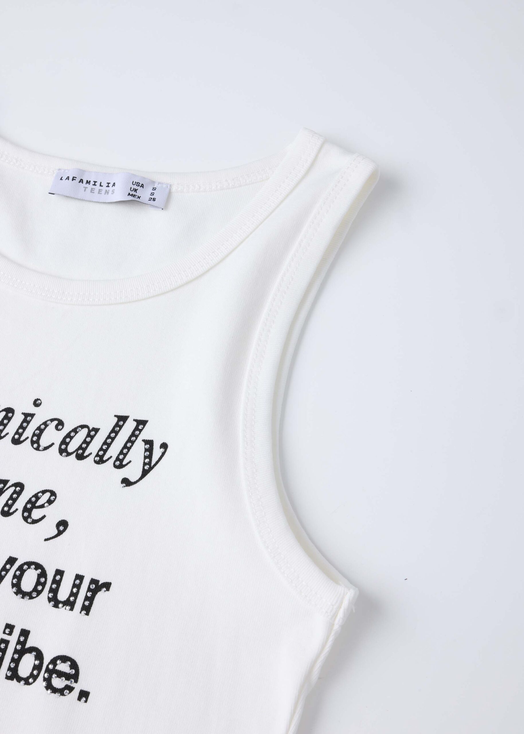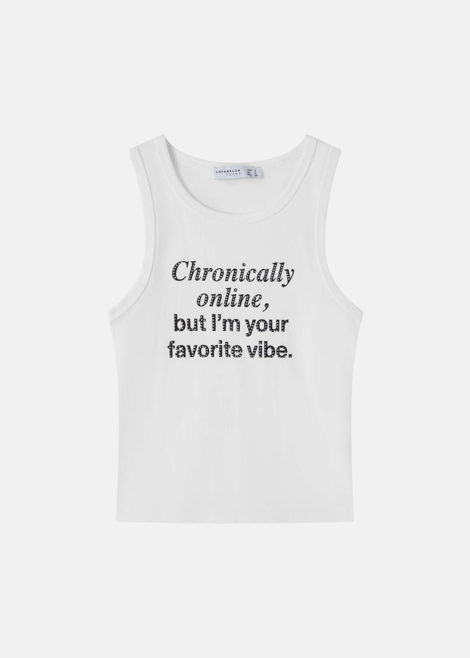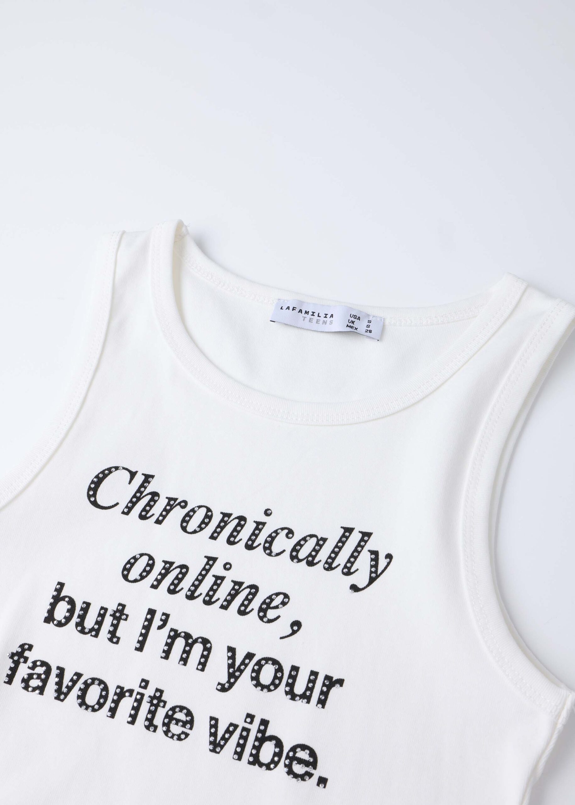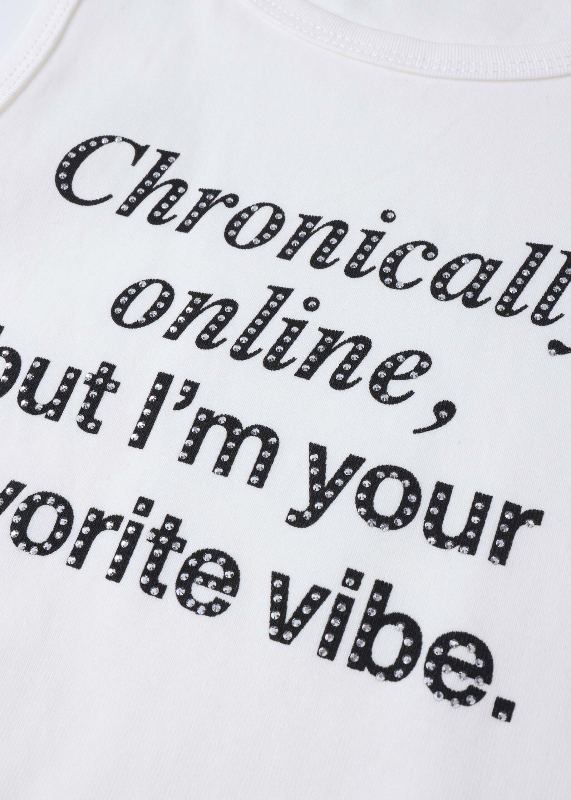 Girl top, “Chronically onlie, but I’m your favourite vibe.” printed from the front with strass decor, round neck, sleeveless, unique and practical