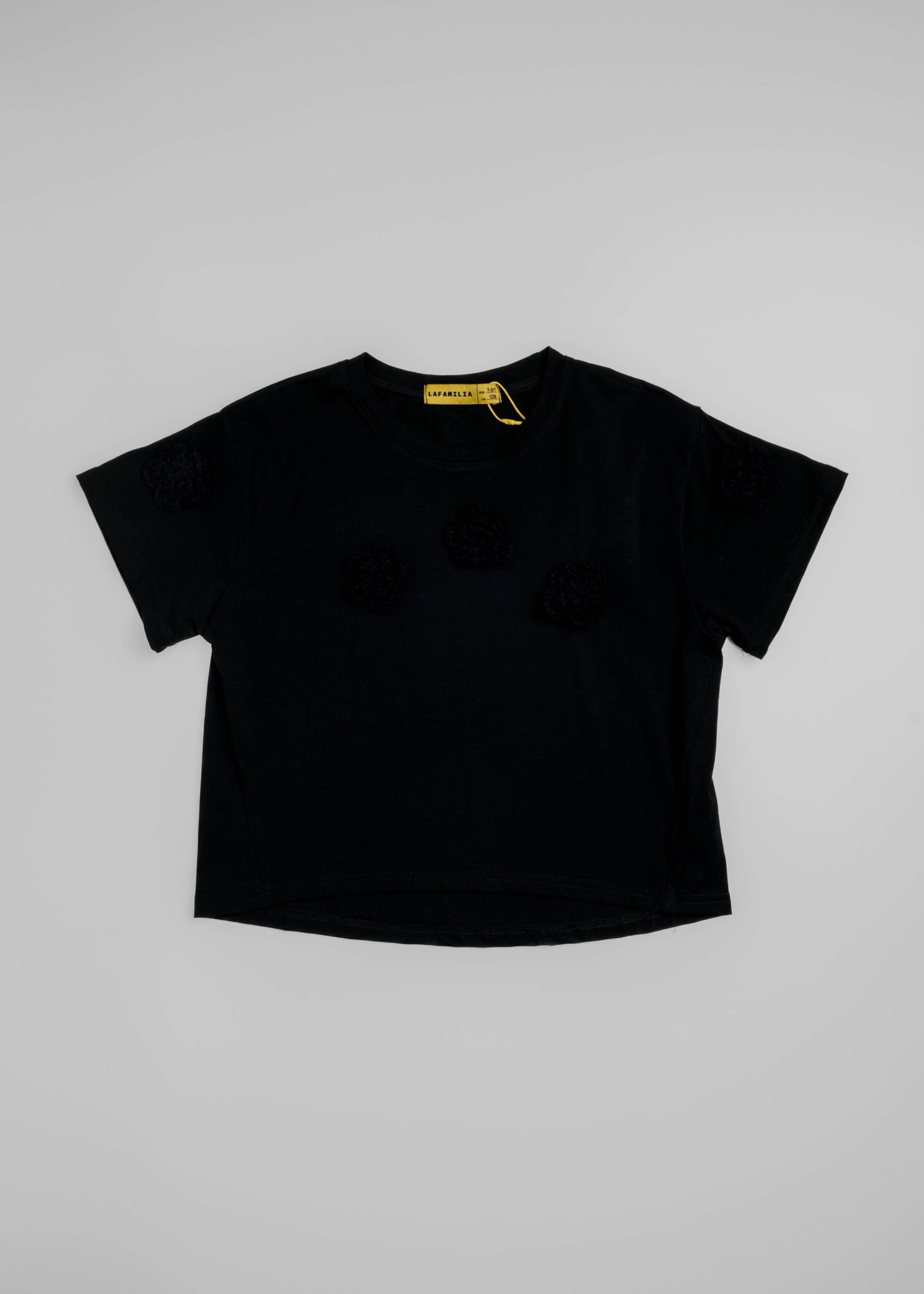 Kids girl t-shirt, flowers decor from the front, round neck, short sleeves, unique and comfortable