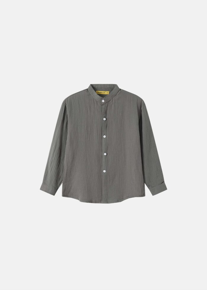 Kids boy shirt, crinkle fabric, stand collar, long sleeves with tight cuff, front buttons to close, unique and modern