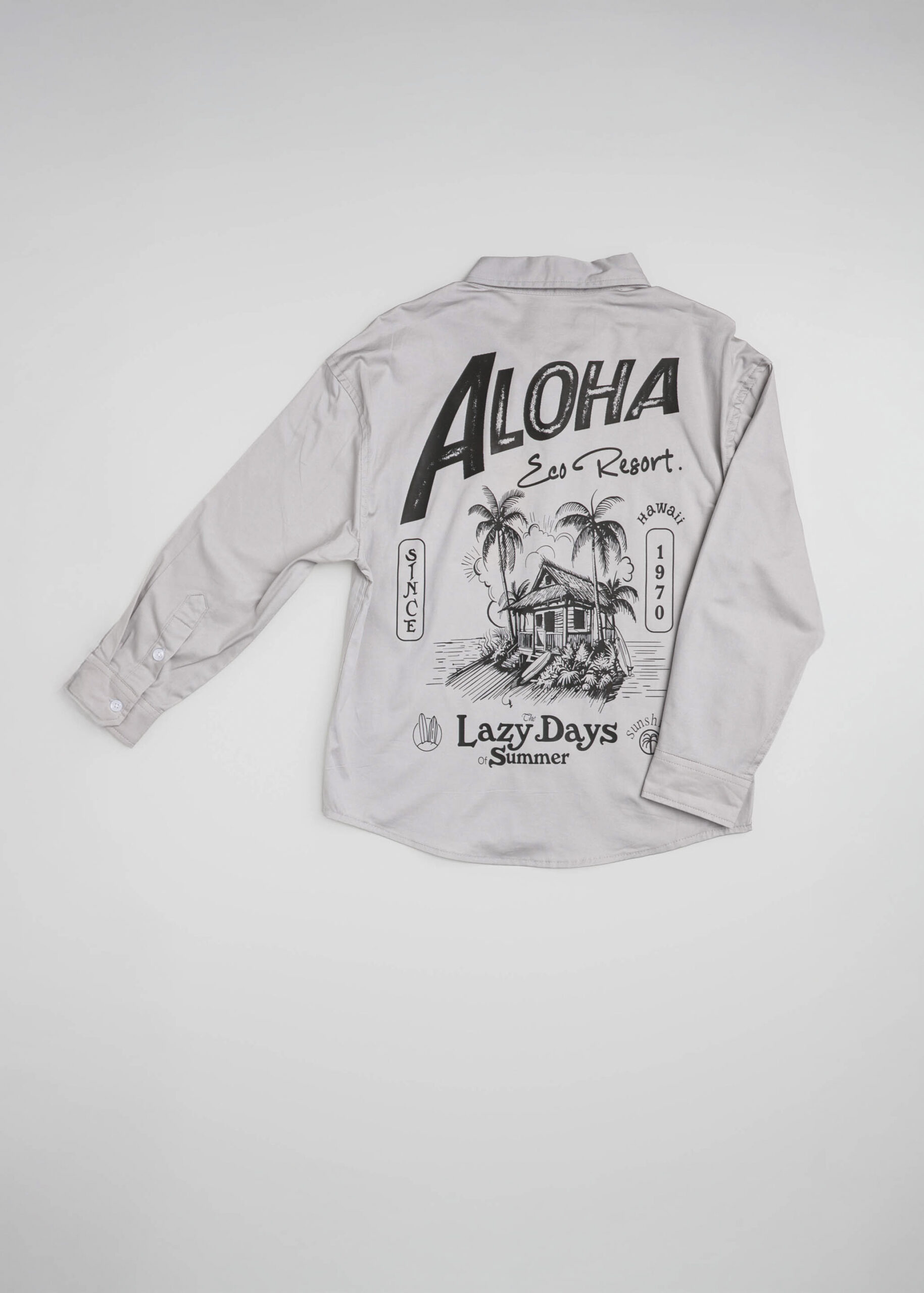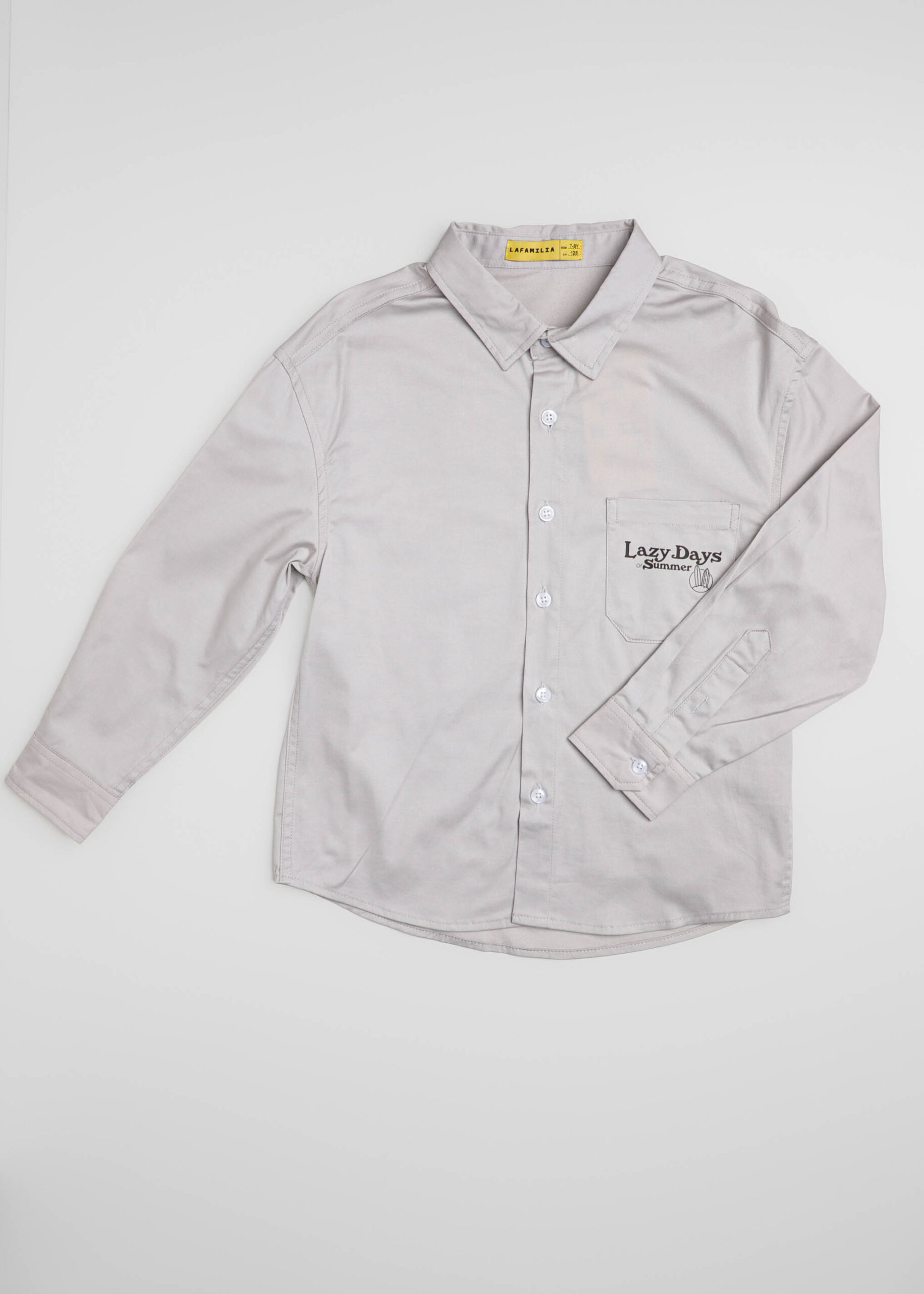 Kids boy shirt, “Lazy Days Summer” printed from the front, front buttons to close, front pocket, long sleeves with tight cuff, rolled collar, unique and modern