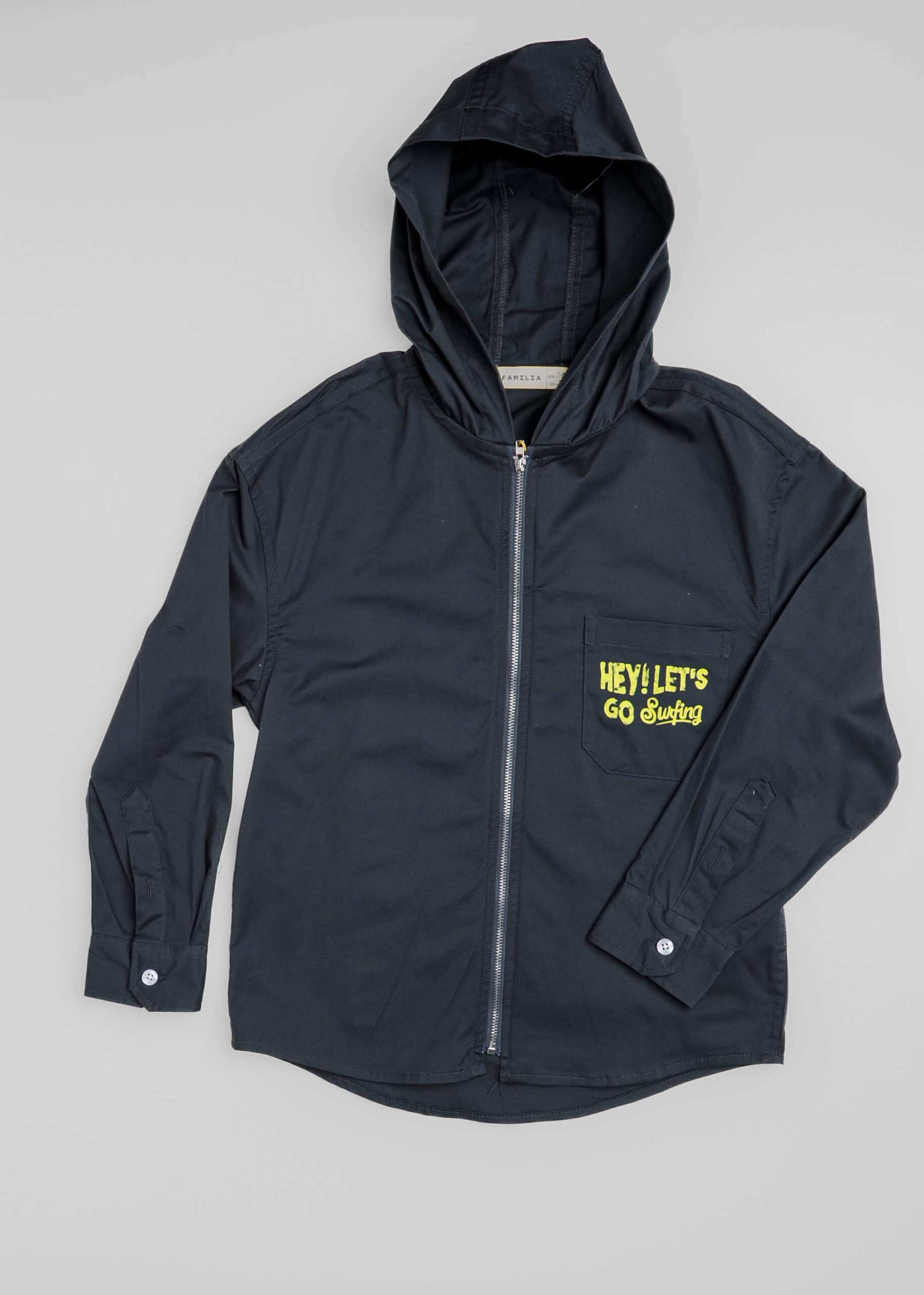 Kids boy sweater, “Let’s Go Surfing” printed from the front and back, front zipper closure, hood, long sleeves with tight cuff, front pocket, unique and modern