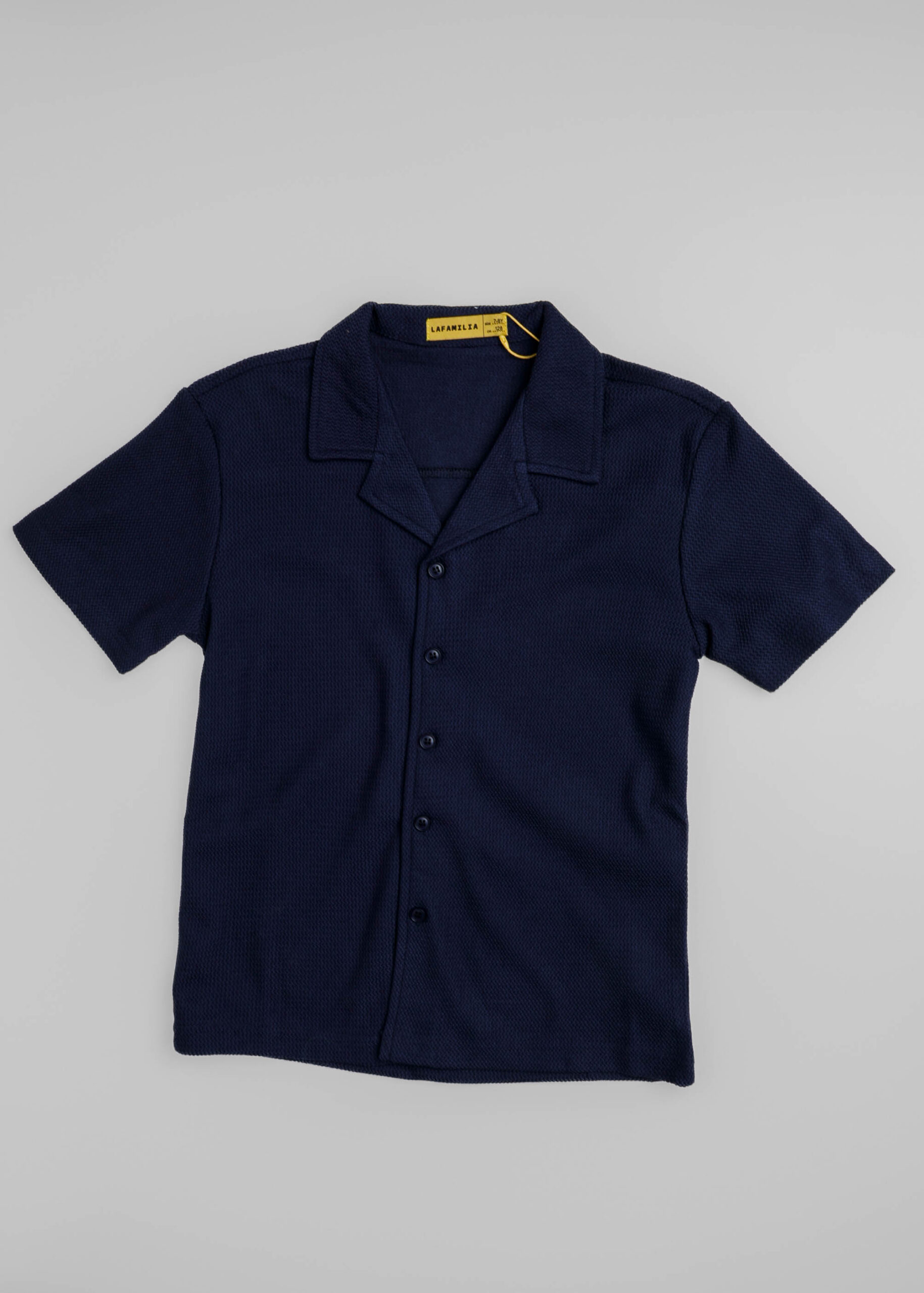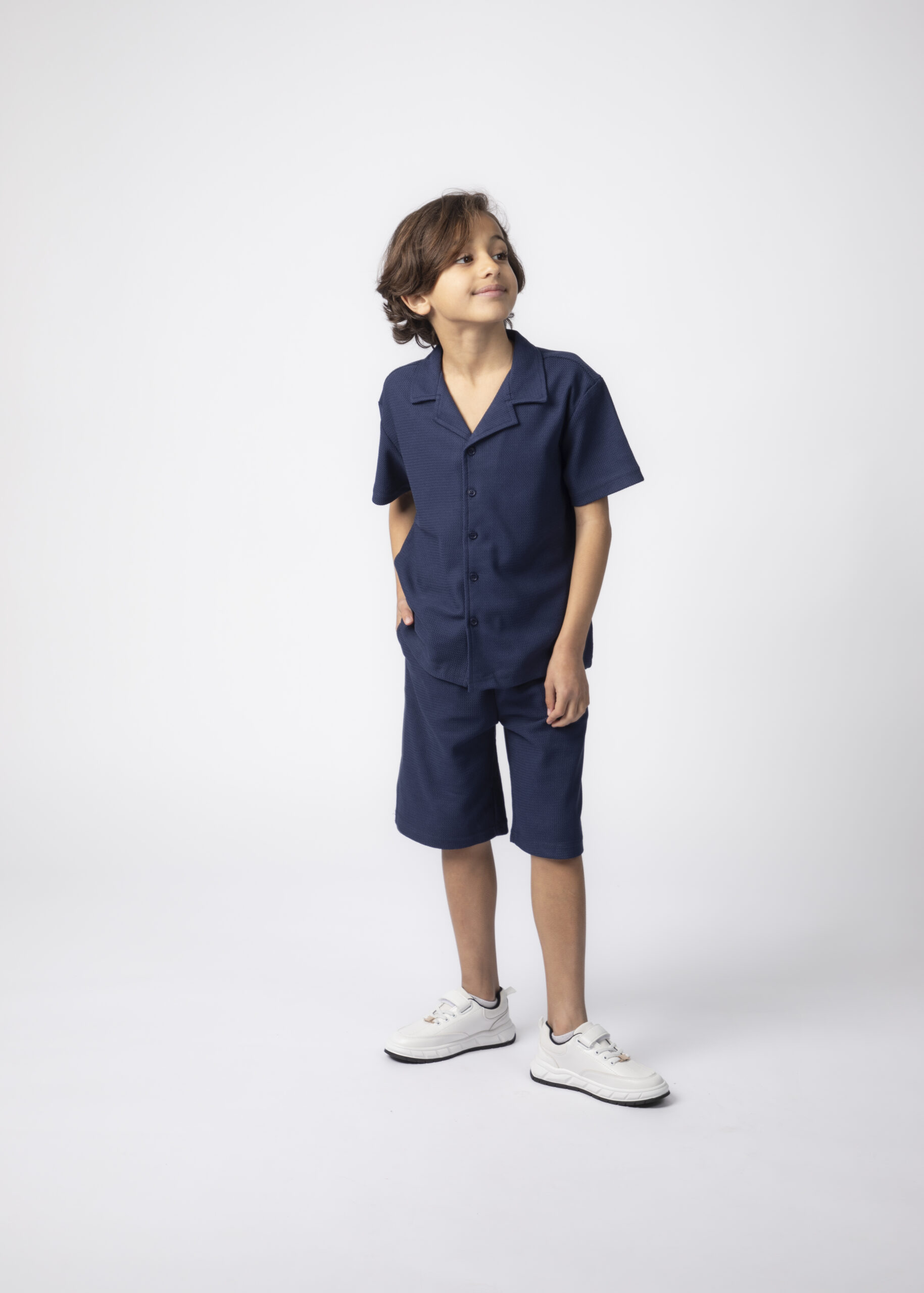 Kids boy shirt, patterned, V neck, short sleeves, front buttons to close, modern and practical