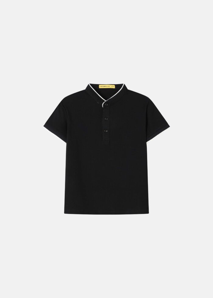 Kids boy top, plain, stand collar with front buttons, tipping along the collar and sleeve cuffs, short sleeves, unique and modern