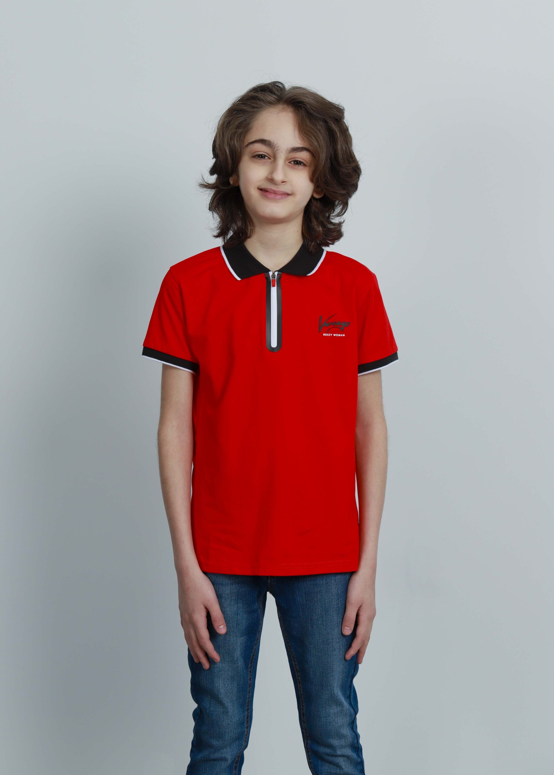 Kids boy polo t-shirt, short striped sides sleeves, rolled collar with front zipper closure, front printed, practical and unique, 85% Cotton 10% Polyester 5% Spandex
