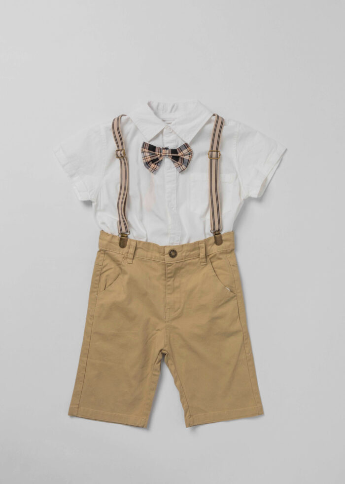 Kids boy suit, two-pieces, shirt, plain, rolled collar with front bow, front buttons to close, short sleeves, suspenders, short, plain, front button and zipper closure, front and back pockets, unique and modern