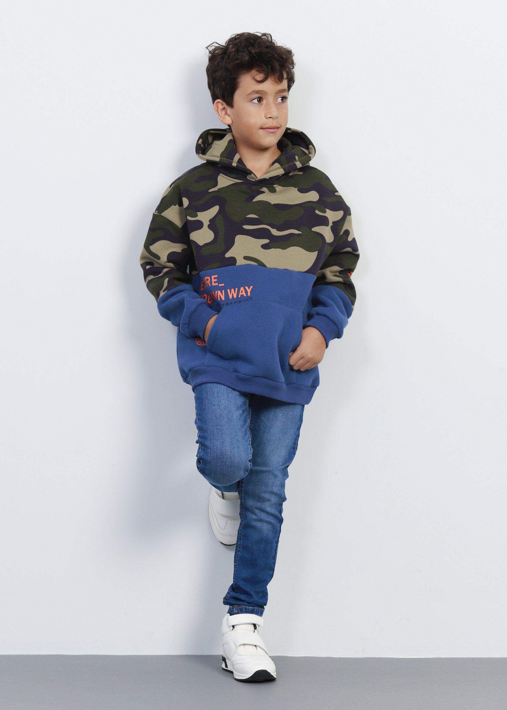 Kids boy hoodie, two tone, army half and printed “Explore your own way”, front pocket, long sleeves with tight cuff, hood, warm and unique, 25% Cotton 75% Polyester