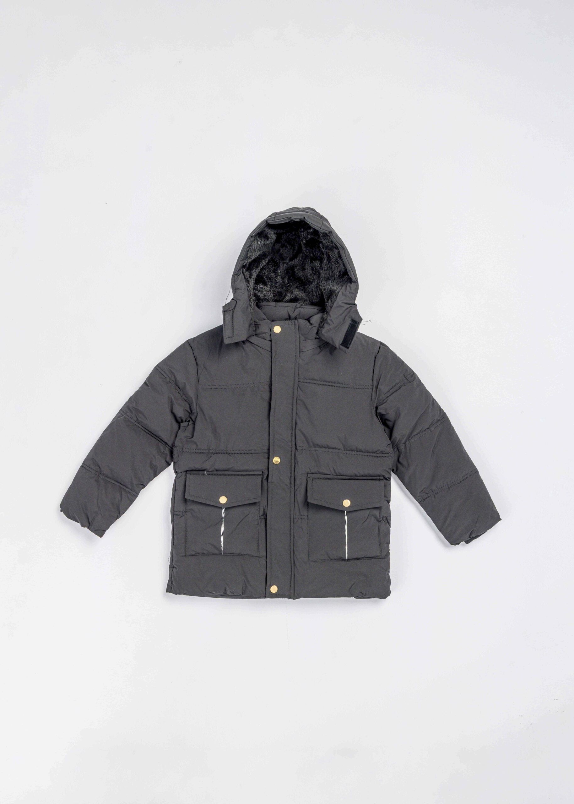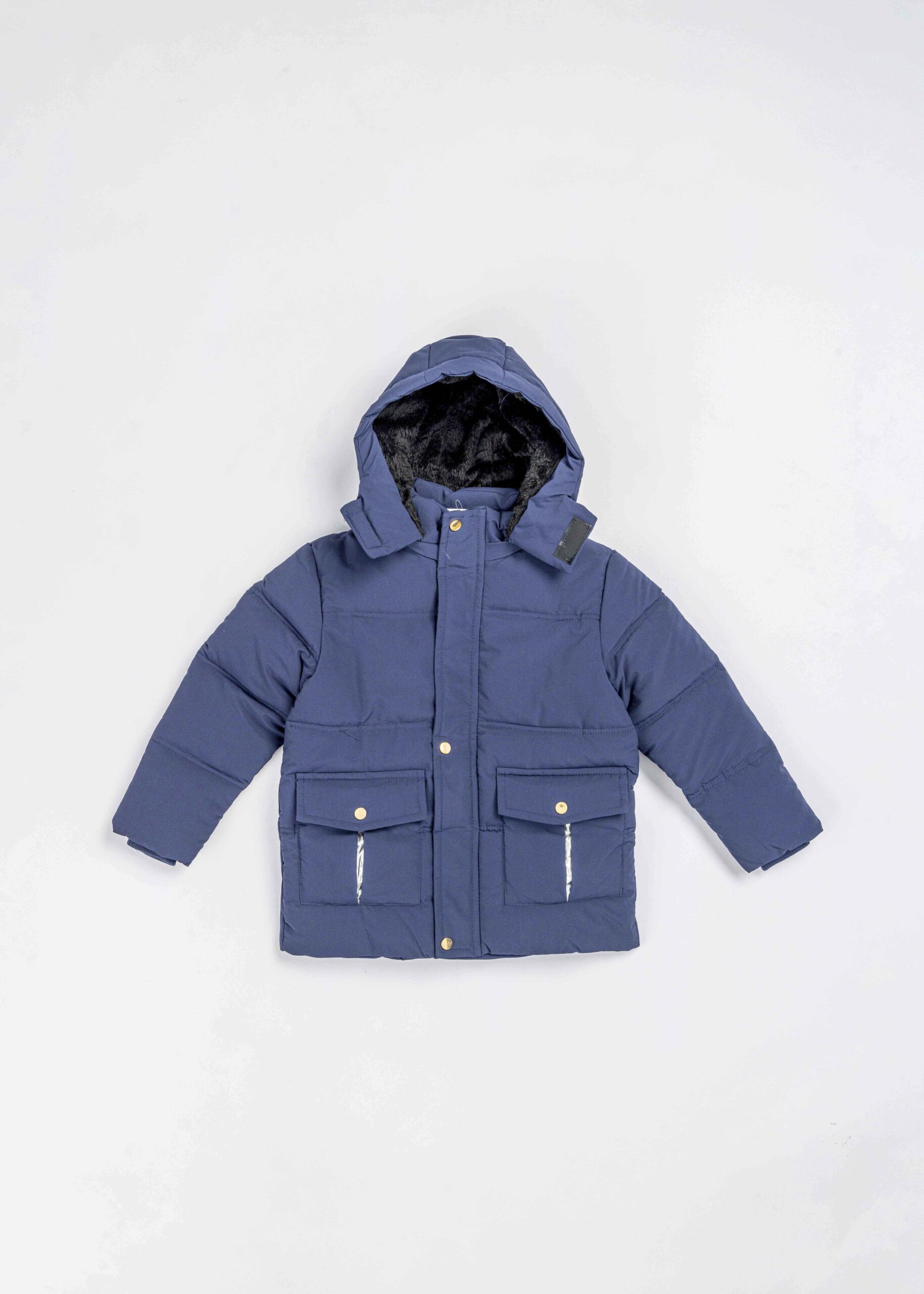 Kids boy jacket, waterproof, hood with fur lined and front hook and loop, long sleeves with elastic cuff, front buttons and zipper closure, front pockets, unique and warm