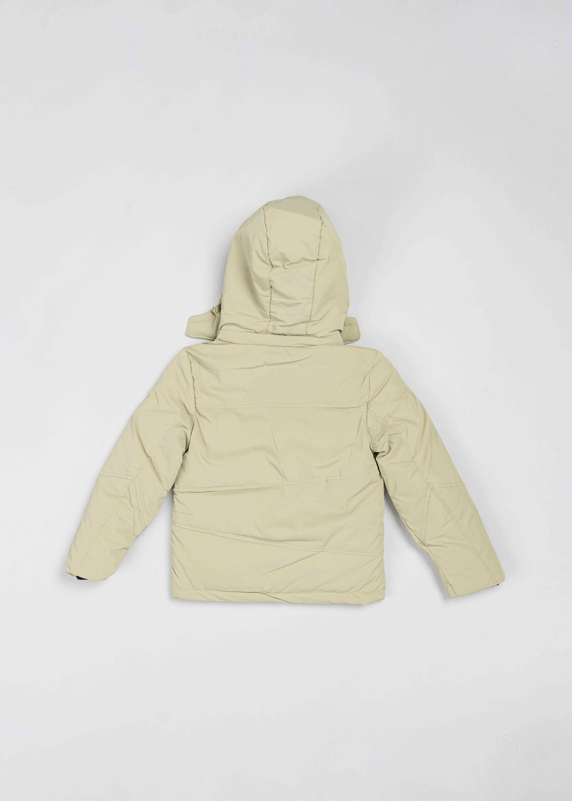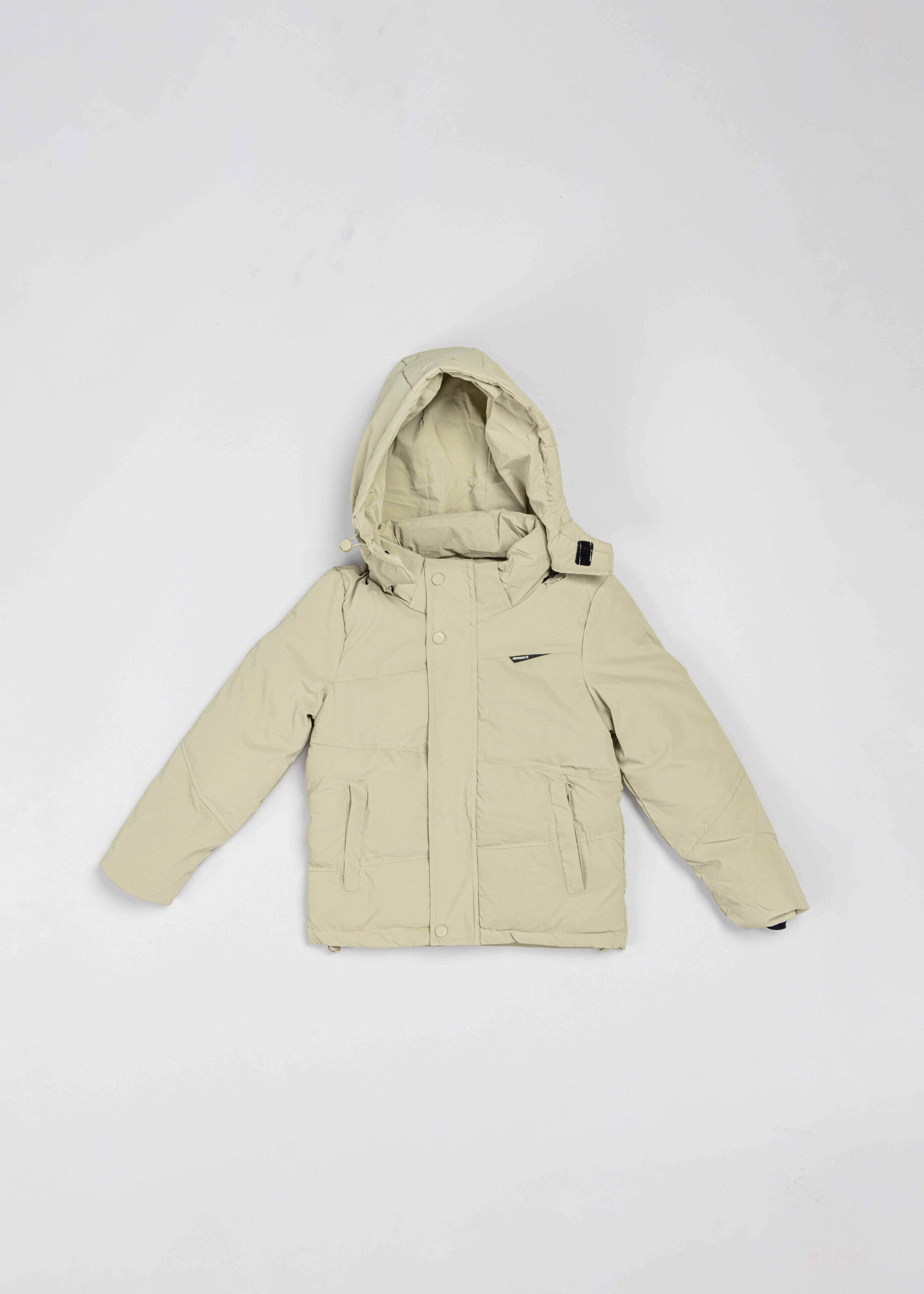 Kids boy jacket, waterproof, hood with front hook and loop, long sleeves with elastic cuff, front zipper closure and buttons, front pockets with zipper closure, unique and warm