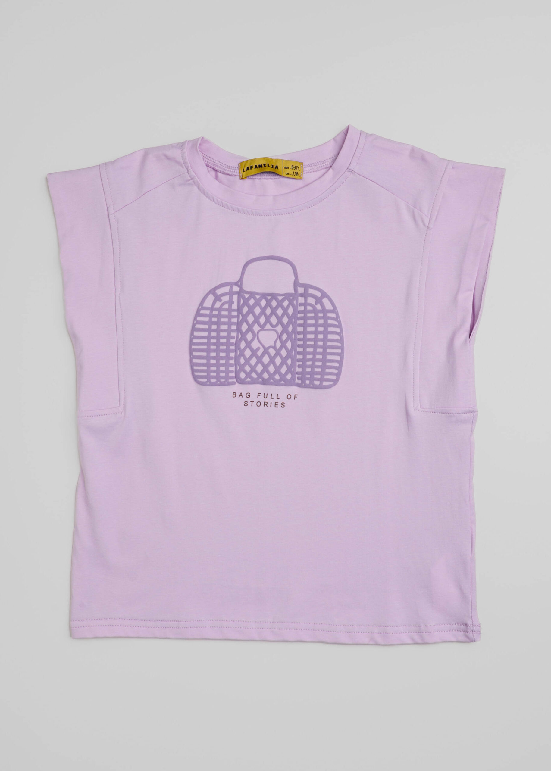 Kids girl t-shirt, “Bag Full of Stories” printed from the front, round neck, sleeveless, unique and modern