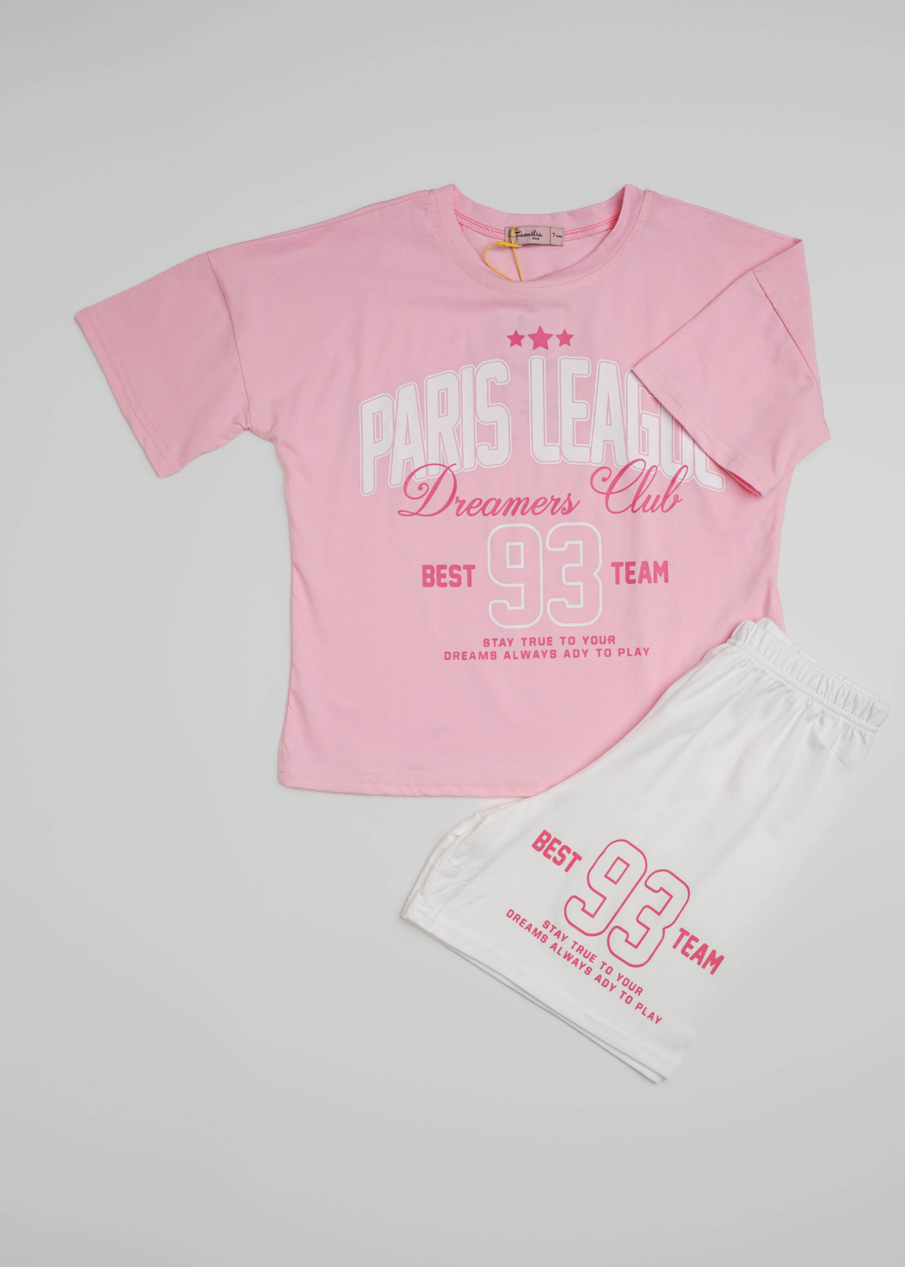 Kids girl pajama, two-pieces, “Best 93 Team” printed, t-shirt, round neck, short sleeves, short, elastic waist, practical and comfortable