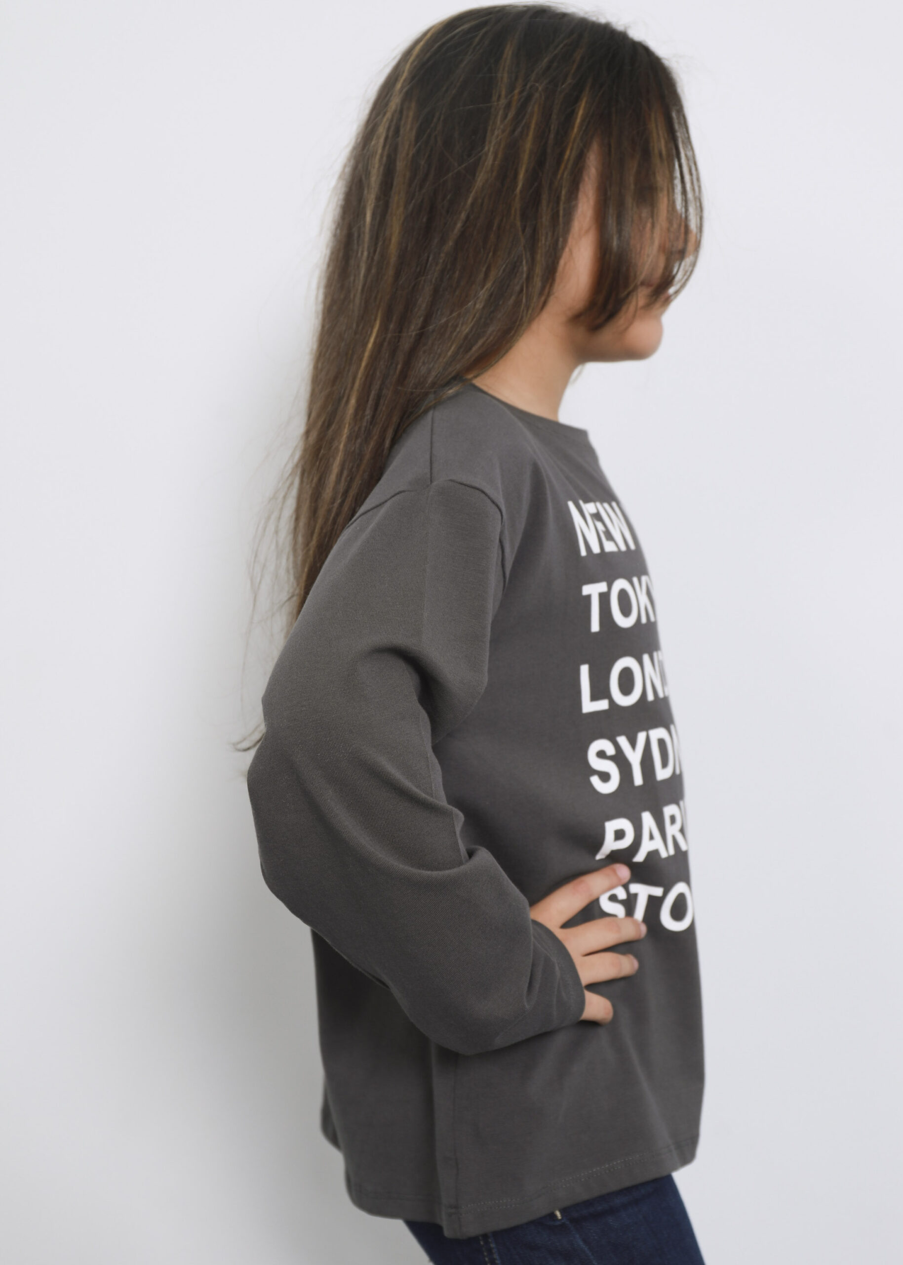 Kids girl blouse, long sleeves, round neck, city names (New York, Tokyo, London, Sydney, Paris, Stockholm) printed from the front, comfortable, 70% Cotton 25% Polyester 5% Spandex