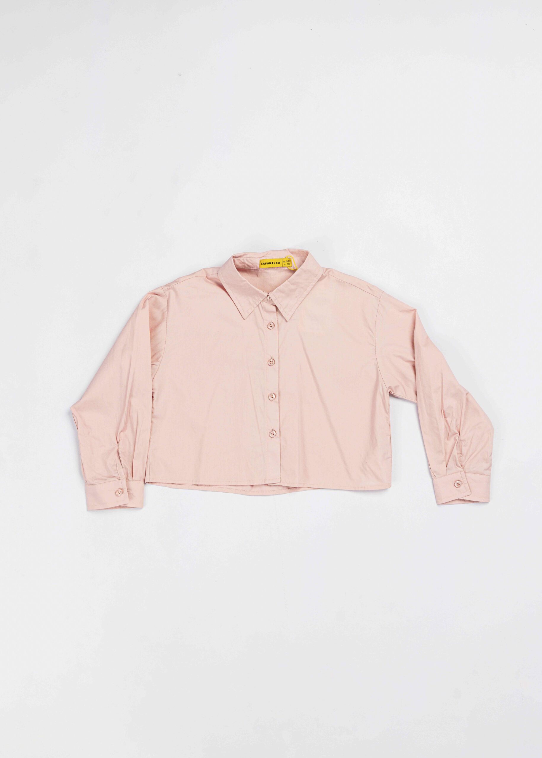 Kids girl shirt, plain, cropped, rolled collar, front buttons to close, long sleeves with tight cuff, unique and modern