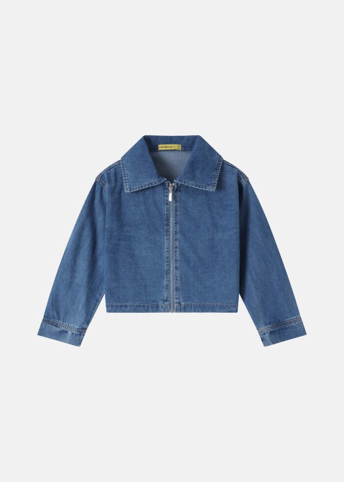 Kids girl jacket, denim, rolled collar, front zipper closure, long sleeves with tight cuff, unique and practical