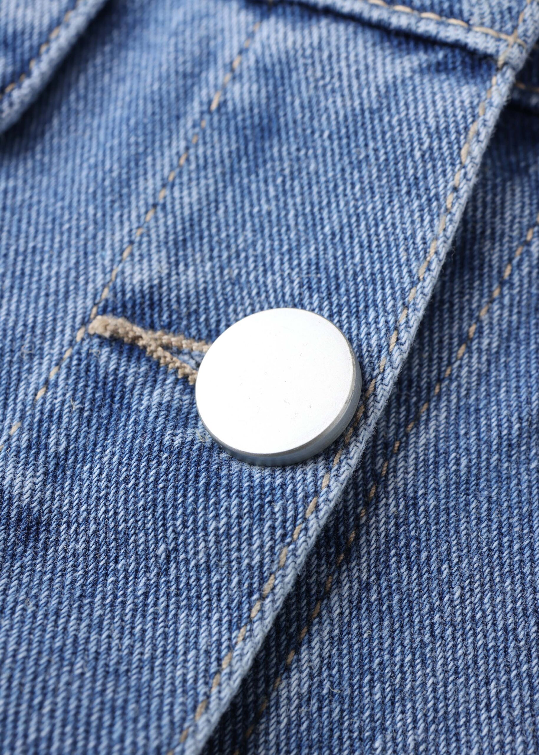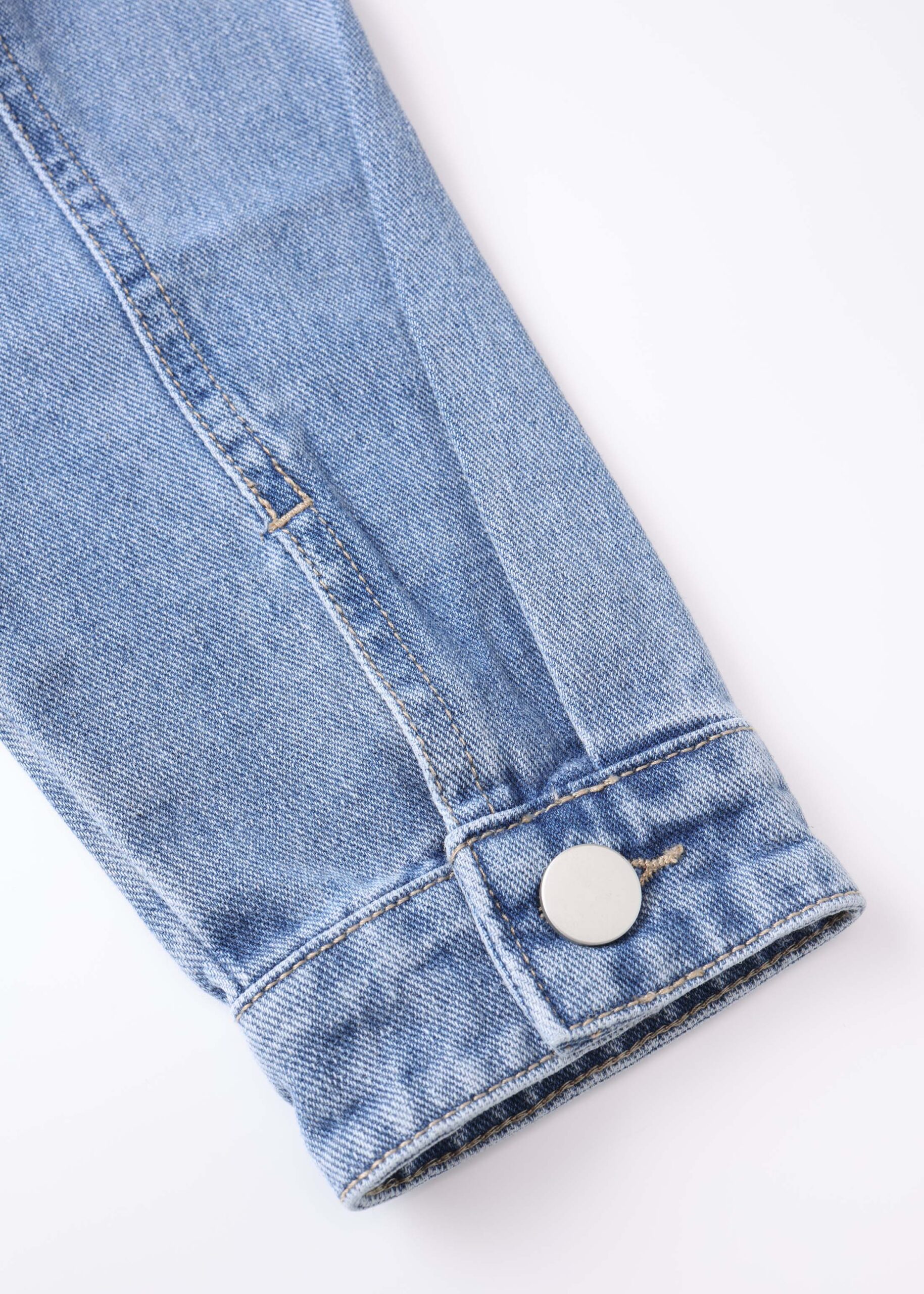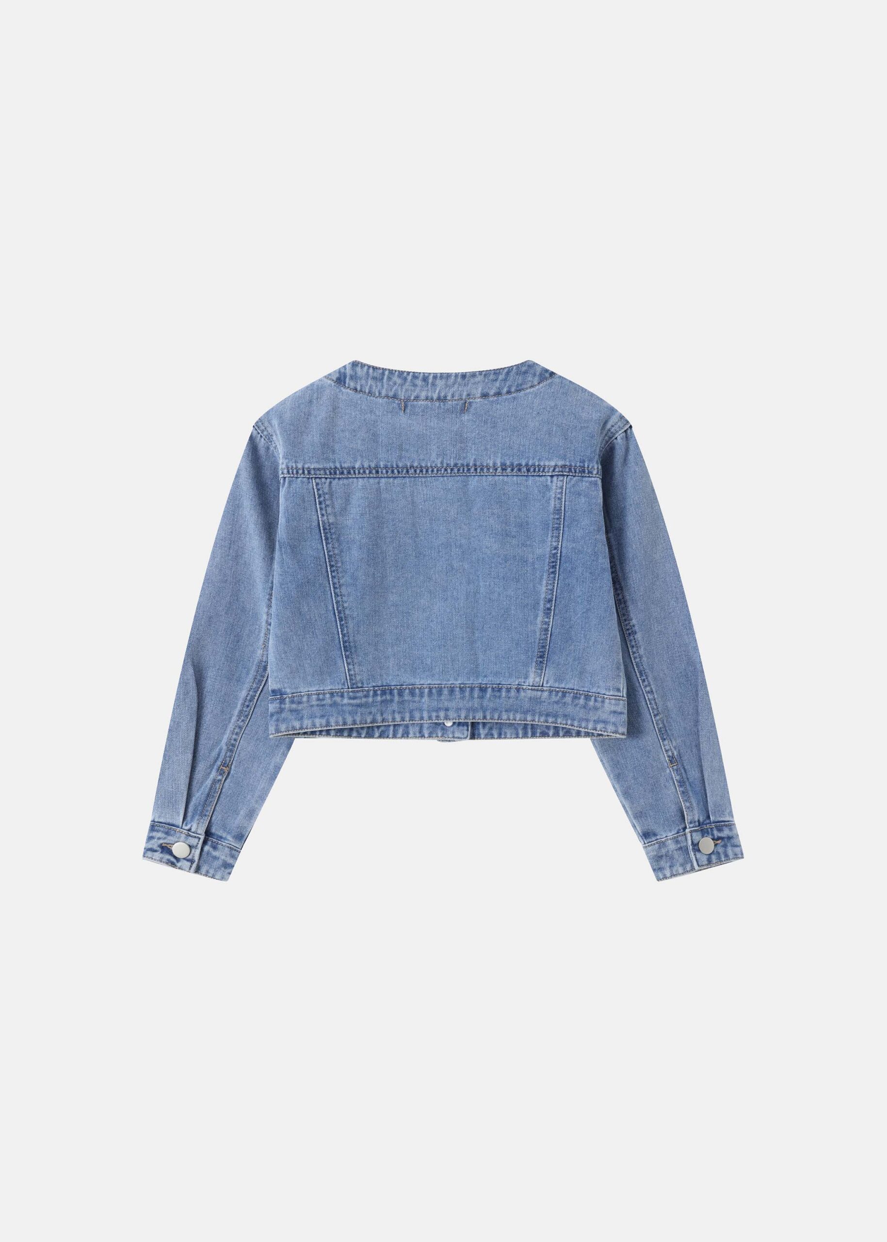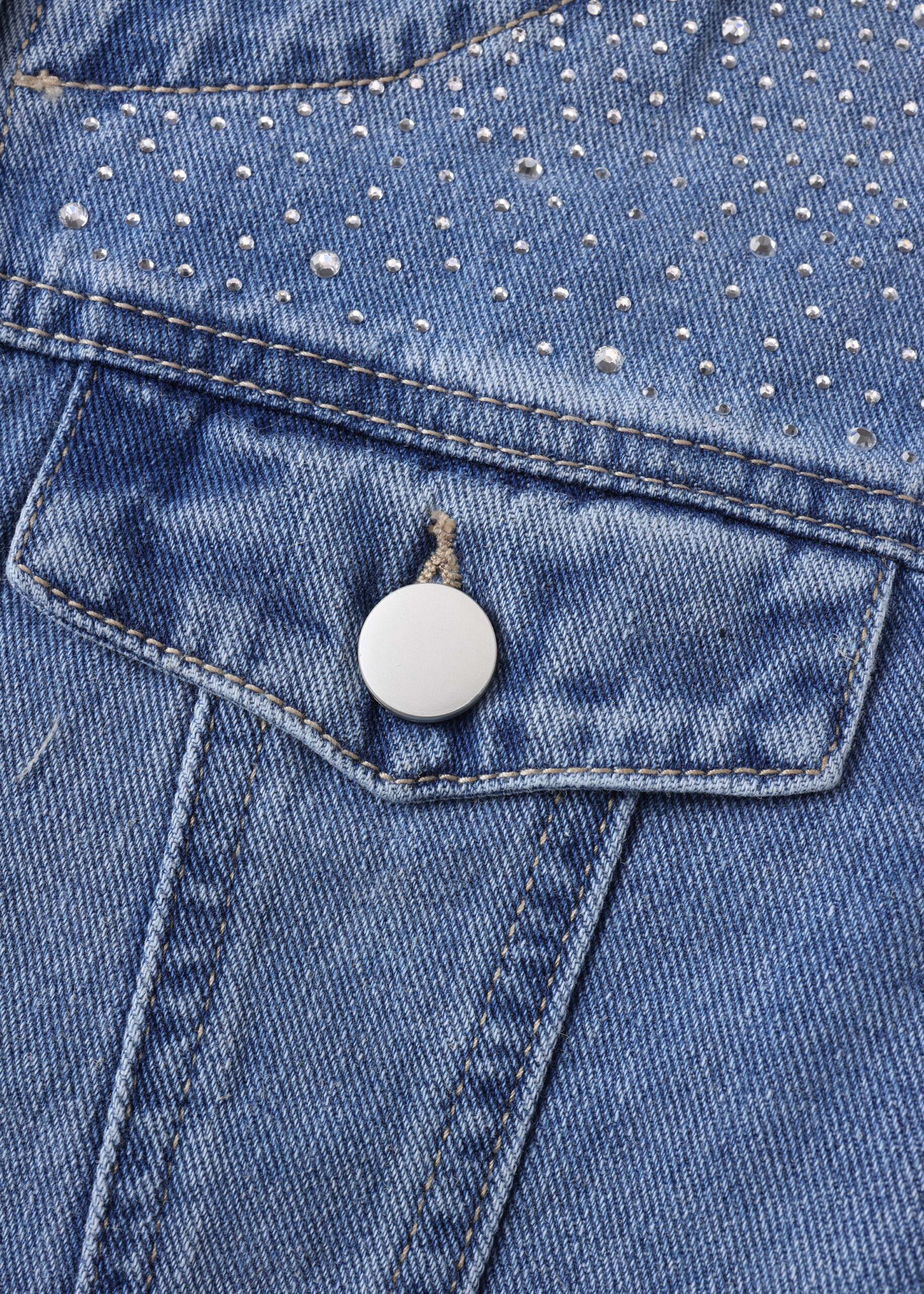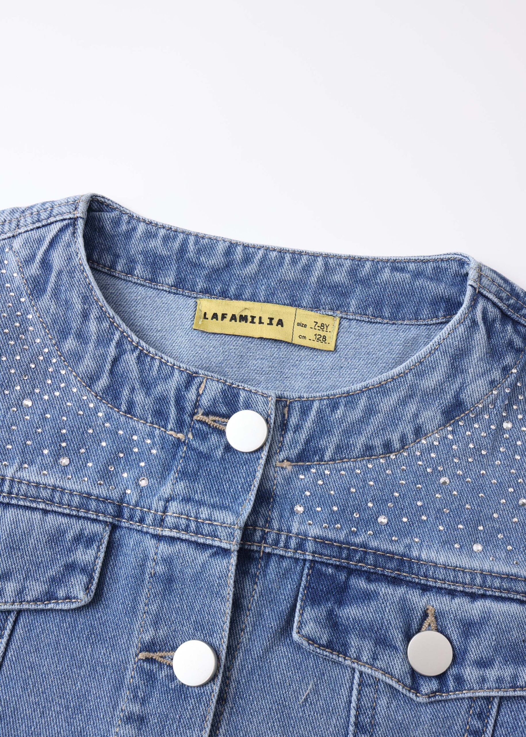 Kids girl jacket, denim, strass decor, round neck, front buttons to close, long sleeves with tight cuff, unique and modern