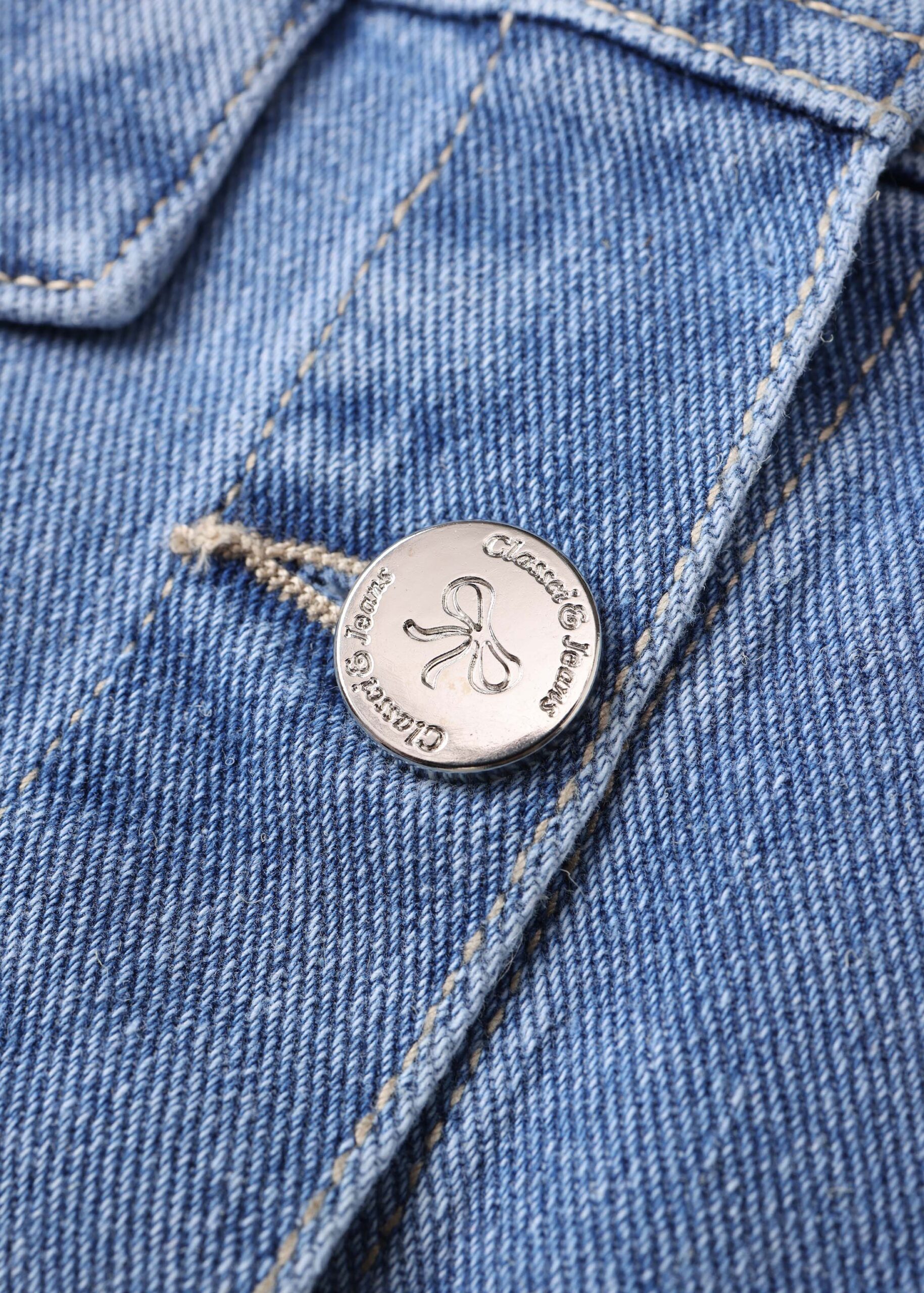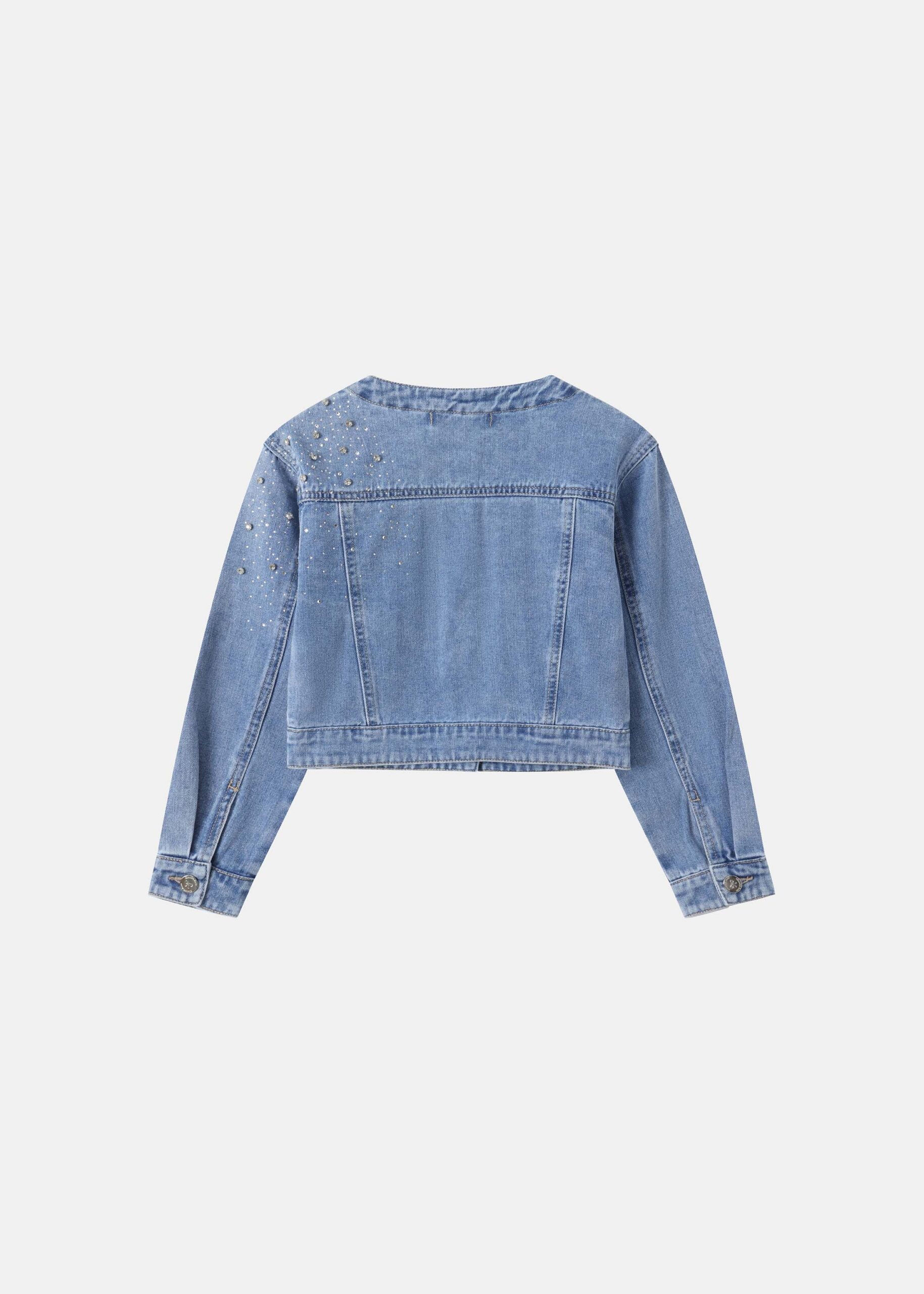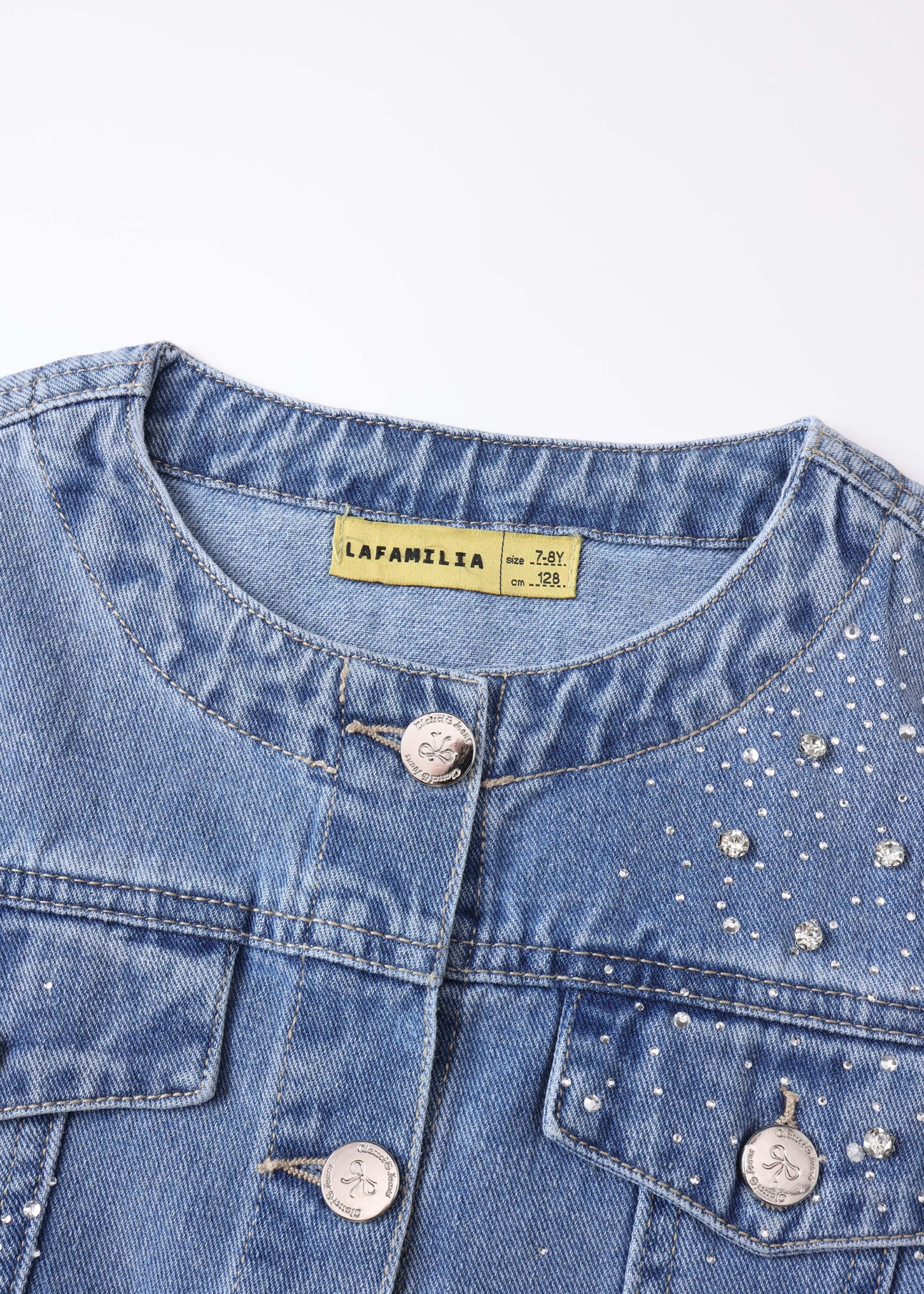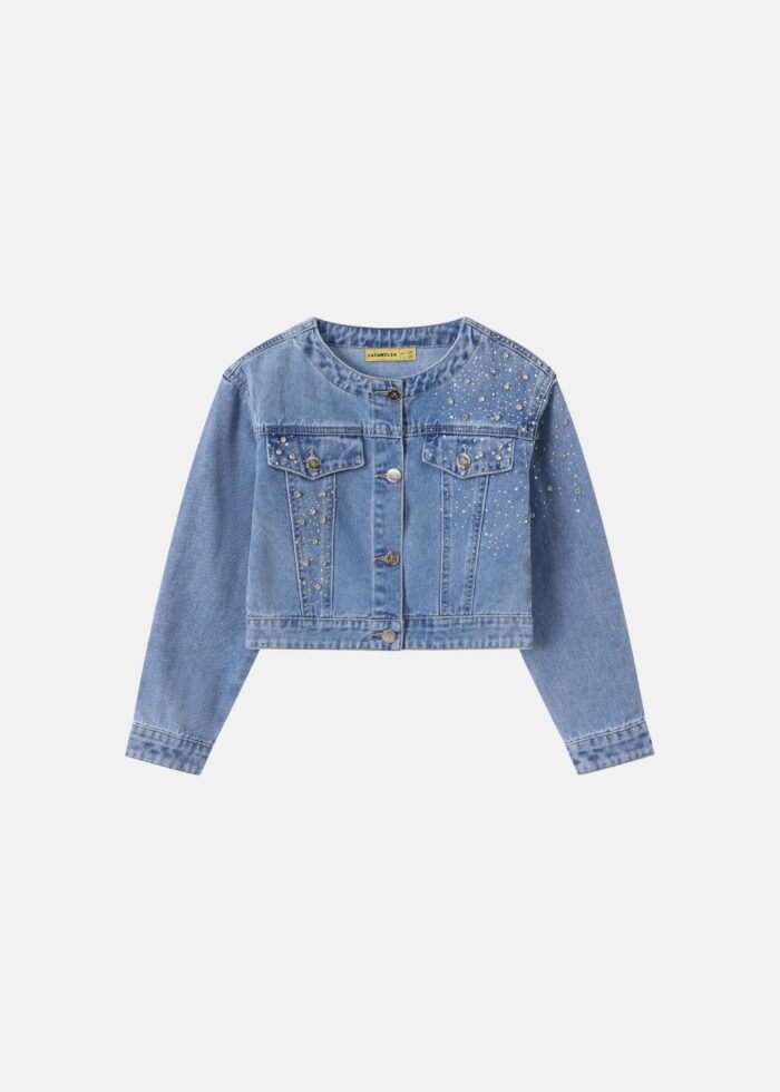 Kids girl jacket, denim, strass decor, round neck, front buttons to close, long sleeves with tight cuff, chest pockets, unique and modern