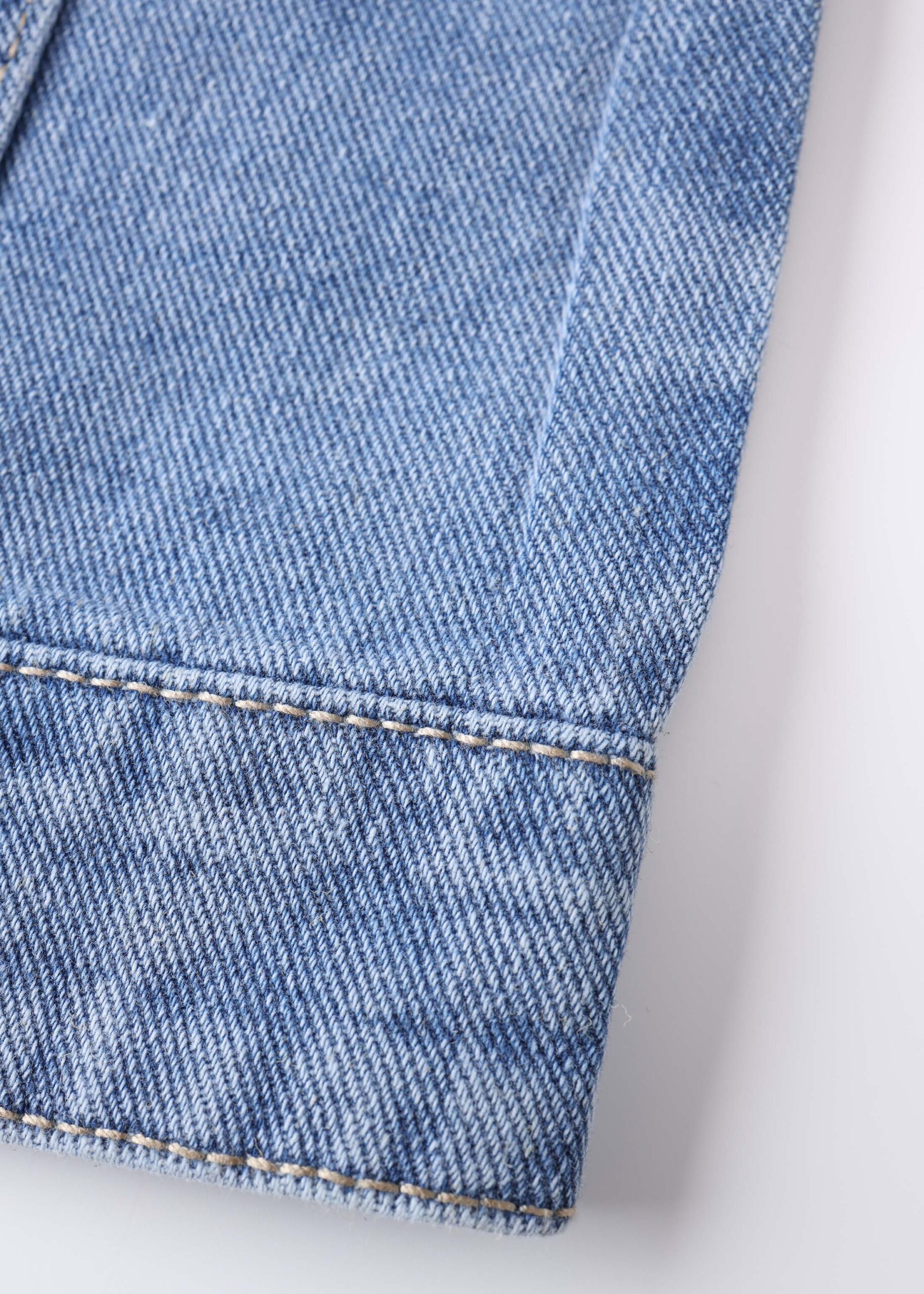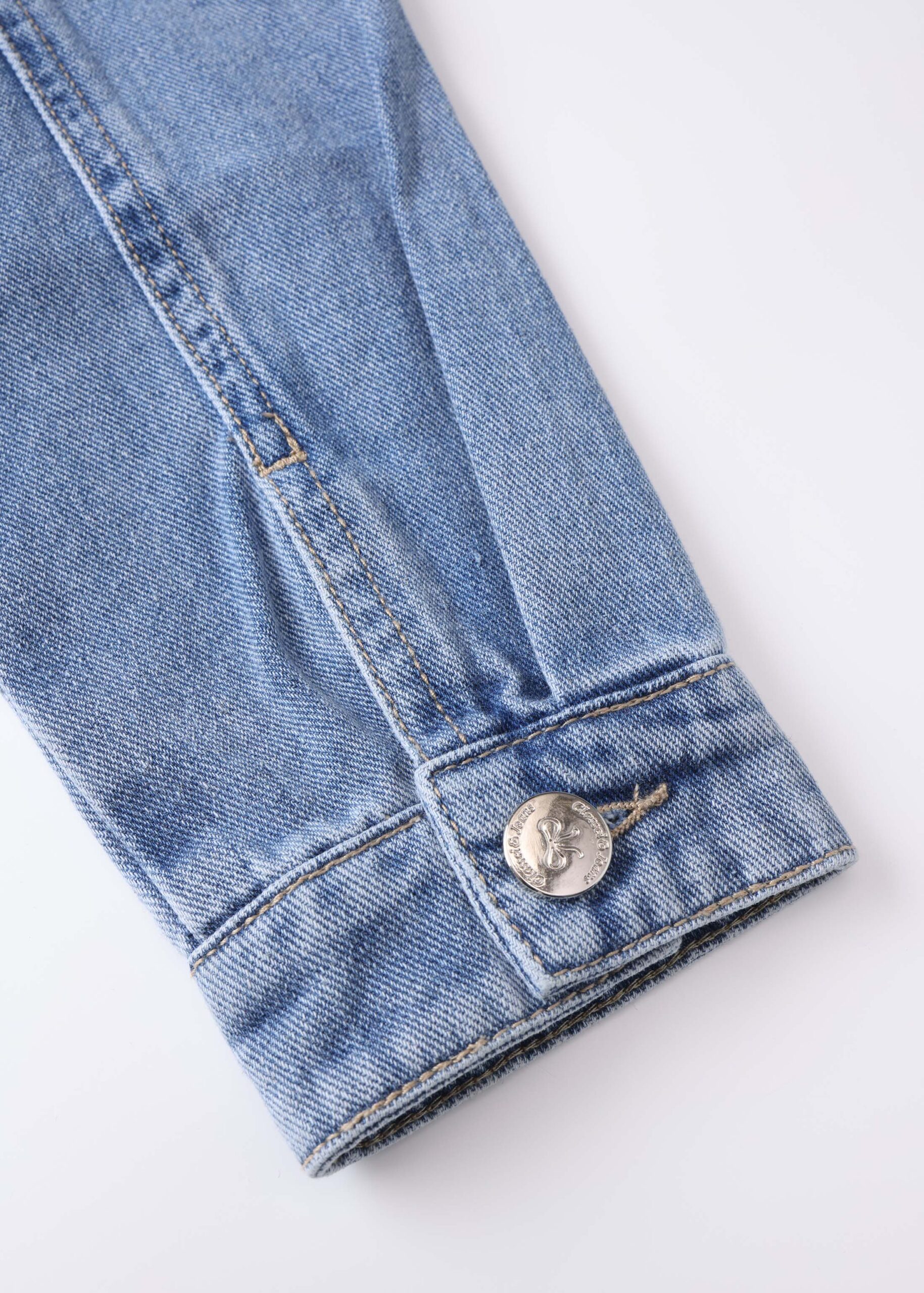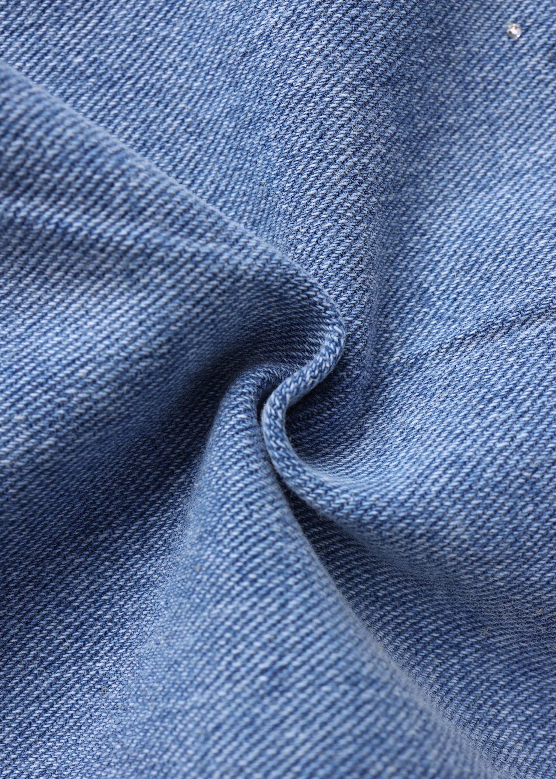 Kids girl jacket, denim, strass decor, round neck, front buttons to close, long sleeves with tight cuff, chest pockets, unique and modern