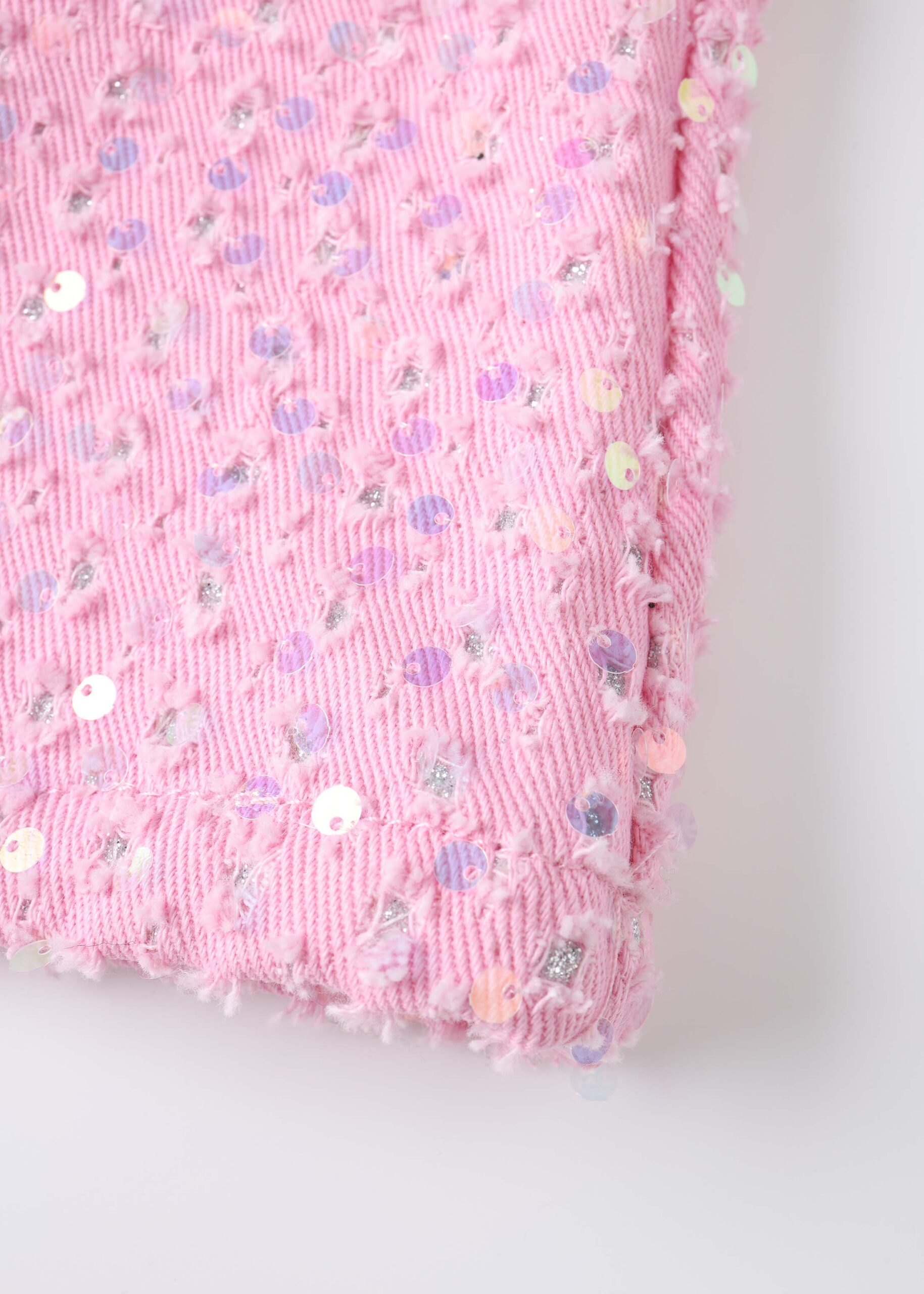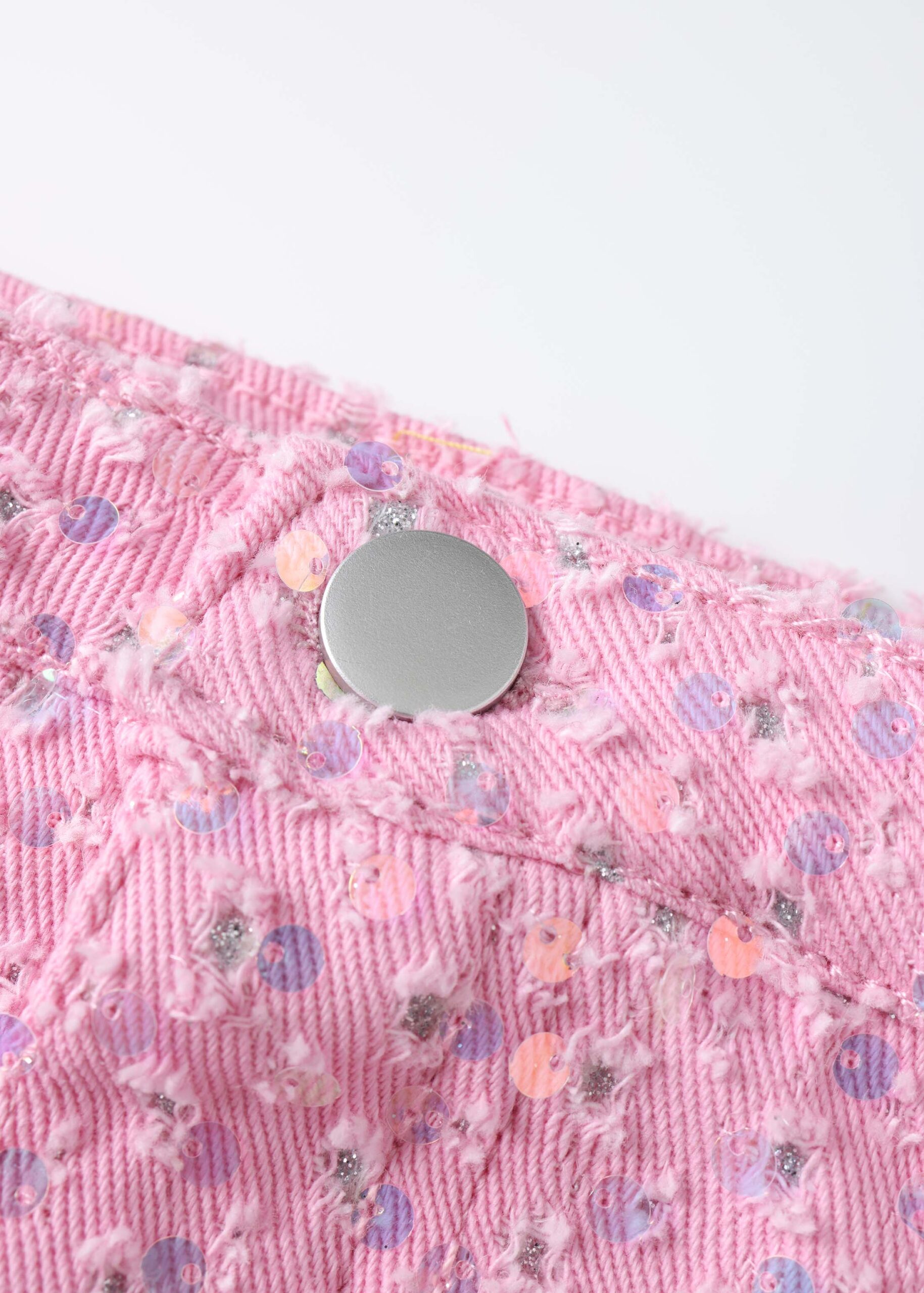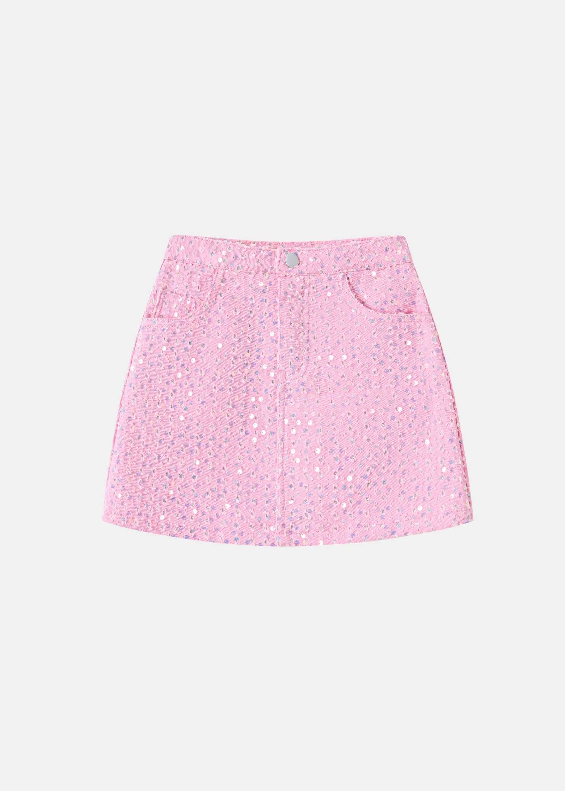 Kids girl skirt, short, denim with sequin decor, front button and zipper closure, front pockets, unique and modern