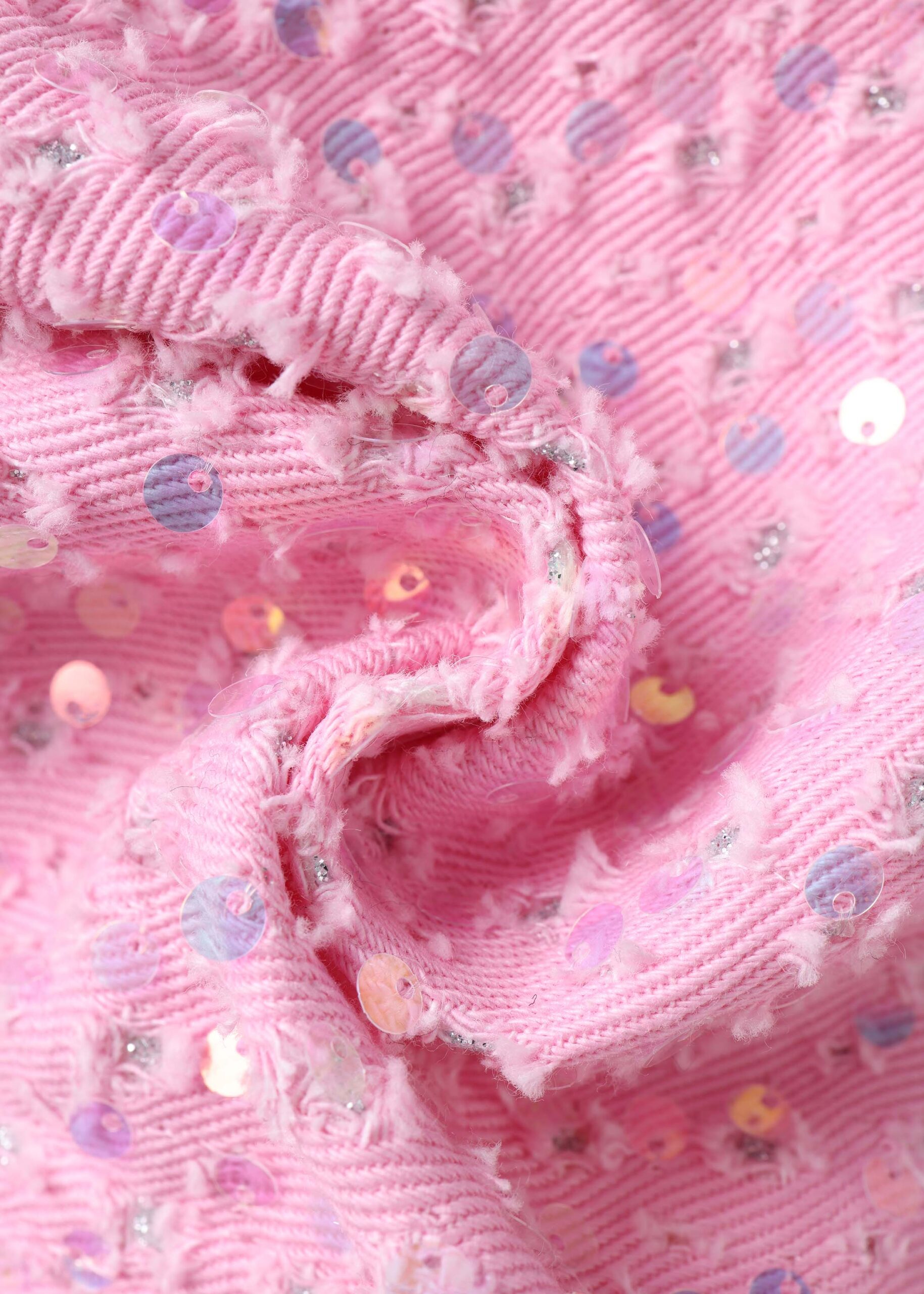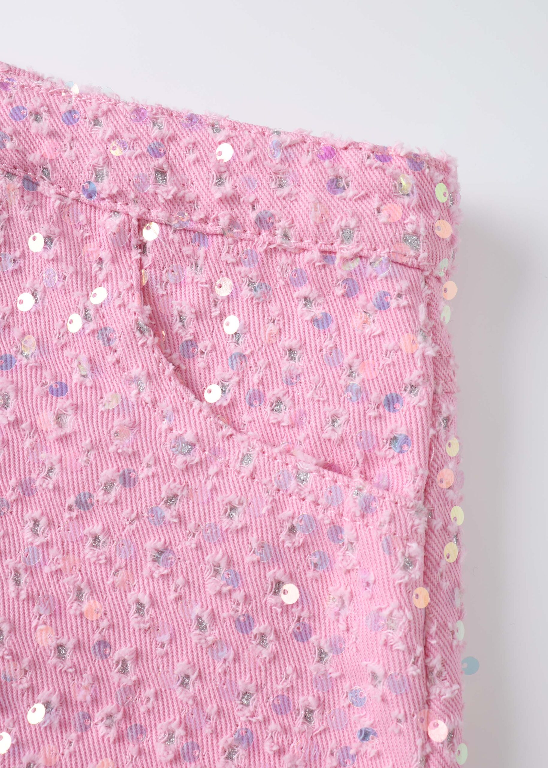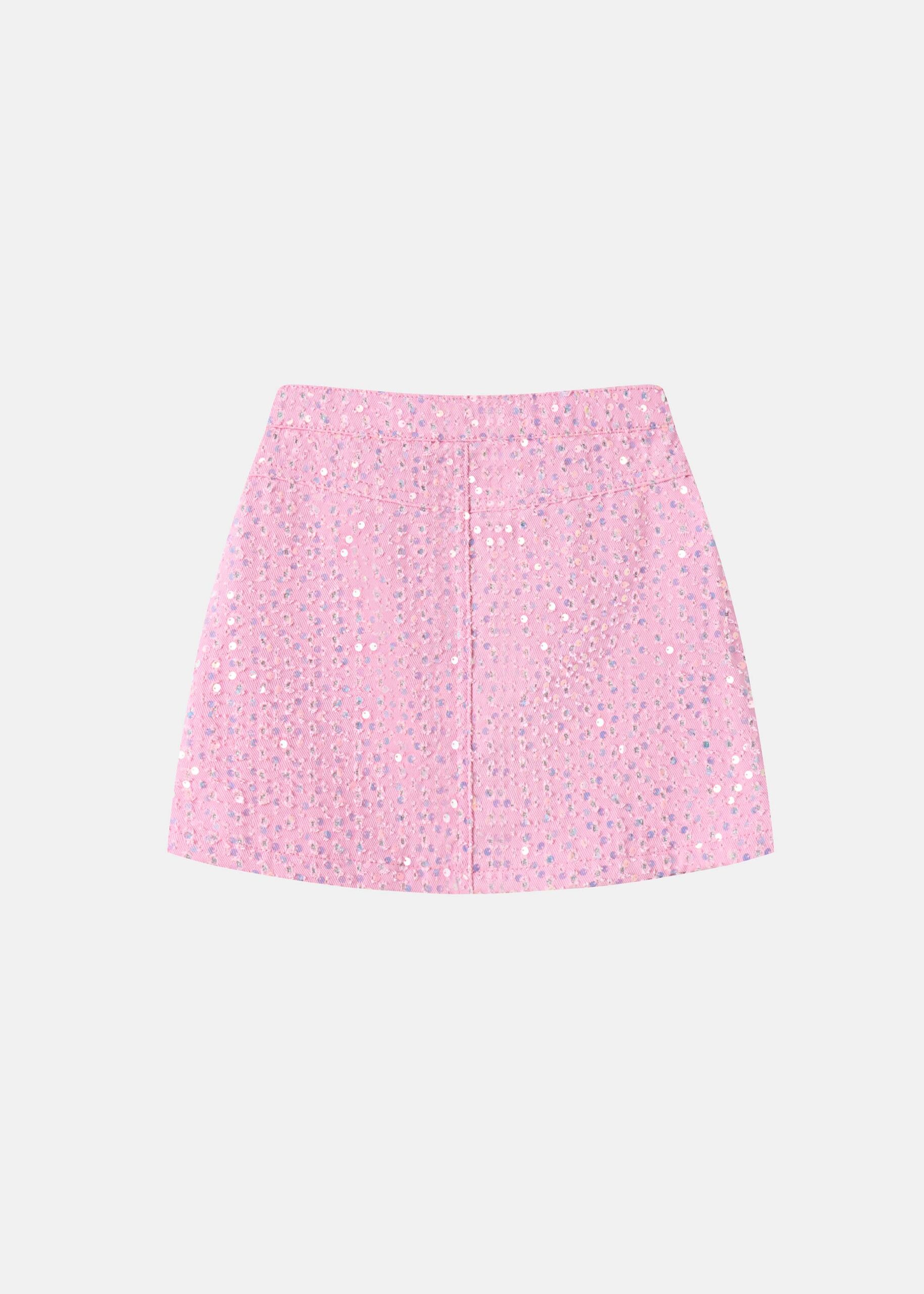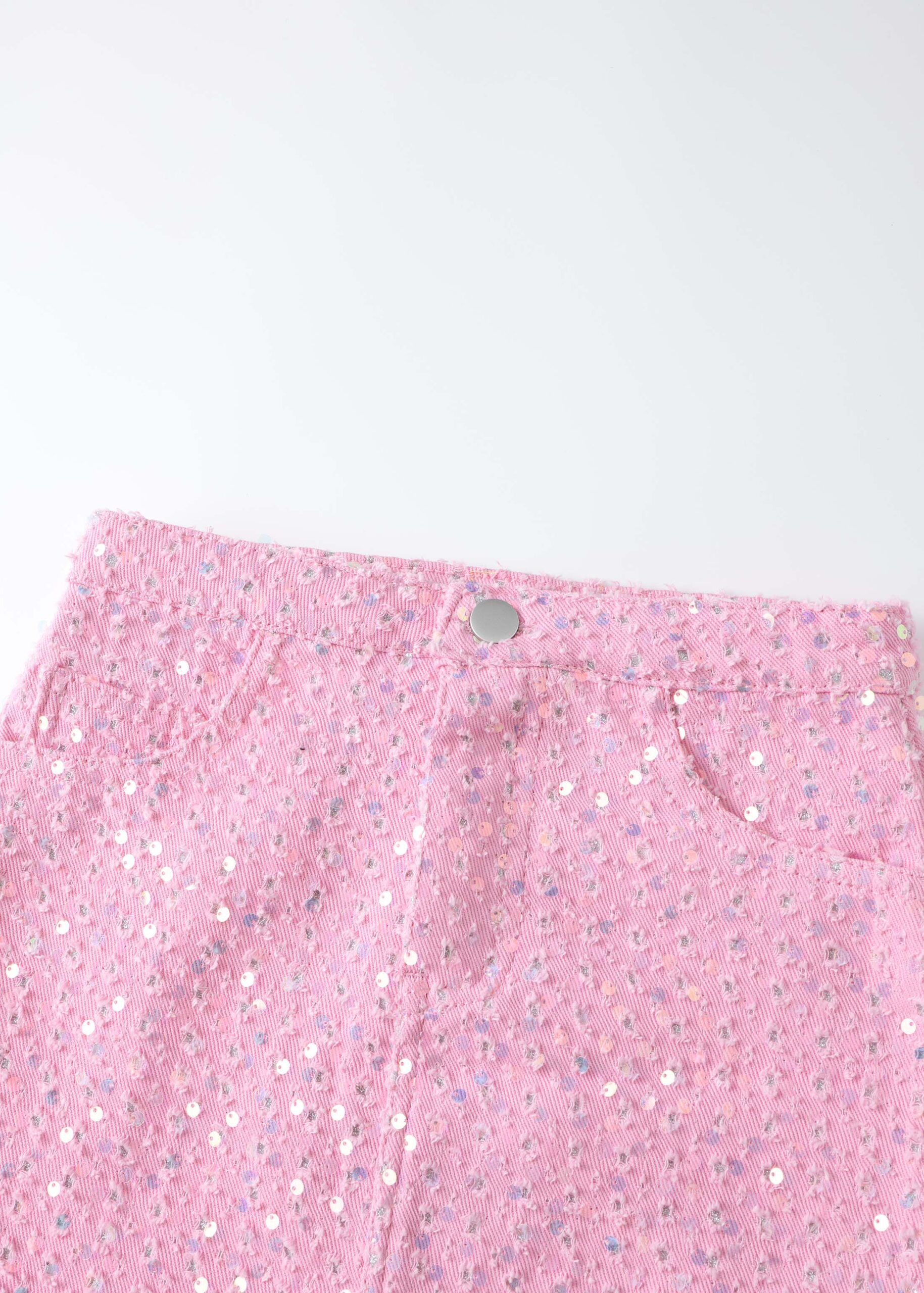 Kids girl skirt, short, denim with sequin decor, front button and zipper closure, front pockets, unique and modern