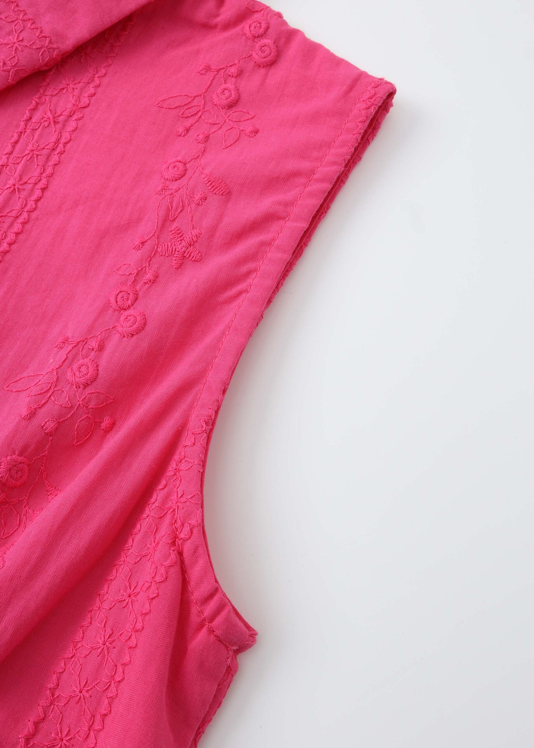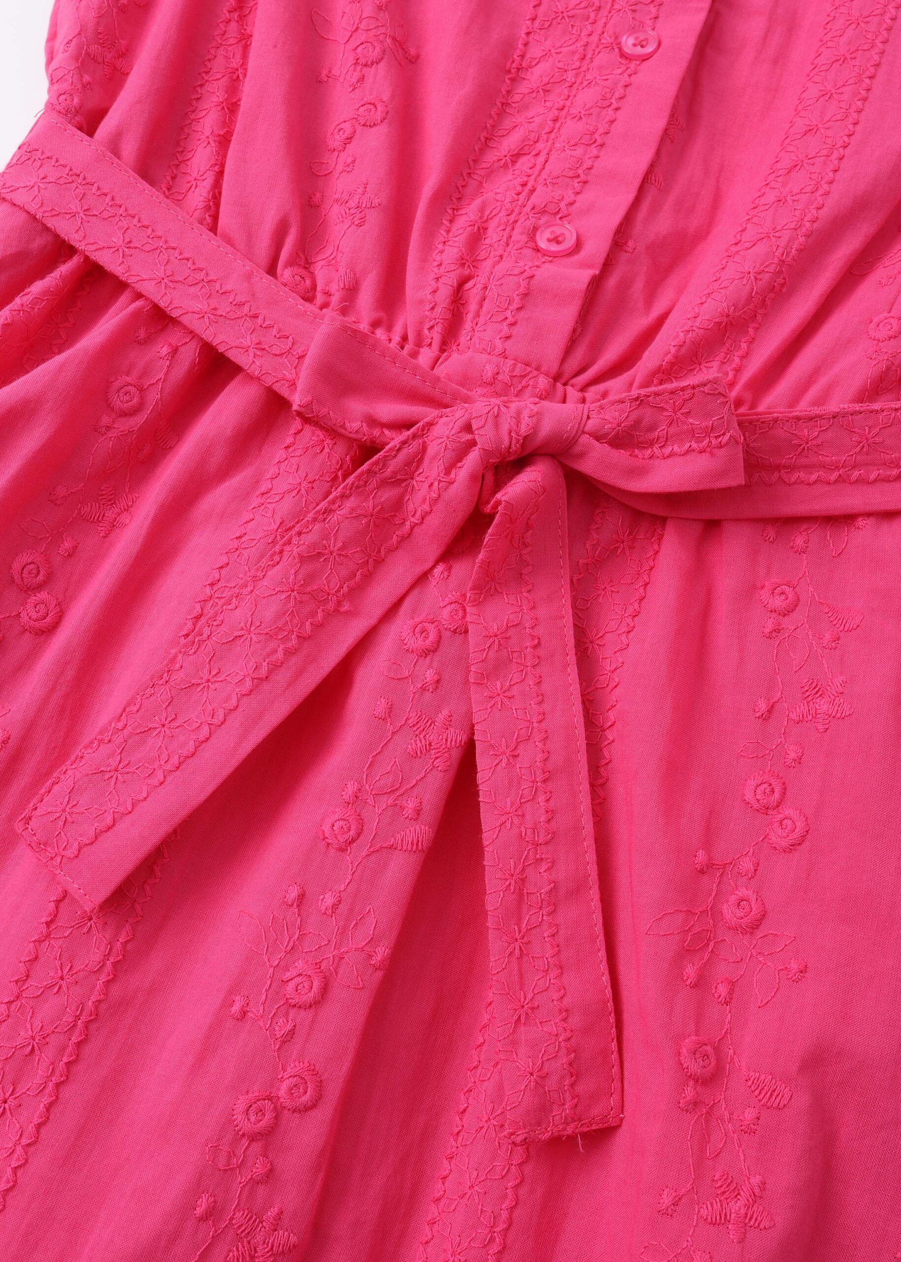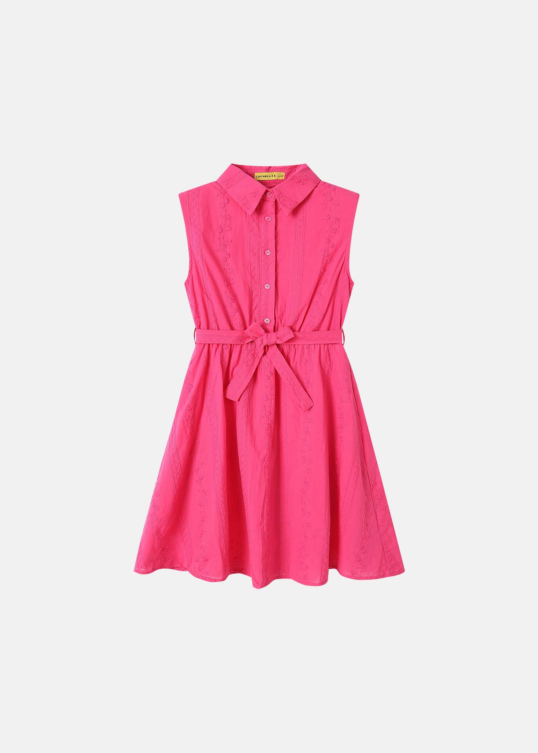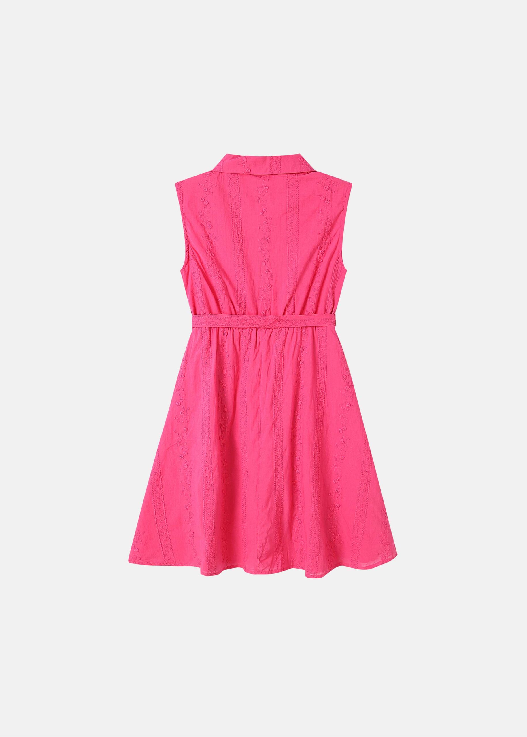 Kids girl dress, short, embroidered, rolled collar, front buttons, pleated waist with belt, sleeveless, unique and modern