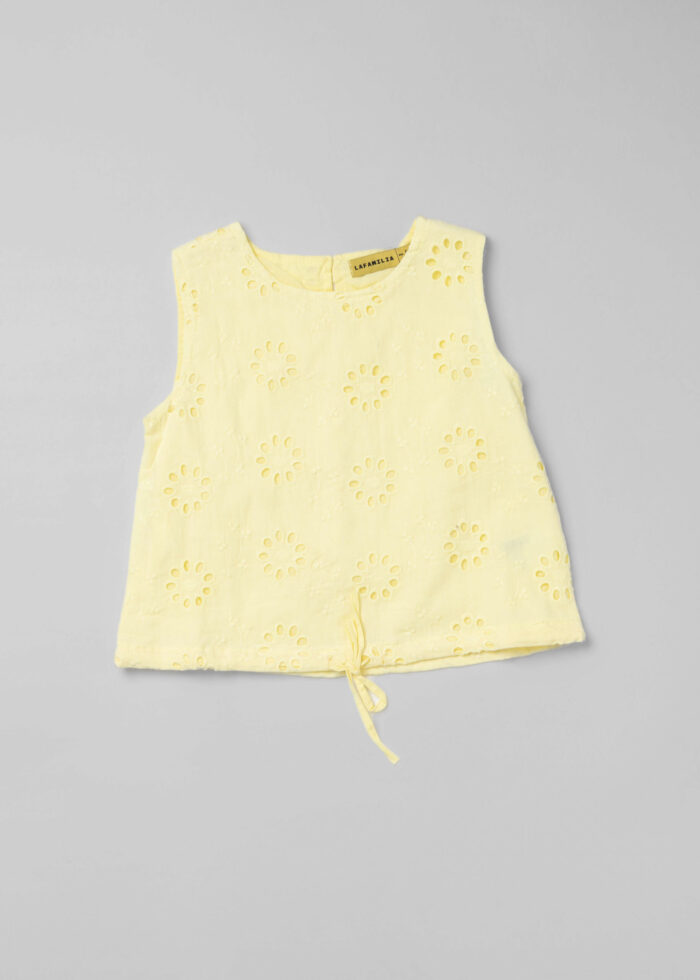Kids girl blouse, embroidery design, round neck with back button, sleeveless, front tie, unique and modern