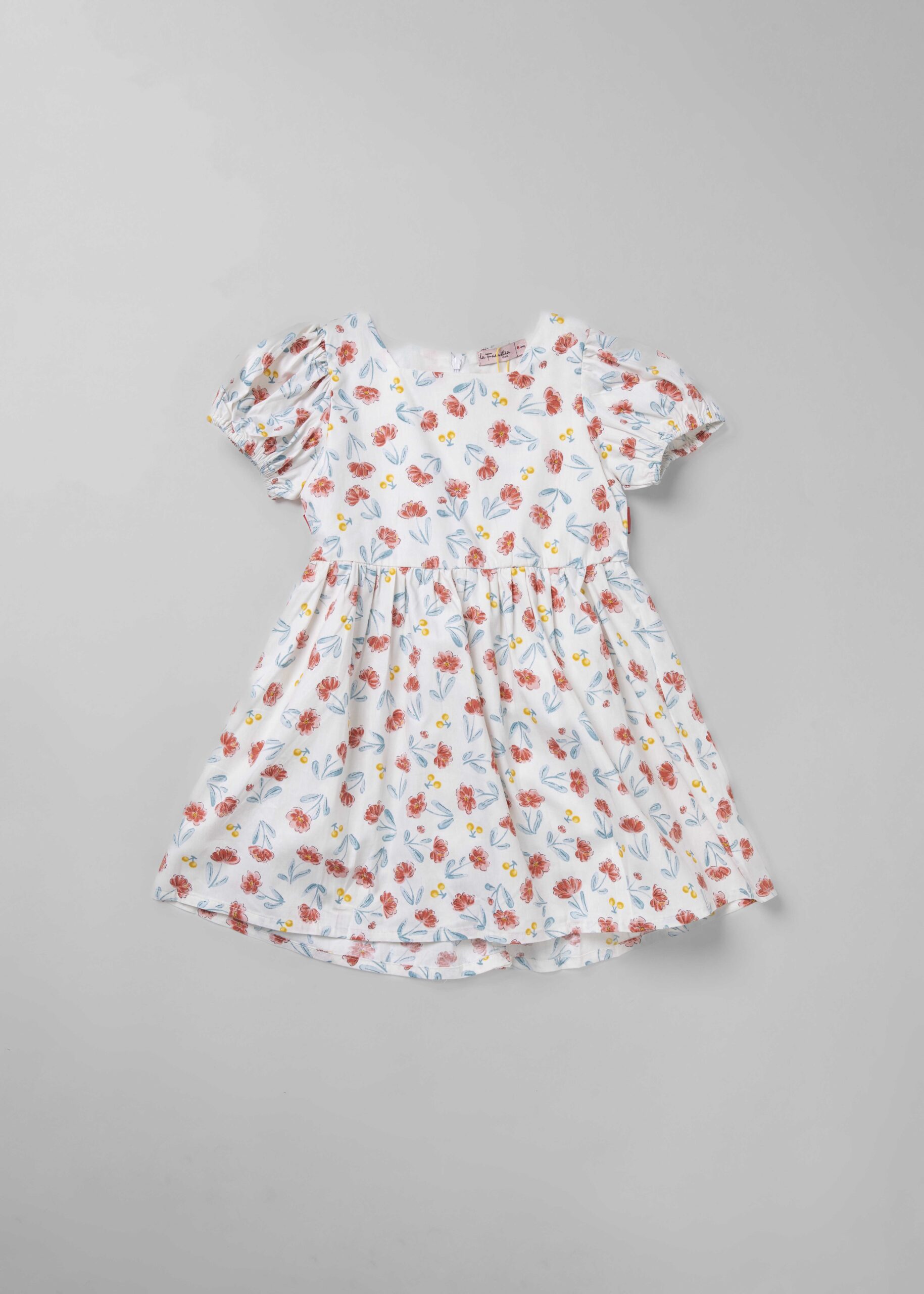 Kids girl dress, floral, pleated waist, round neck with back zipper closure, short sleeves, back tie, unique and modern
