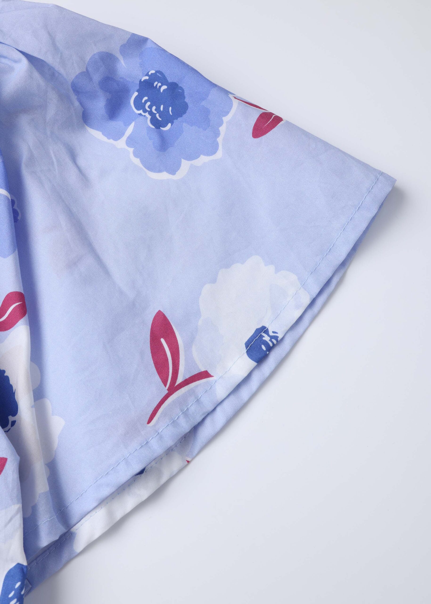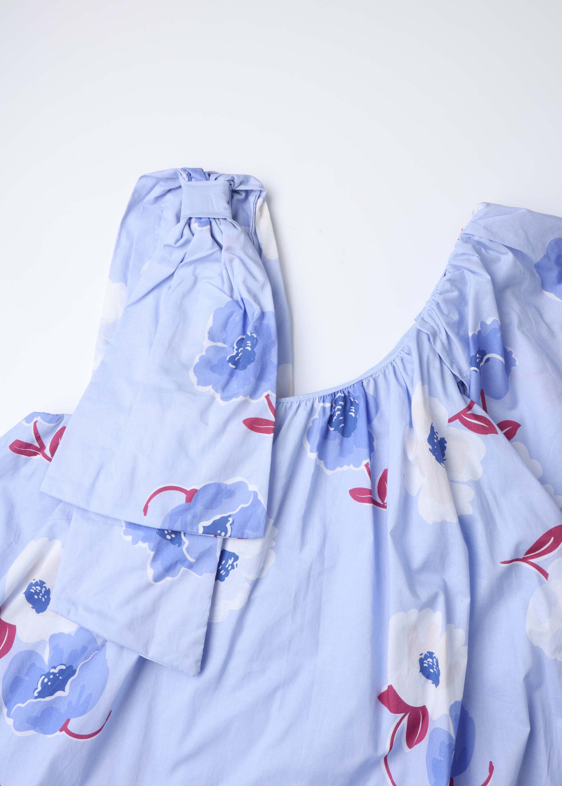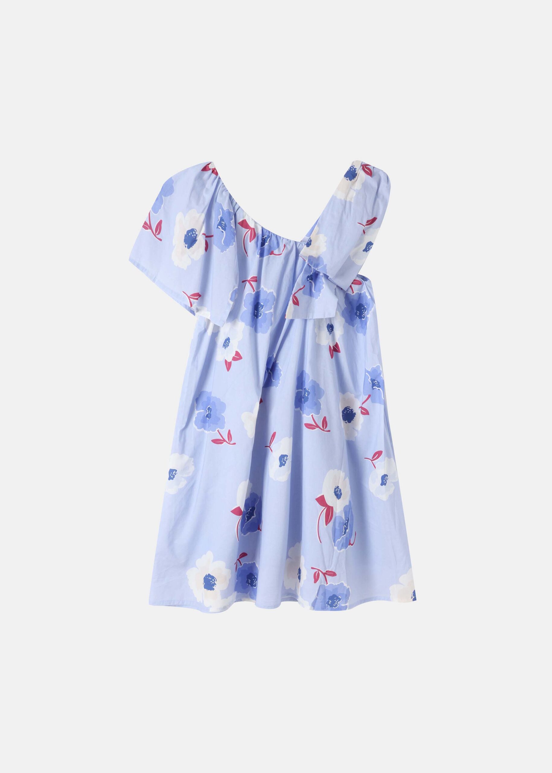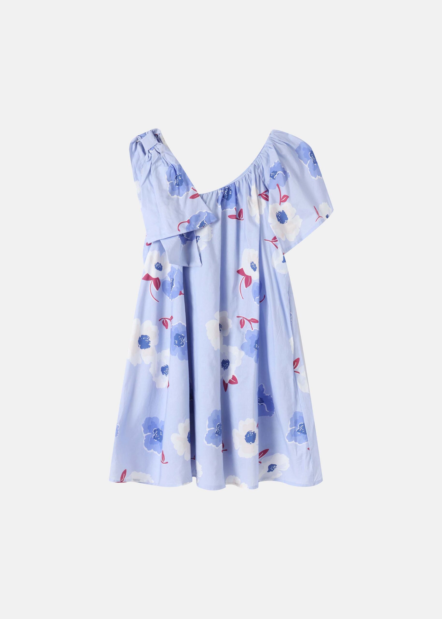 Kids girl dress, short, floral, assymetrical neckline, one shoulder with bow decor while the other side simple short sleeve, unique and modern