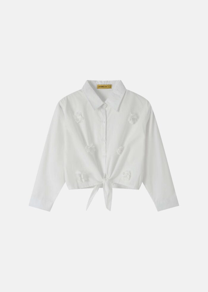 Kids girl shirt, flowers decor, rolled collar, front buttons to close, long sleeves with tight cuff, front tie, unique and modern