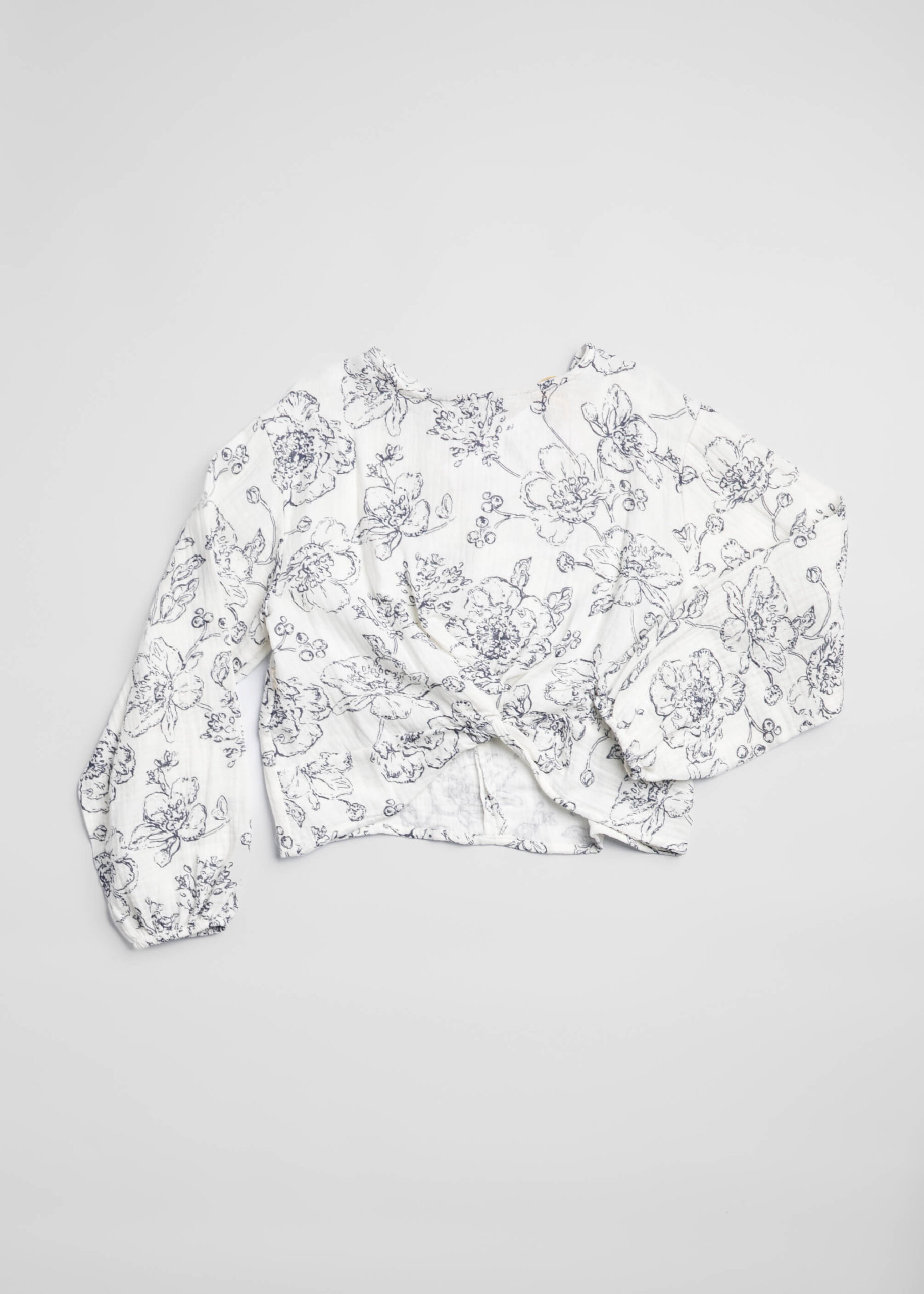 Kids girl blouse, flowers decor, round neck, long sleeves with tight cuff, wrap design from the front, unique and modern