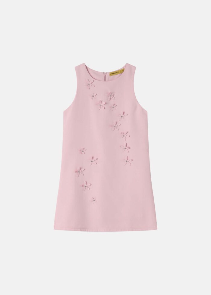Kids girl dress, short, round neck with back zipper closure, sleeveless, flowers decor, unique and modern