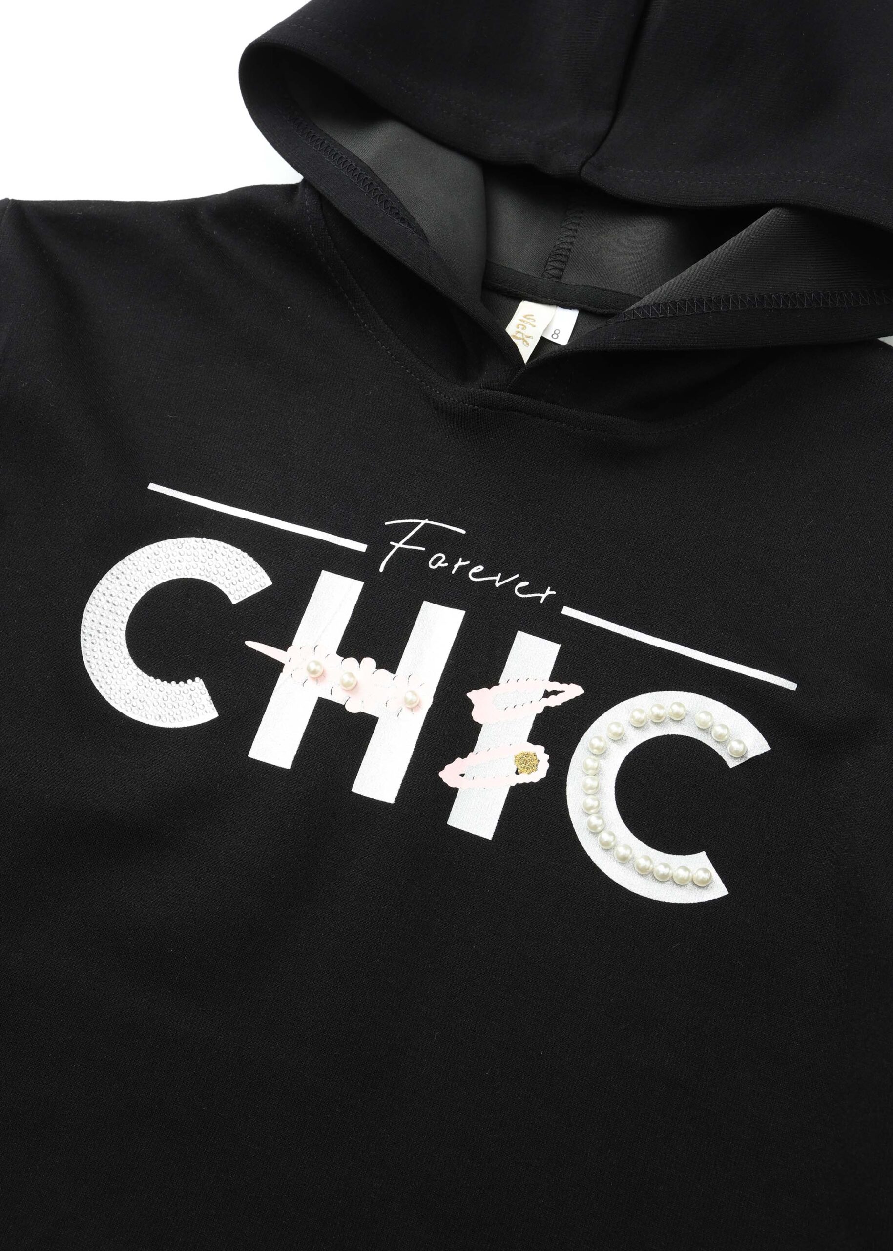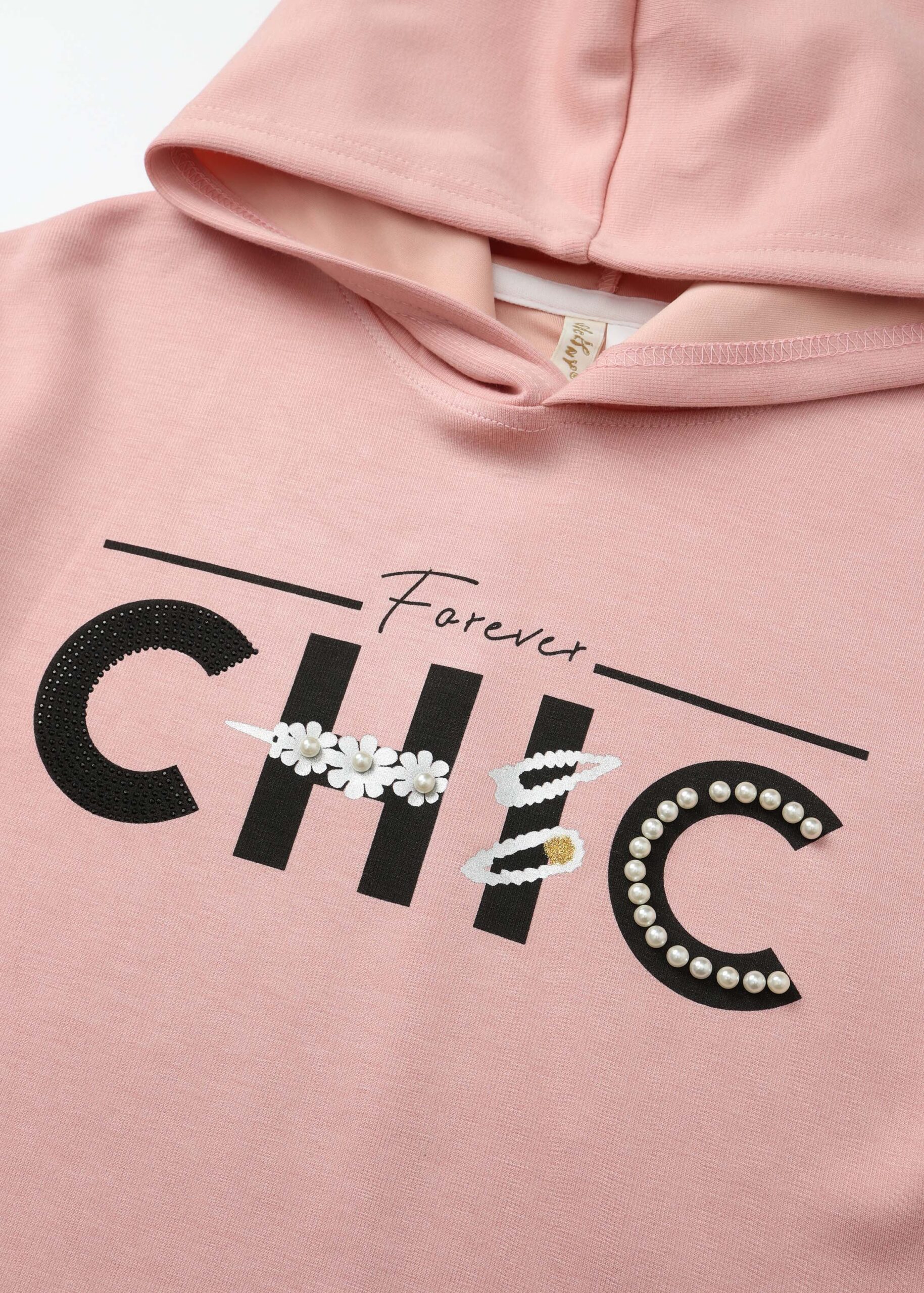 Kids girl hoodie, “Forever Chic” printed from the front with flowers decor, hood, long sleeves, unique and practical