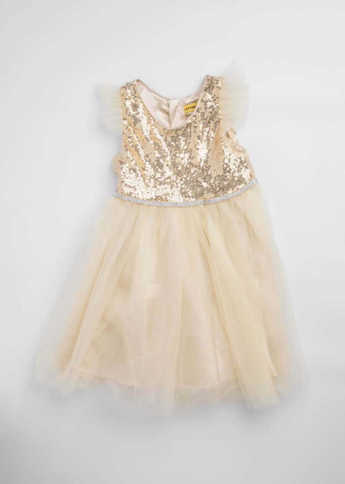Kids girl dress, glittery decor, round neck, back zipper closure, sleeveless, ruffled shoulder, tulle skirt, unique and modern