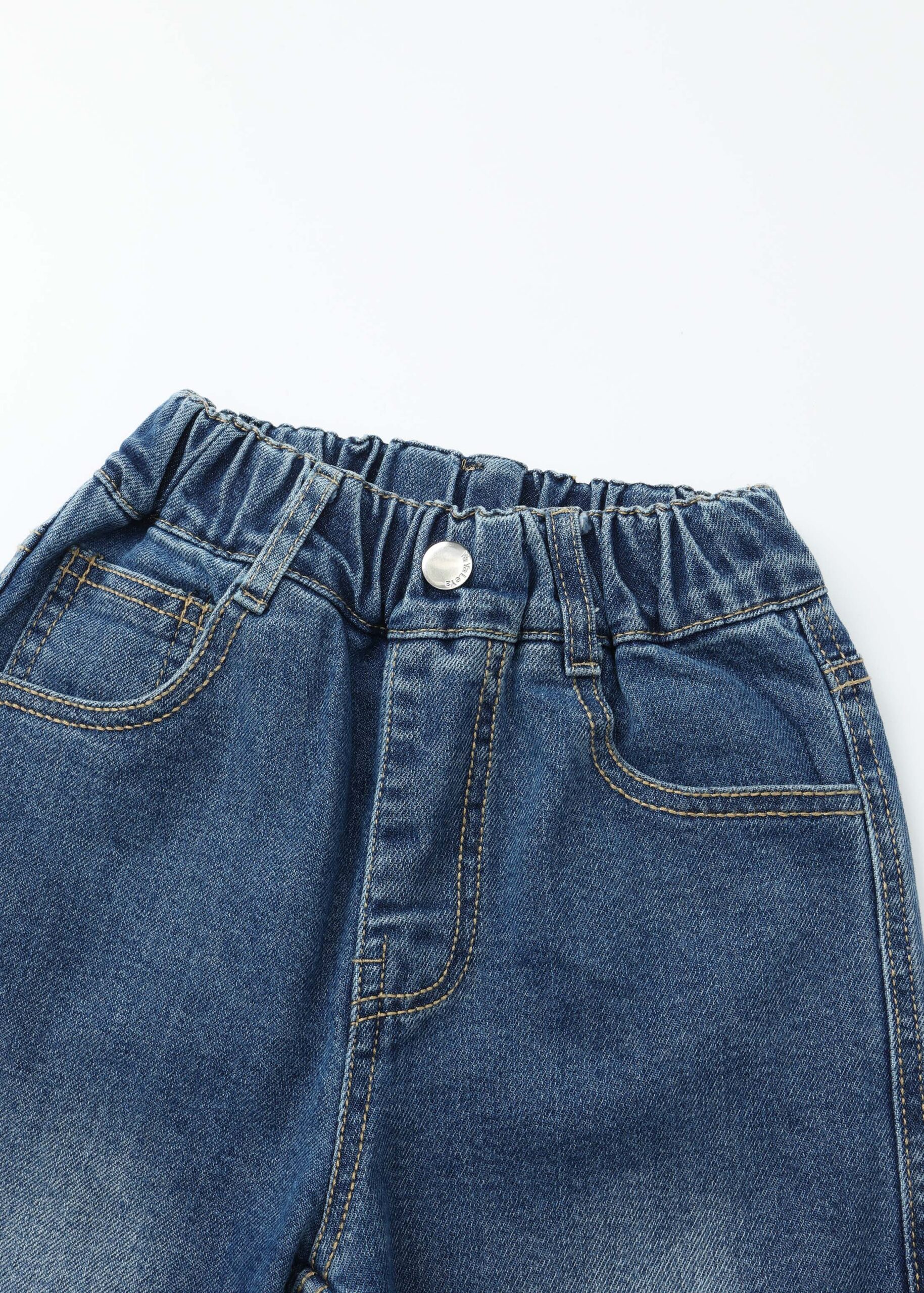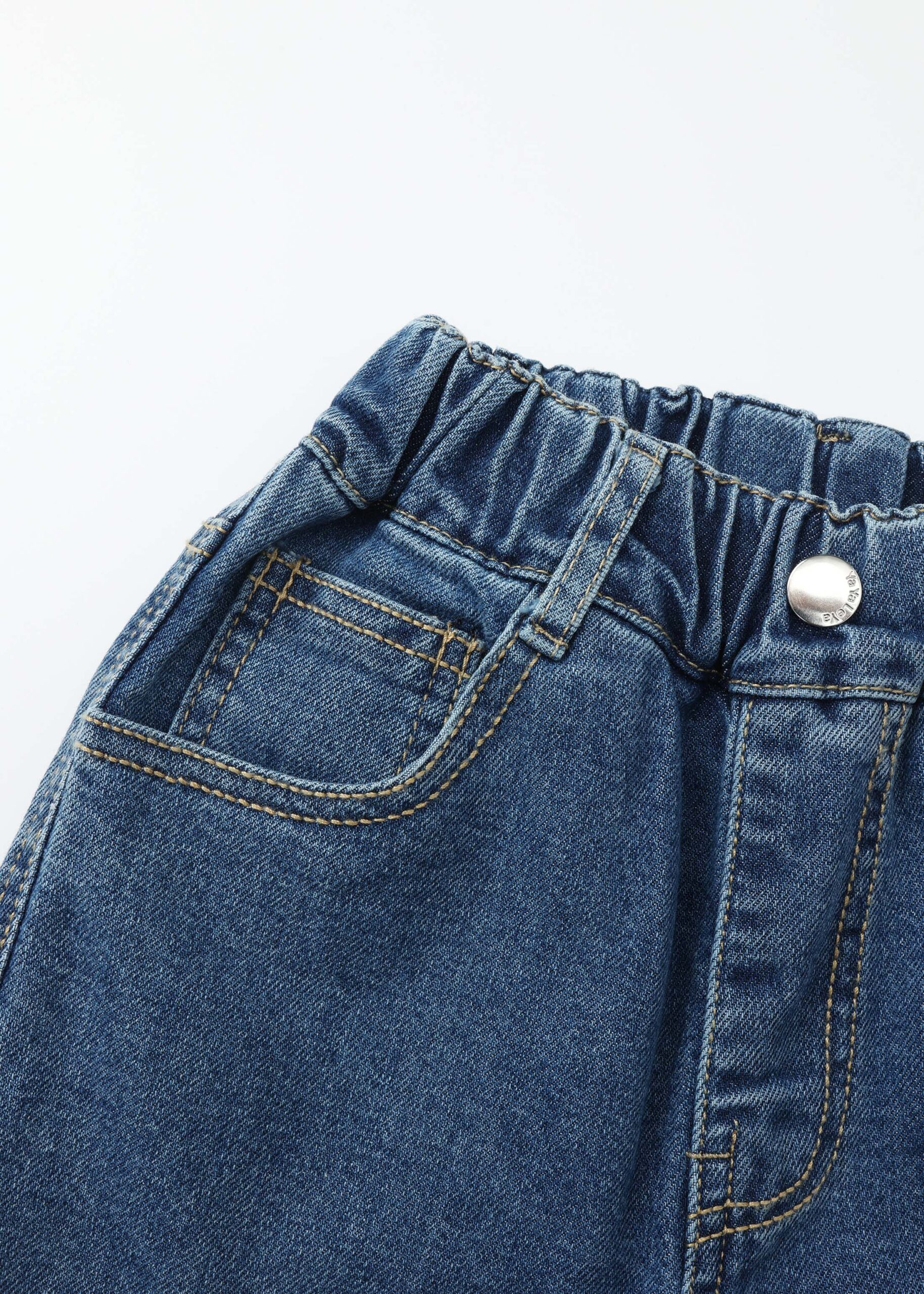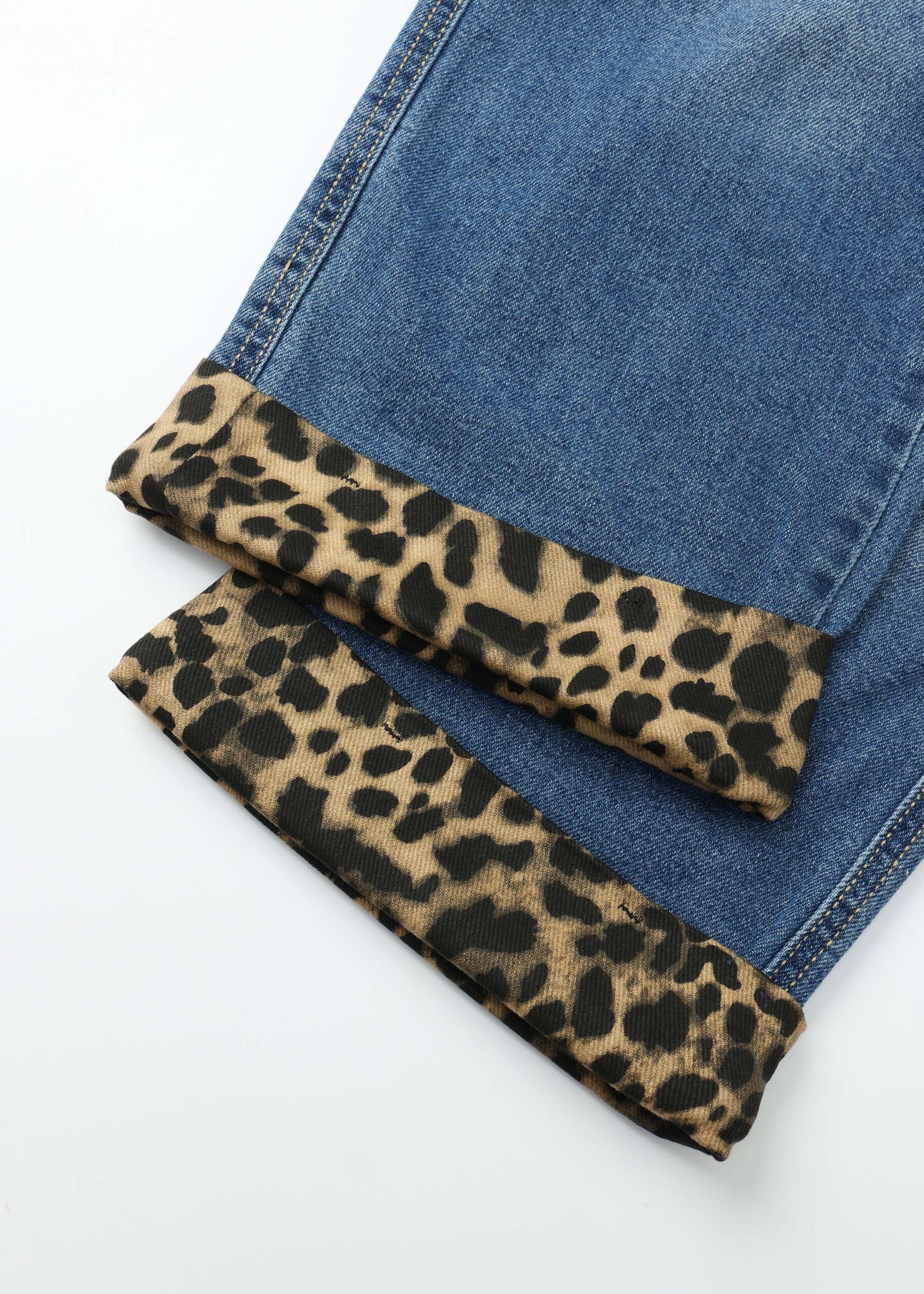Kids girl trouser, jeans, elastic waist, front button and zipper closure, front and back pockets, rolled with cheetah printed decor, unique and modern
