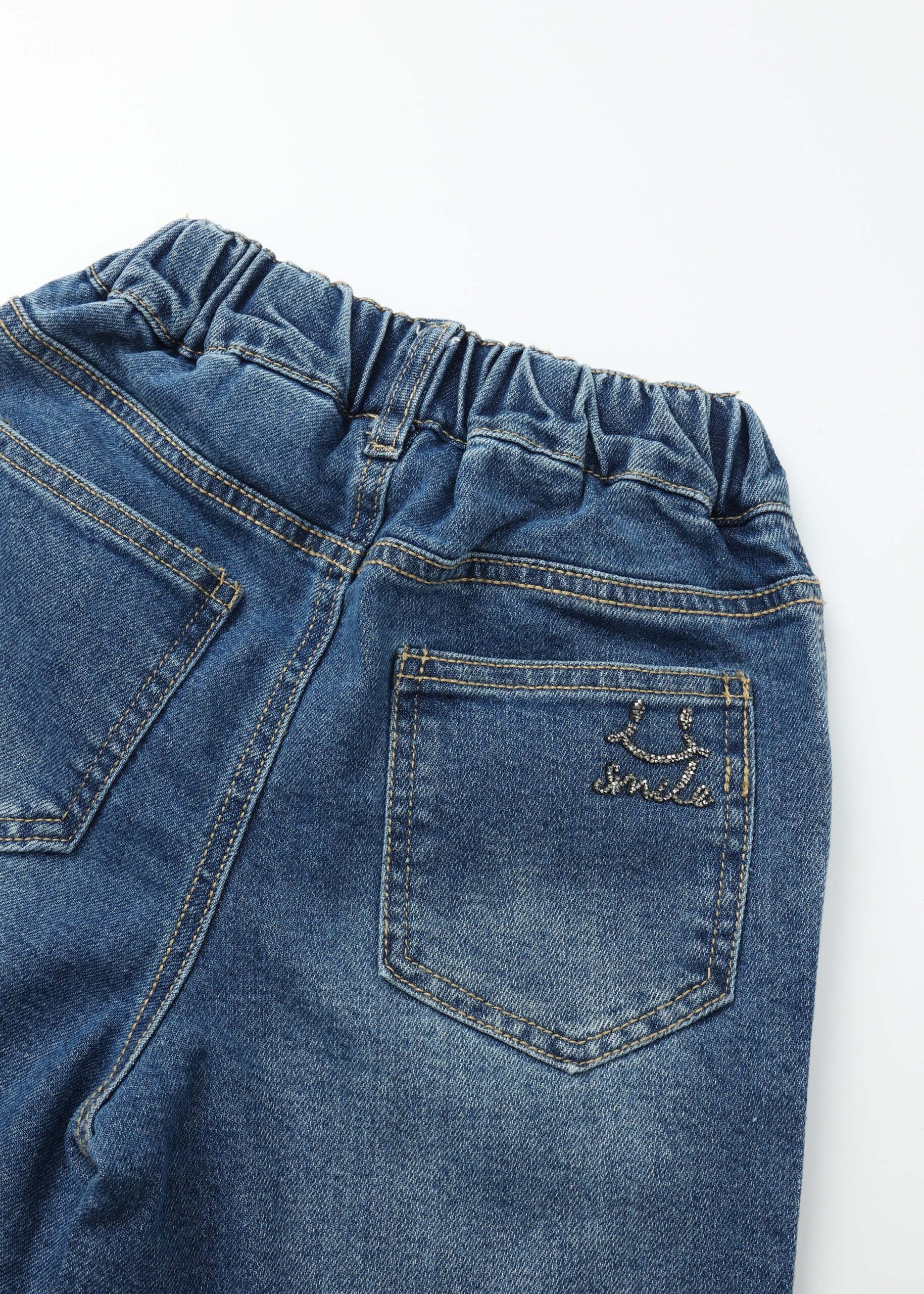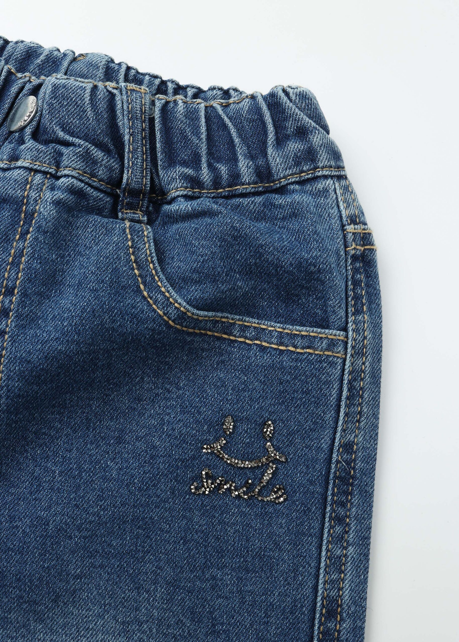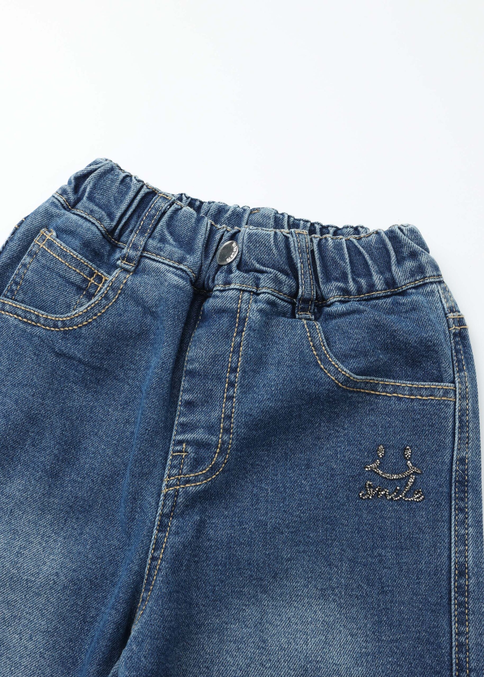Kids girl trouser, jeans, elastic waist, front button and zipper closure, front and back pockets, “Smile” with strass decor, unique and modern