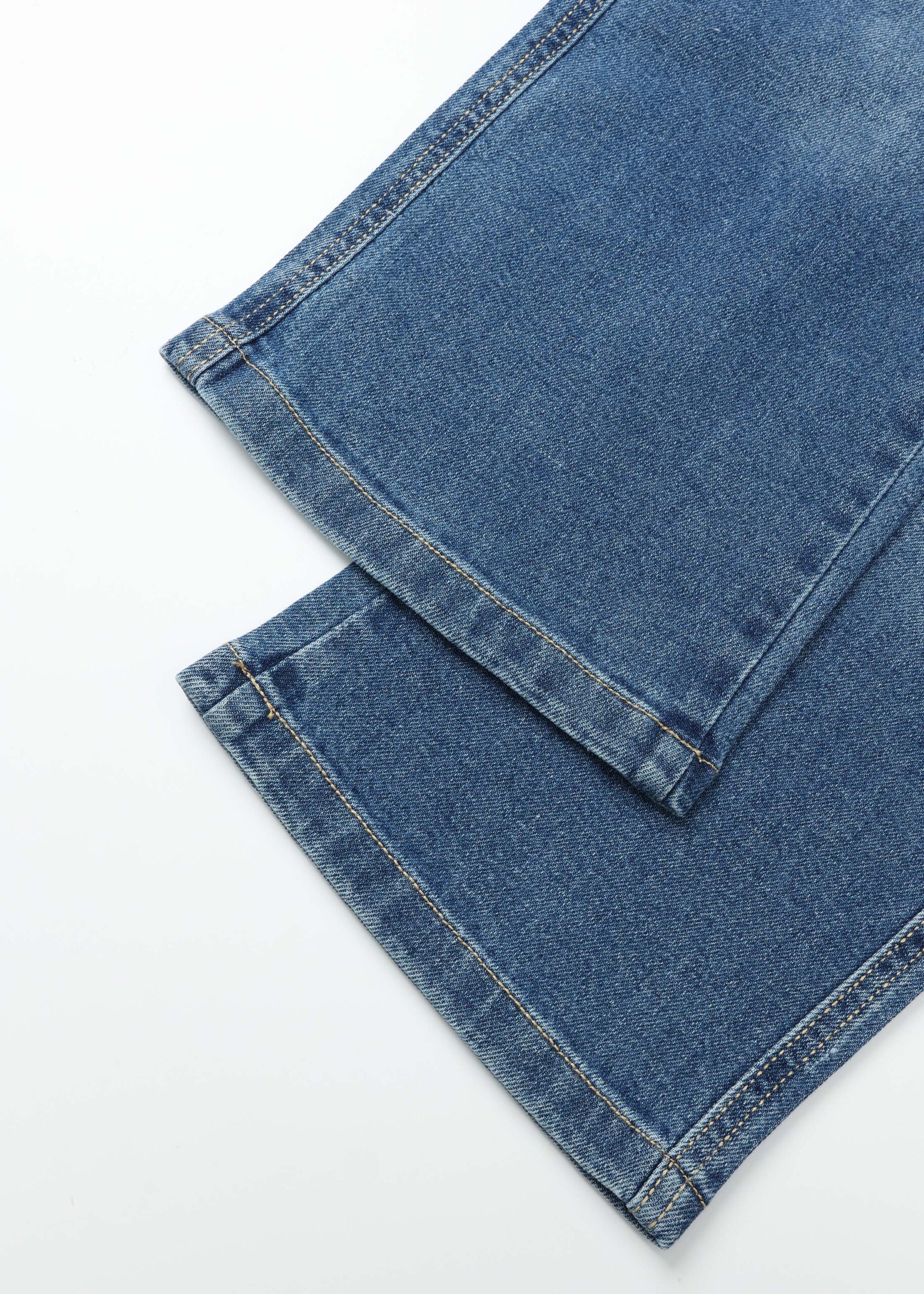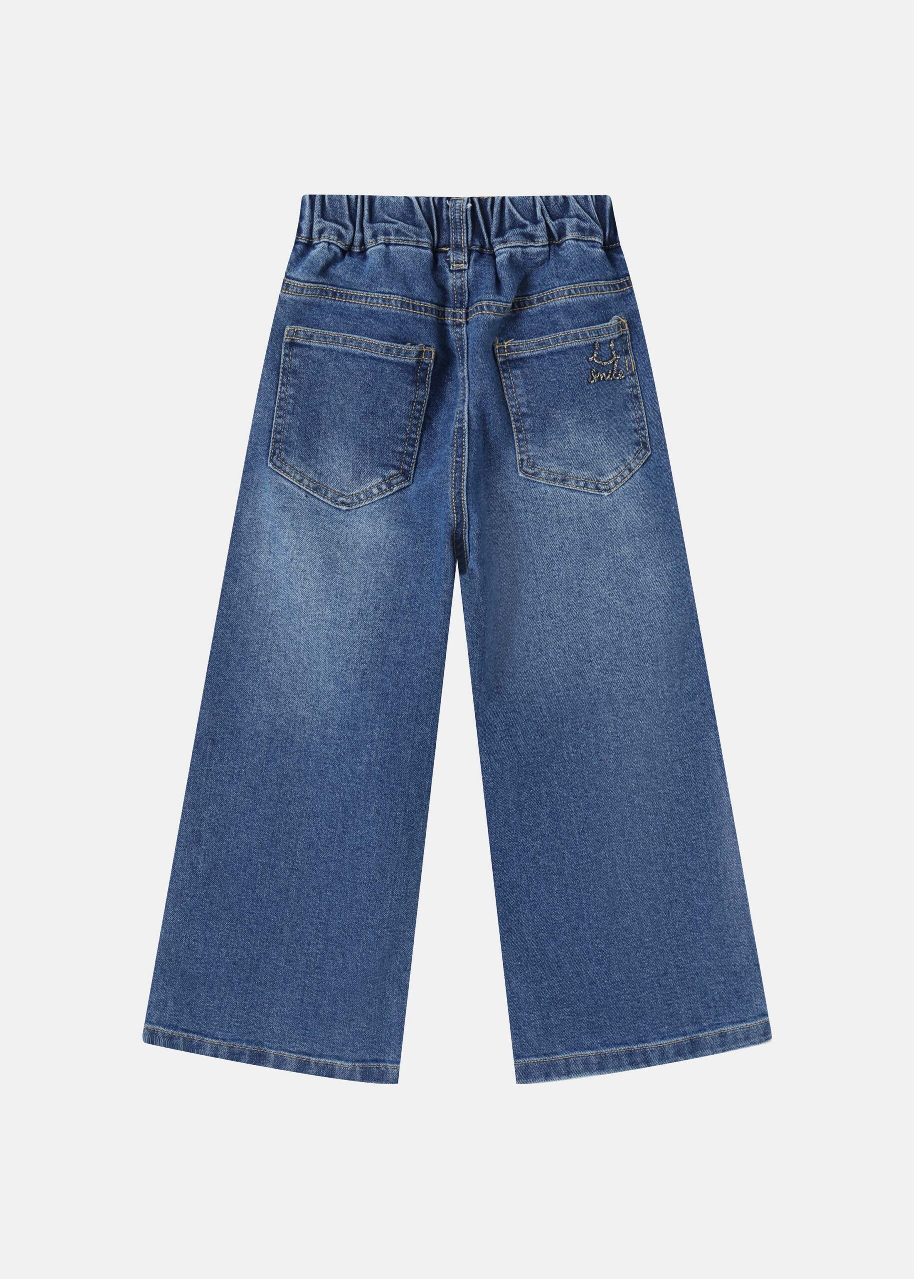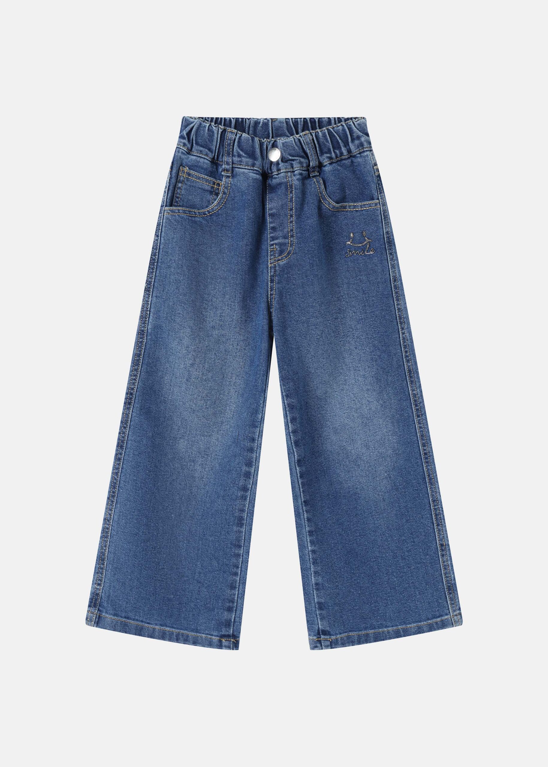 Kids girl trouser, jeans, elastic waist, front button and zipper closure, front and back pockets, “Smile” with strass decor, unique and modern