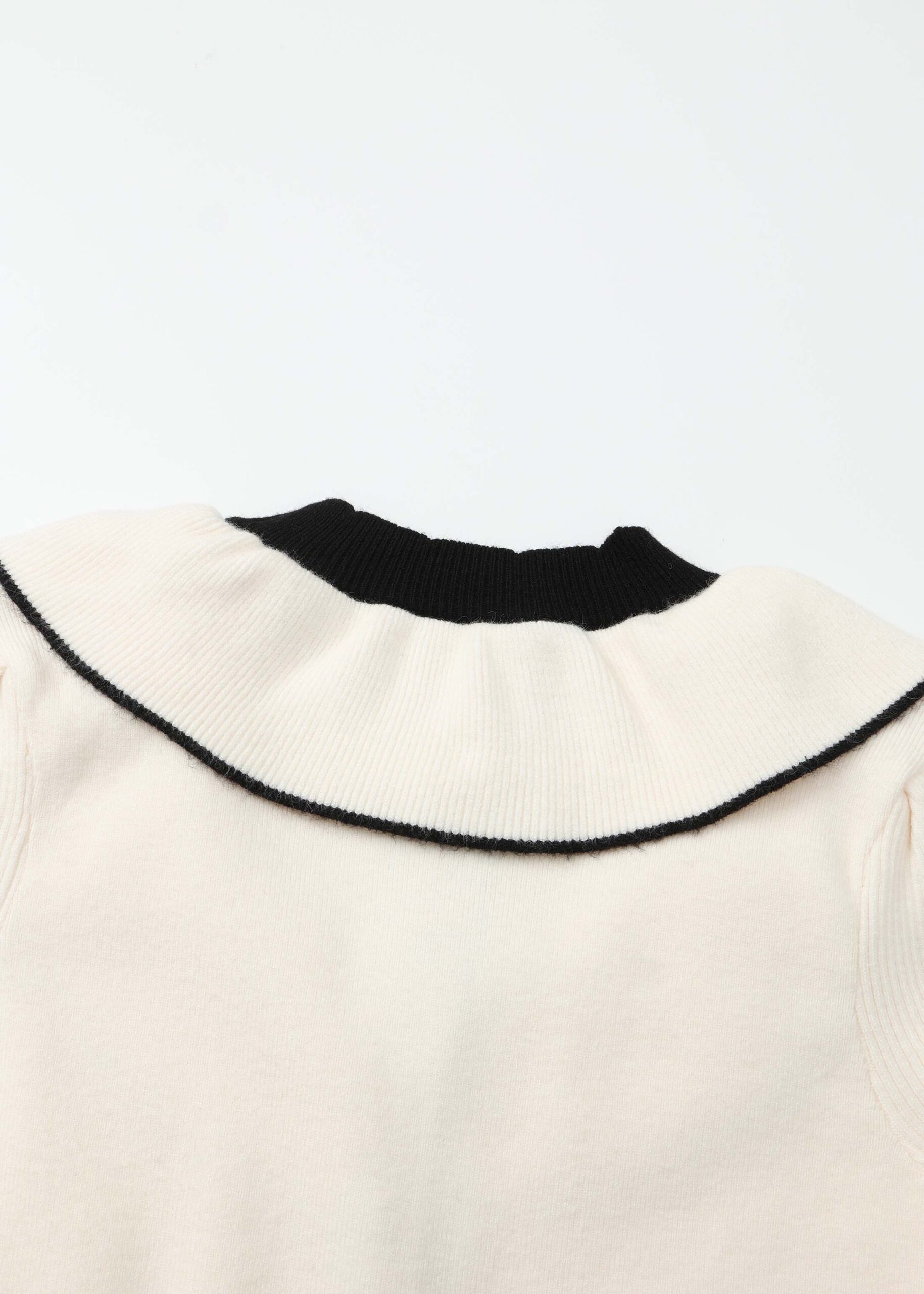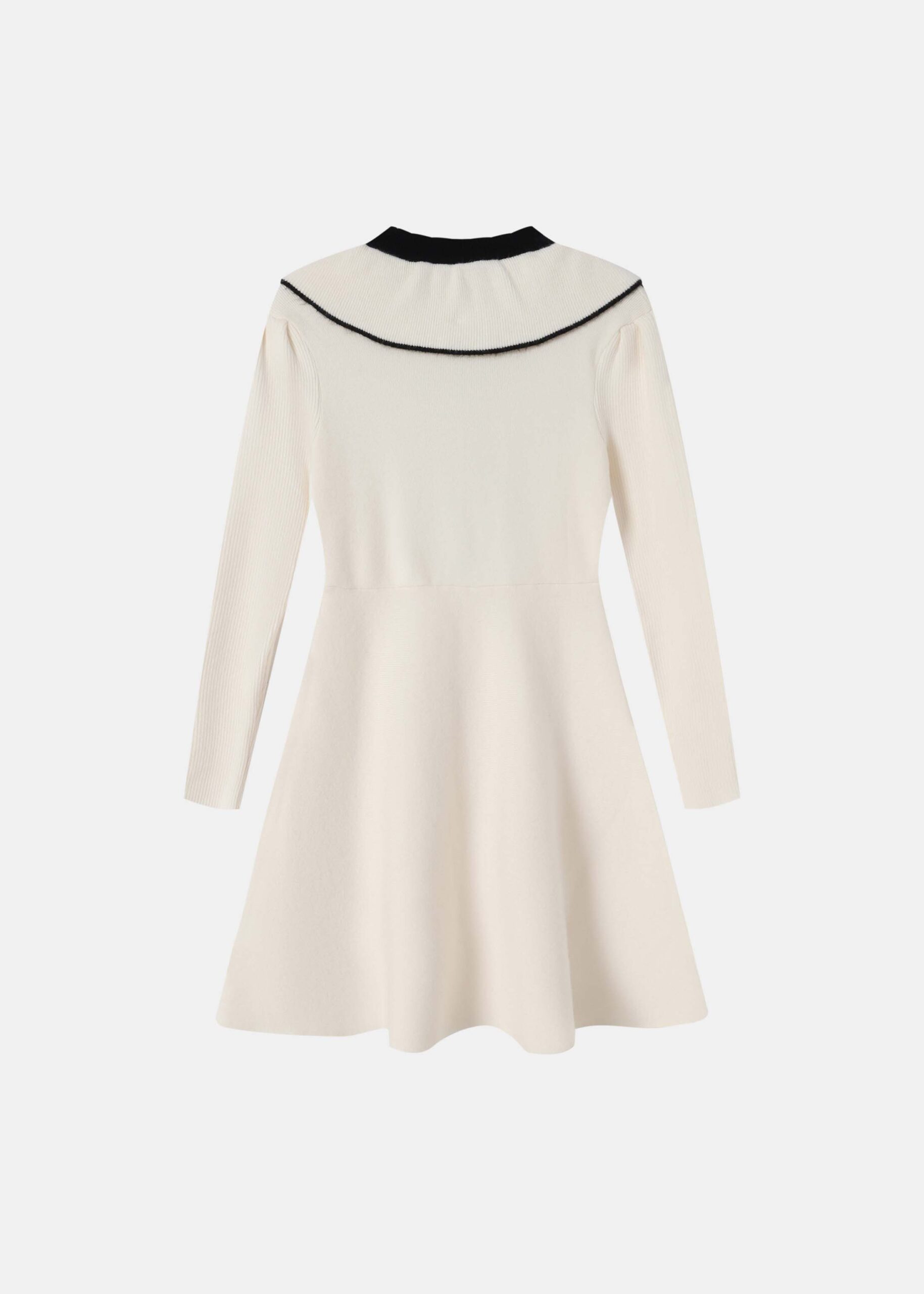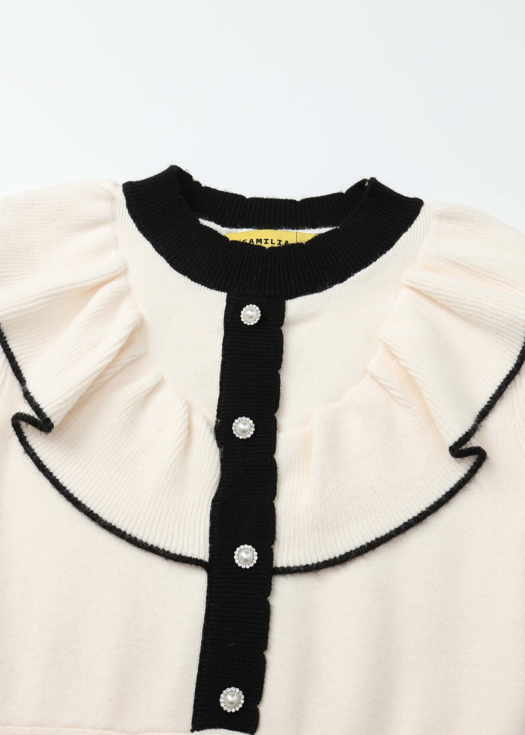 Kids girl dress, knitted fabric, short, round neck, front fake buttons, ruffled decor, long sleeves, unique and modern