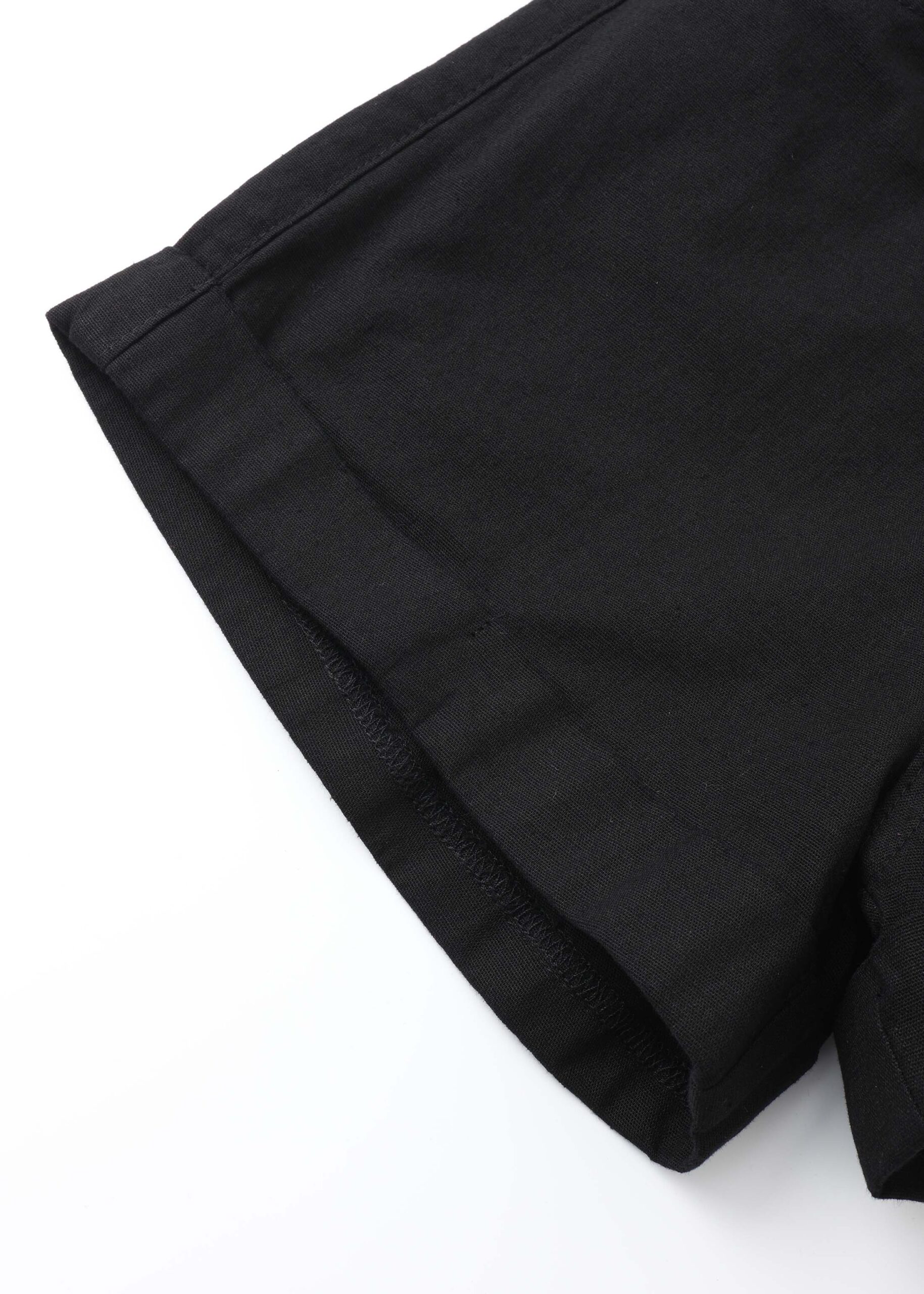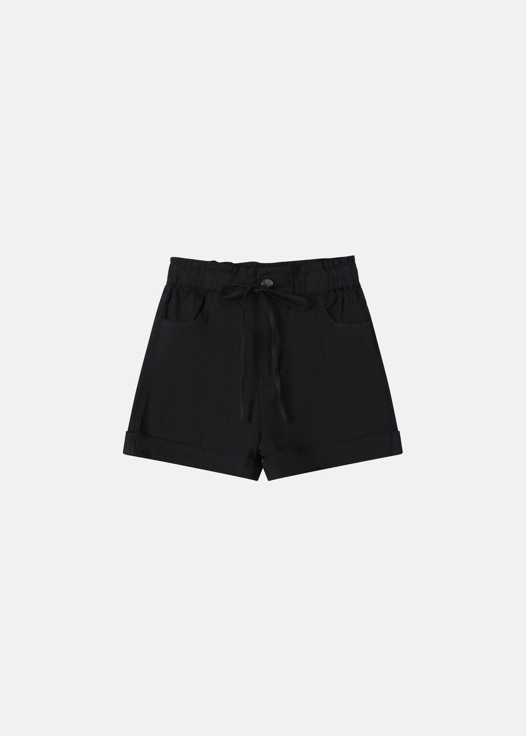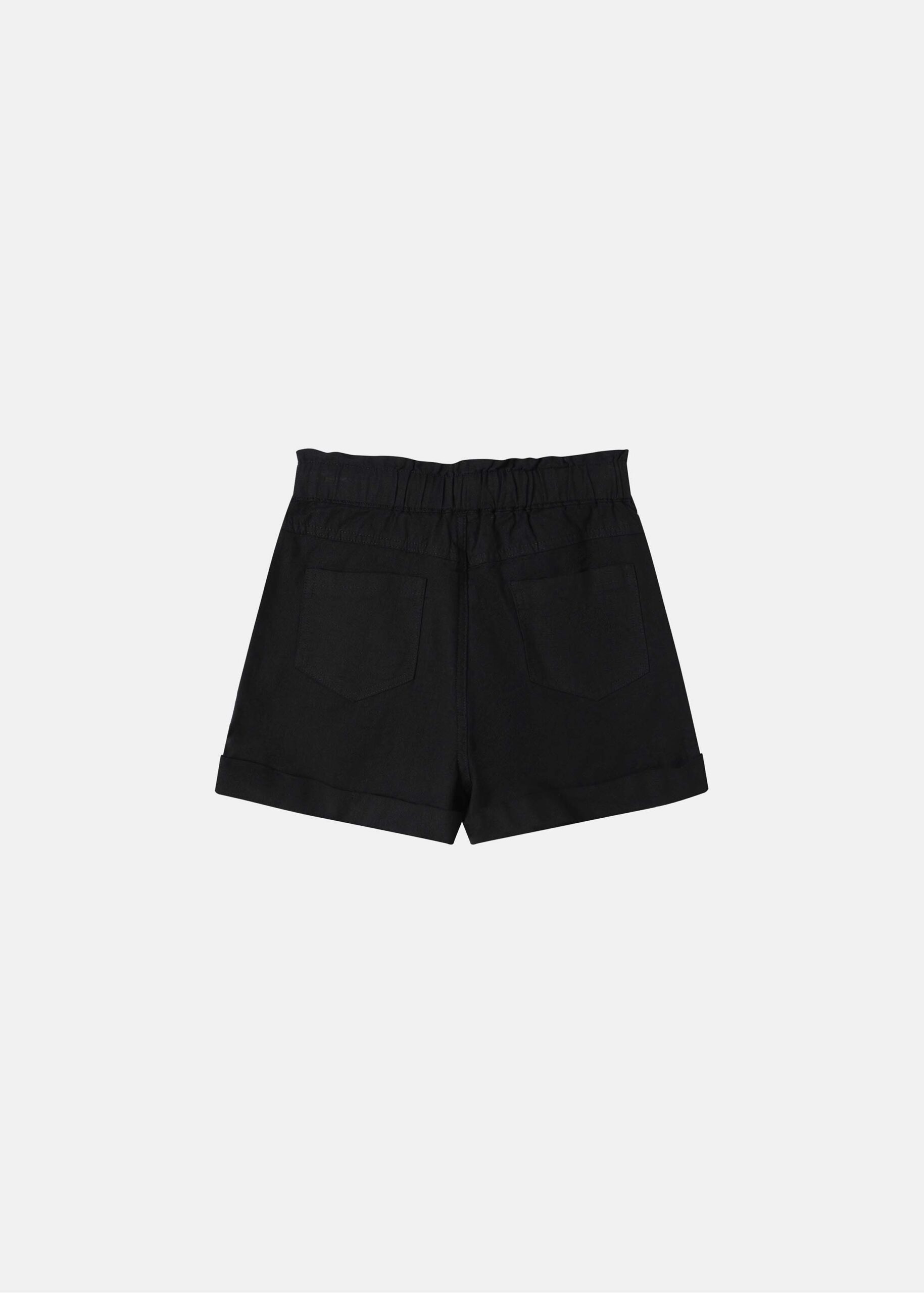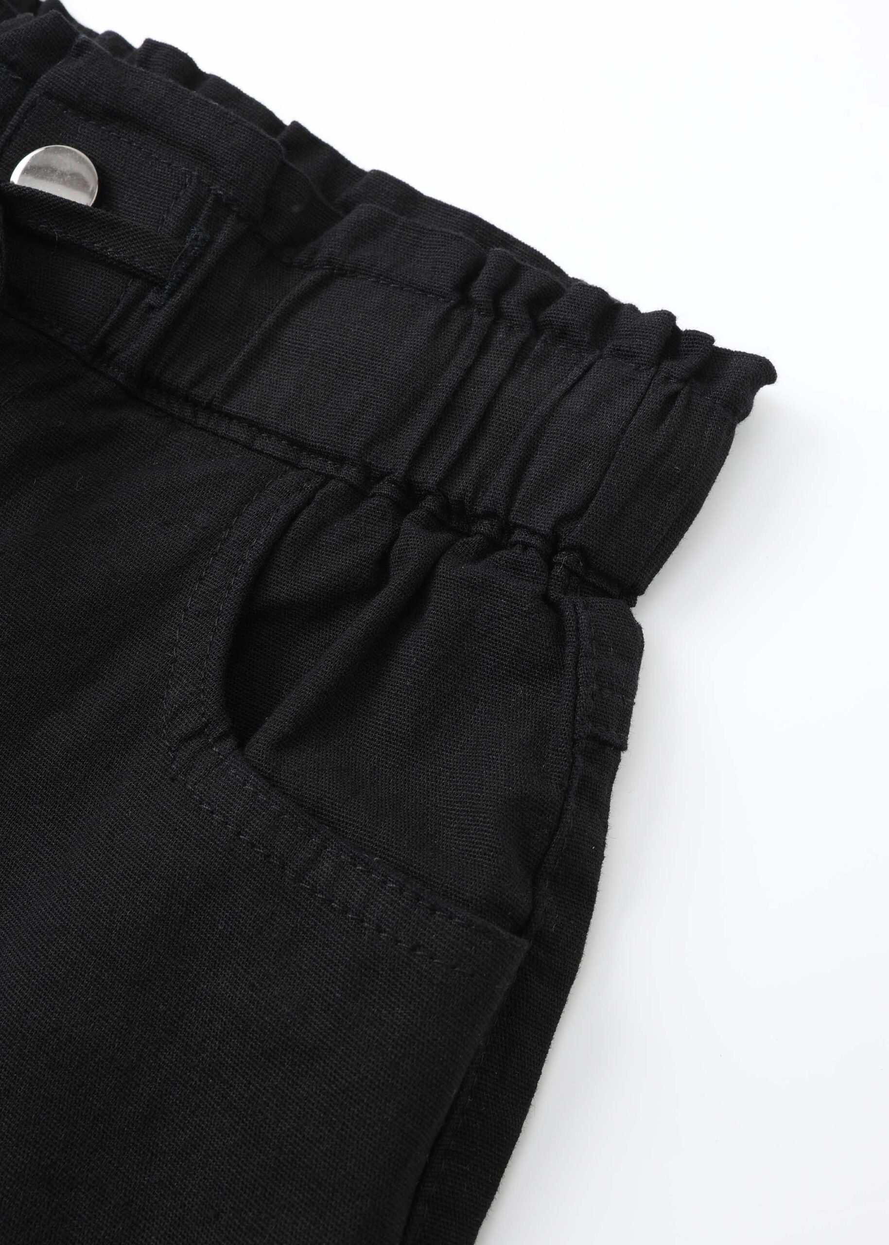 Kids girl short, linen, elastic ruffled waist with front tie, front and back pockets, front button and zipper closure, unique and practical