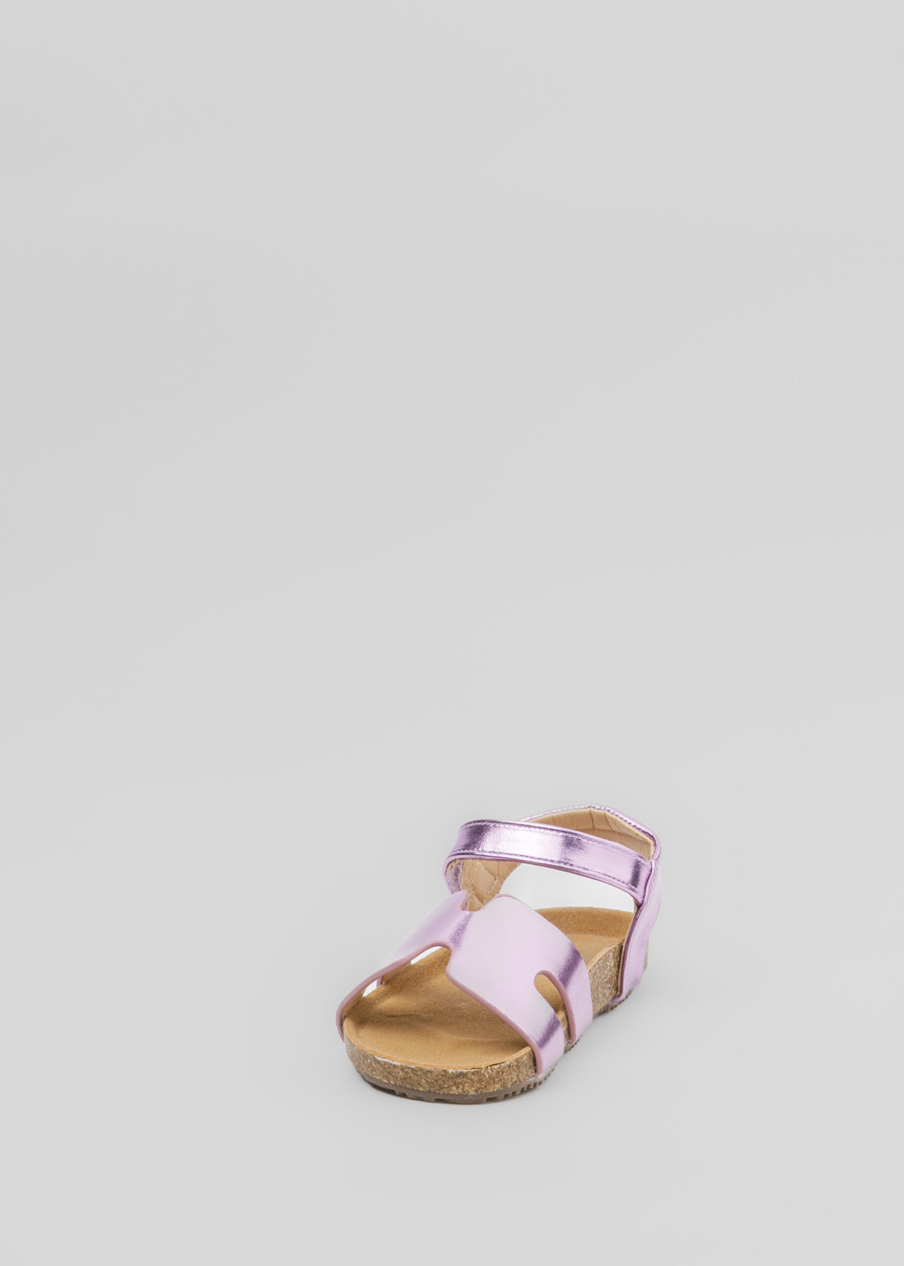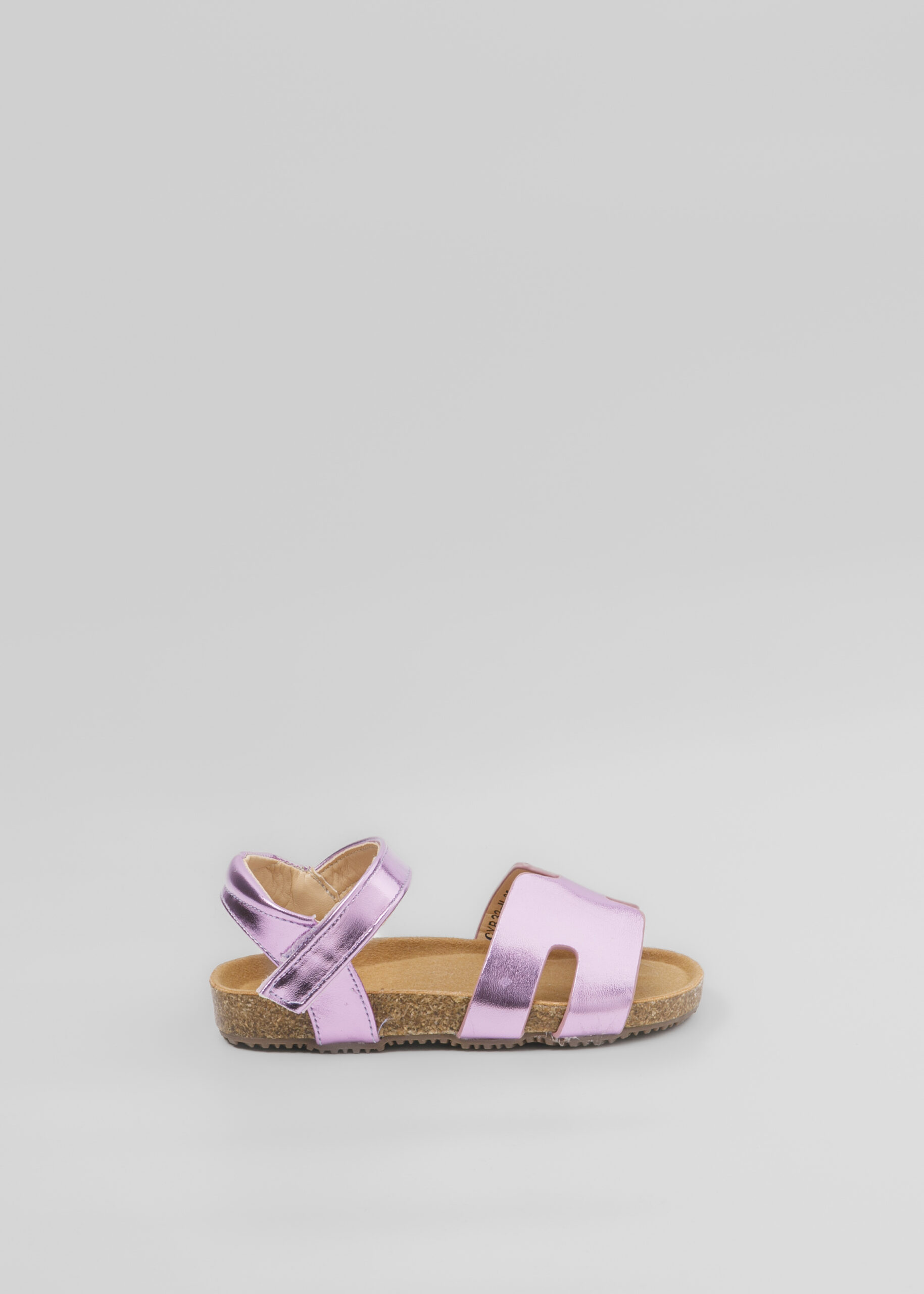 Kids girl sandal, patent leather, round open toe, upper straps, ankle strap with hook and loop to close, rubber sole, unique and modern
