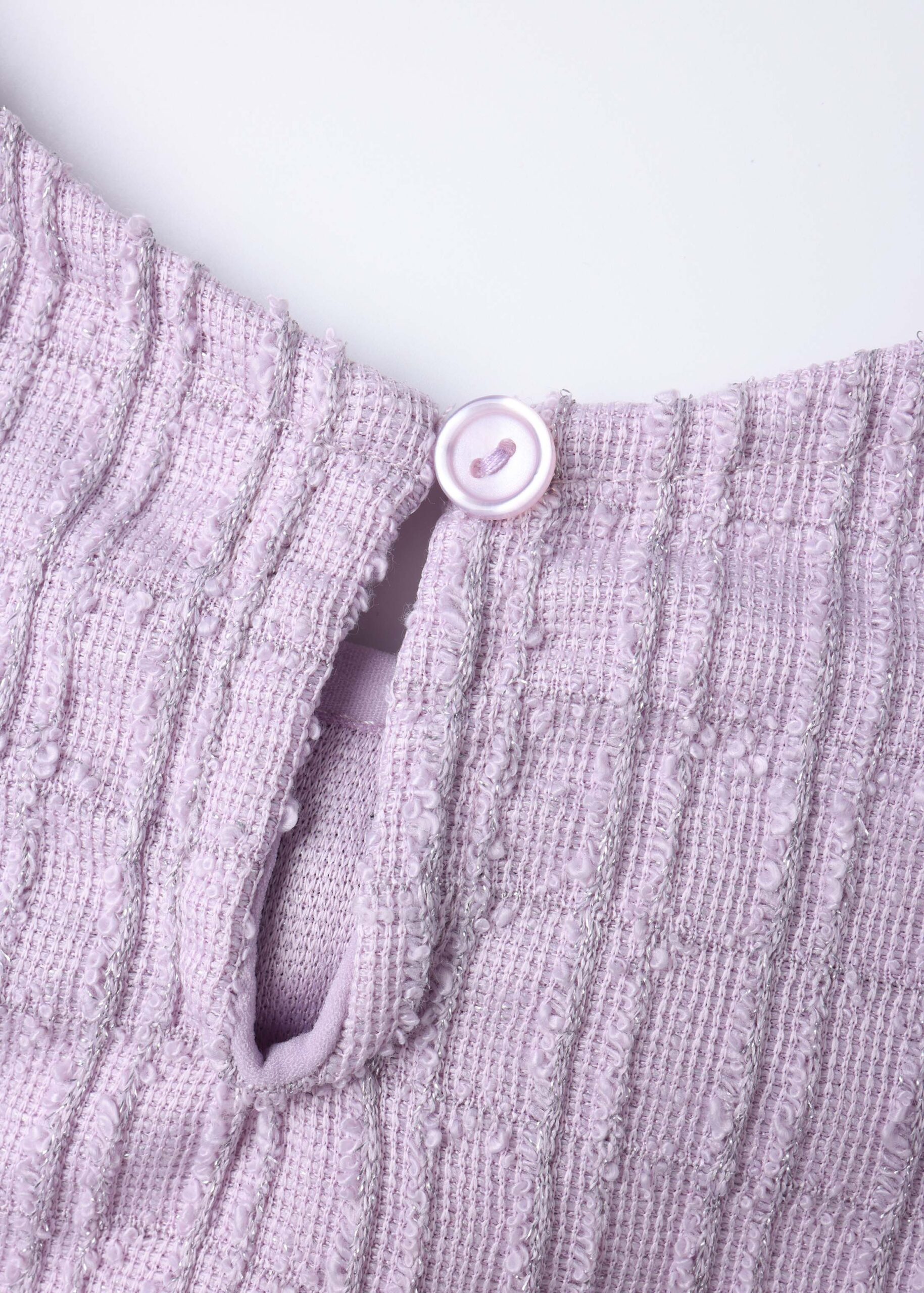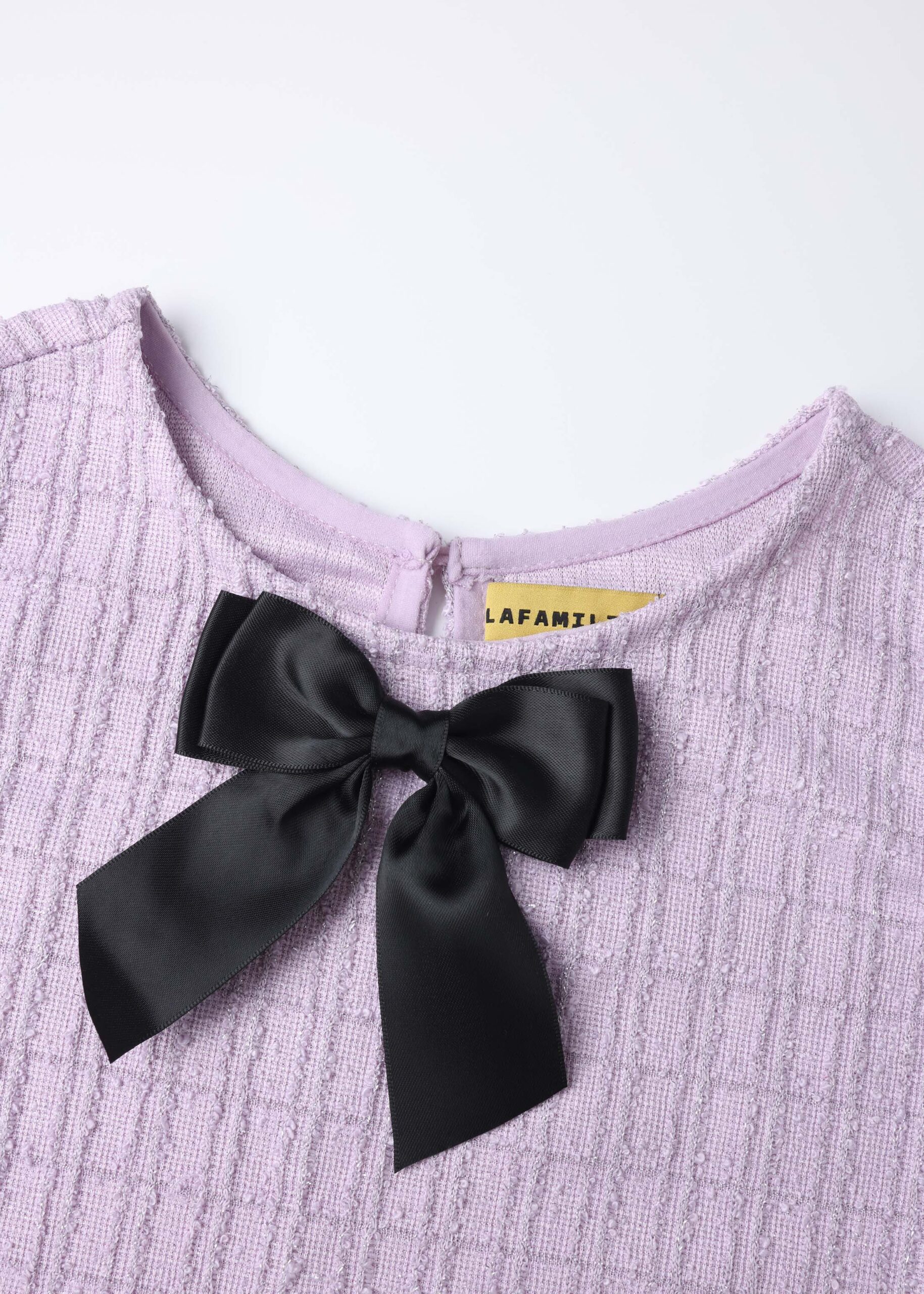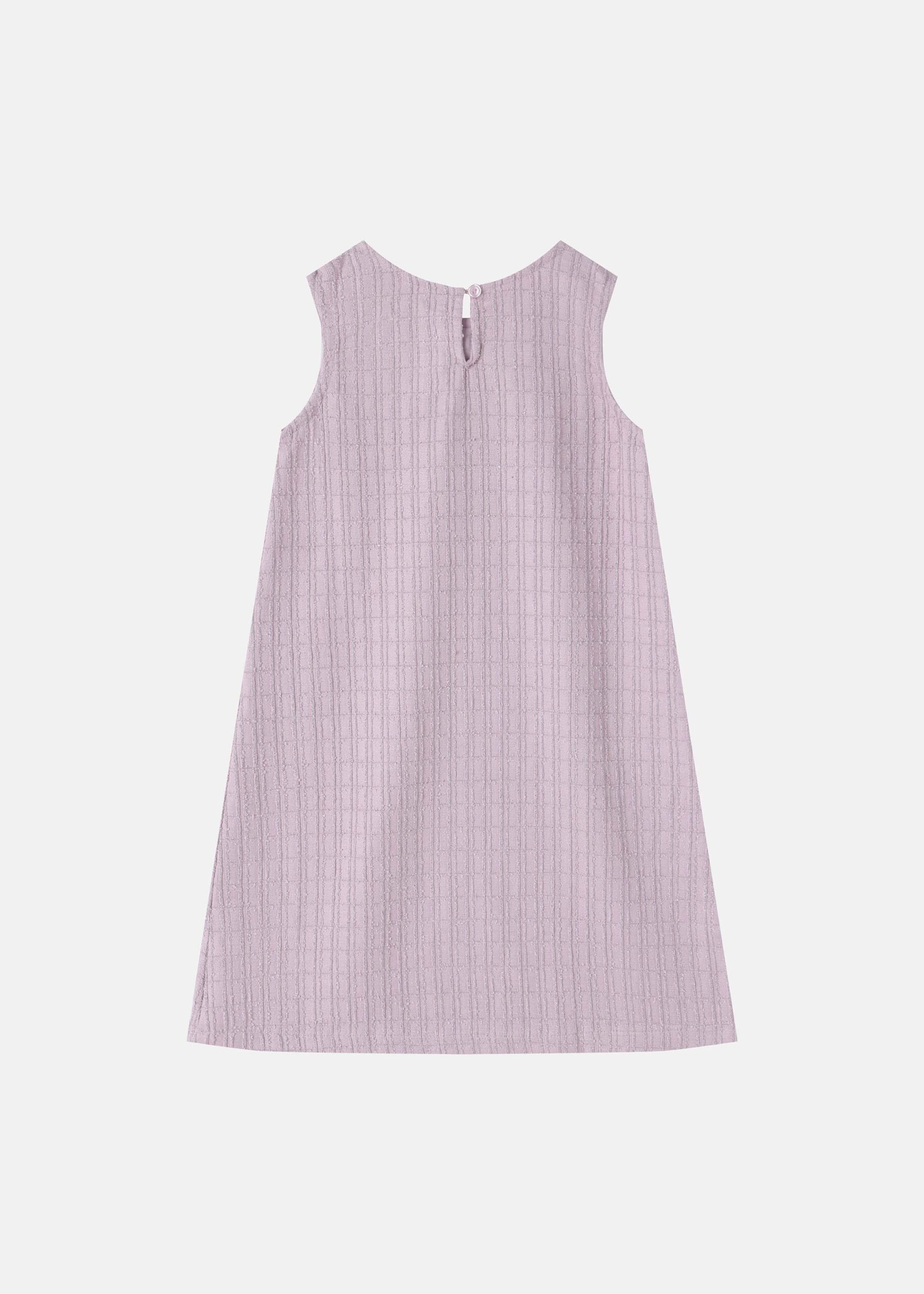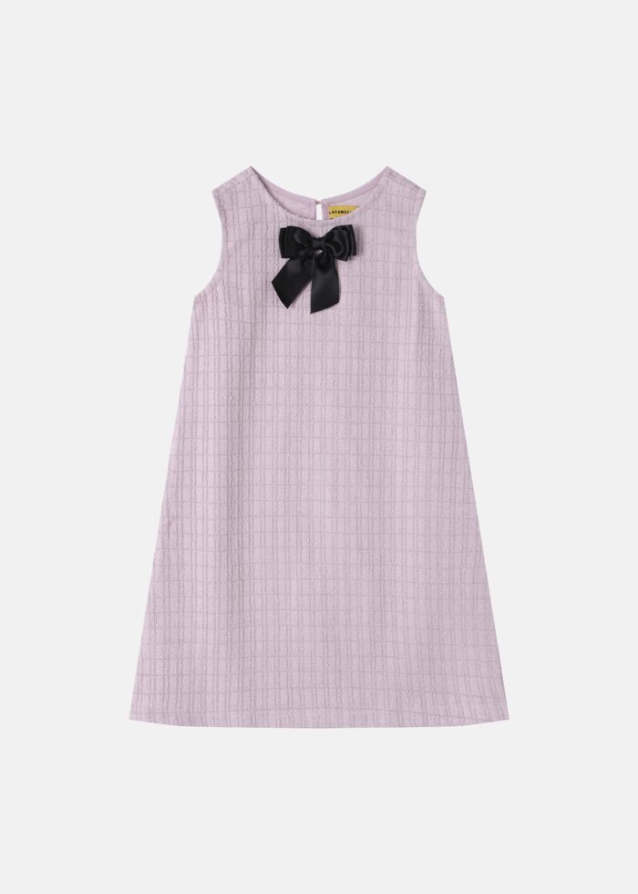 Kids girl dress, short, patterned fabric, round neck with back button, sleeveless, front bow decor, unique and modern