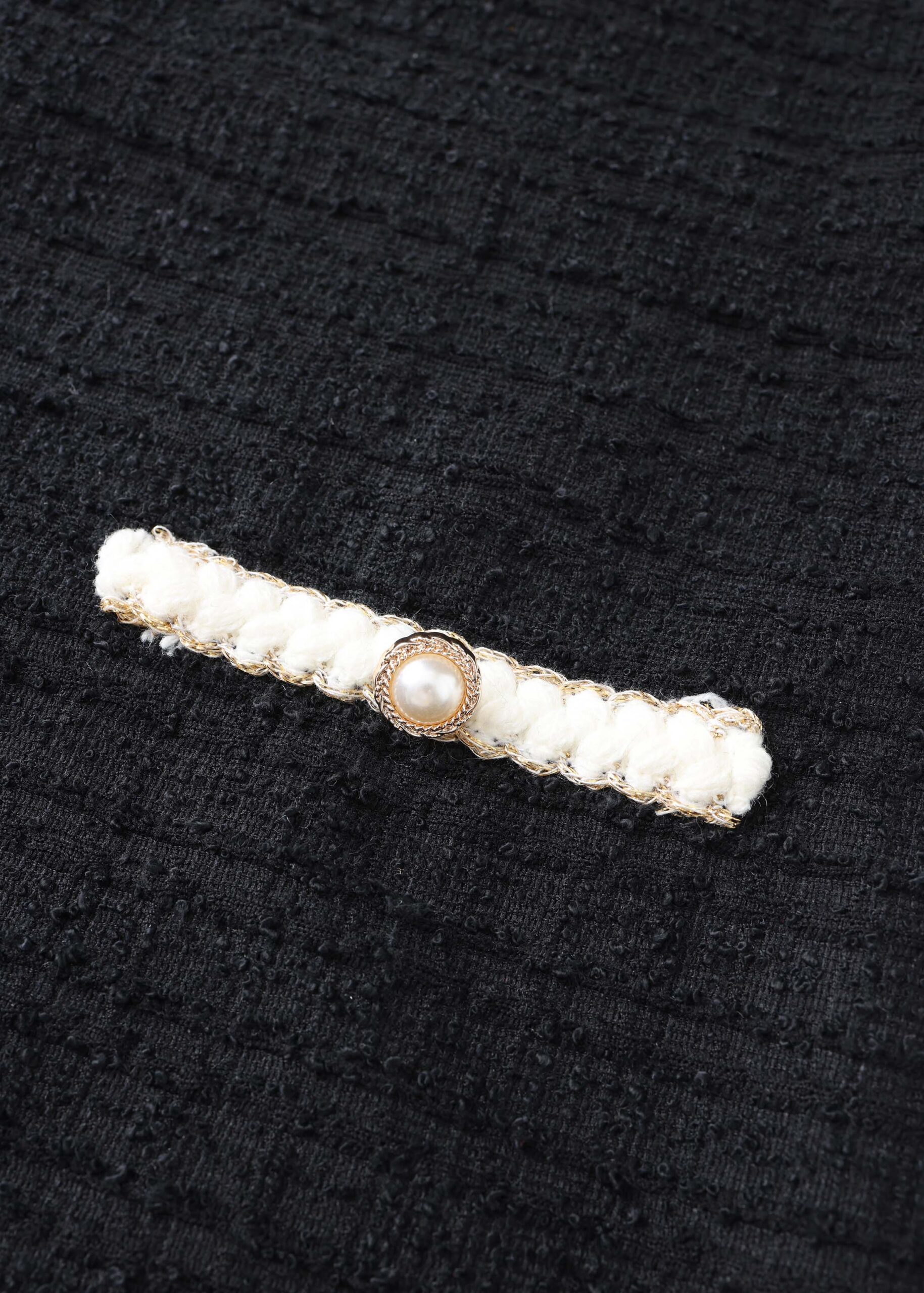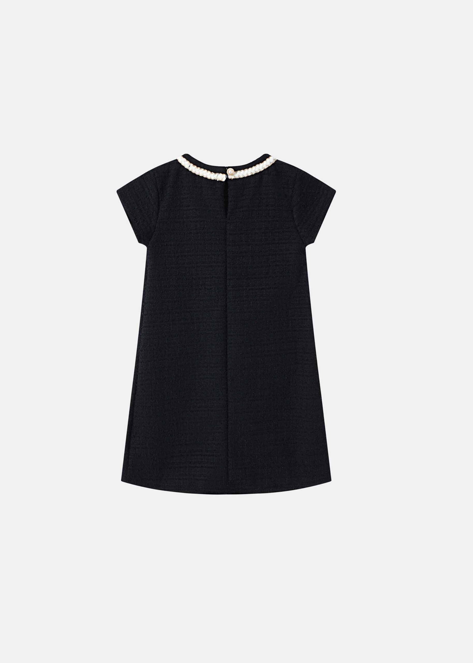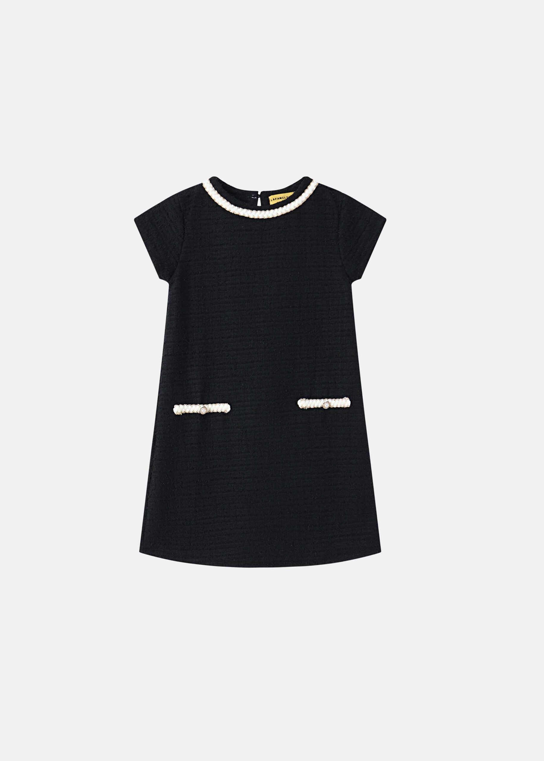 Kids girl dress, short, patterned fabric, round neck with embroidered decor, back button, short sleeves, front fake pockets, unique and modern