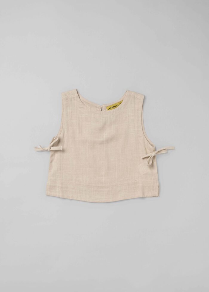 Kids girl top, plain, sleeveless, round neck, back button to close, side ties, unique and modern