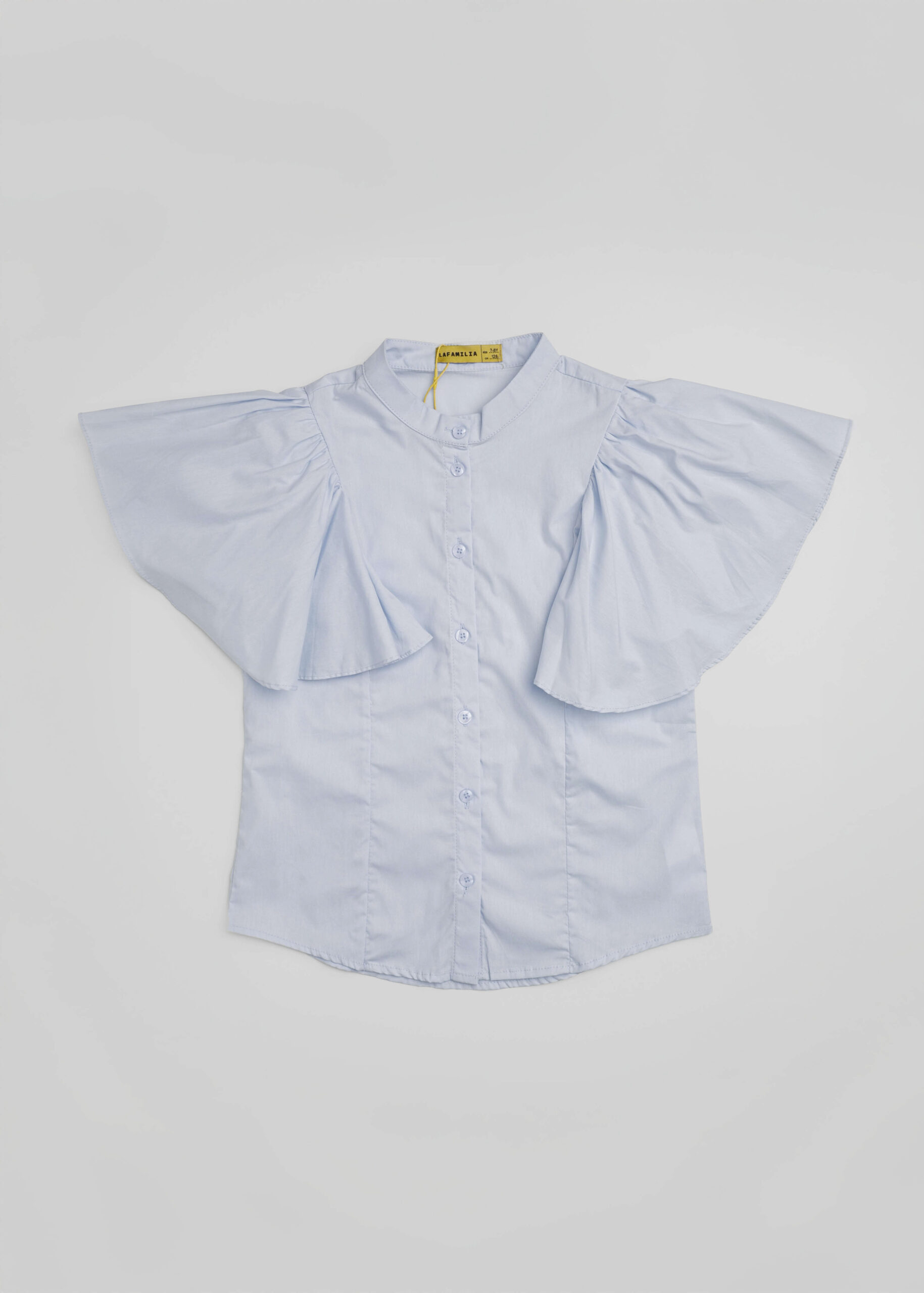 Kids girl shirt, plain, round neck, front buttons to close, short sleeves with ruffled shoulders, unique and modern