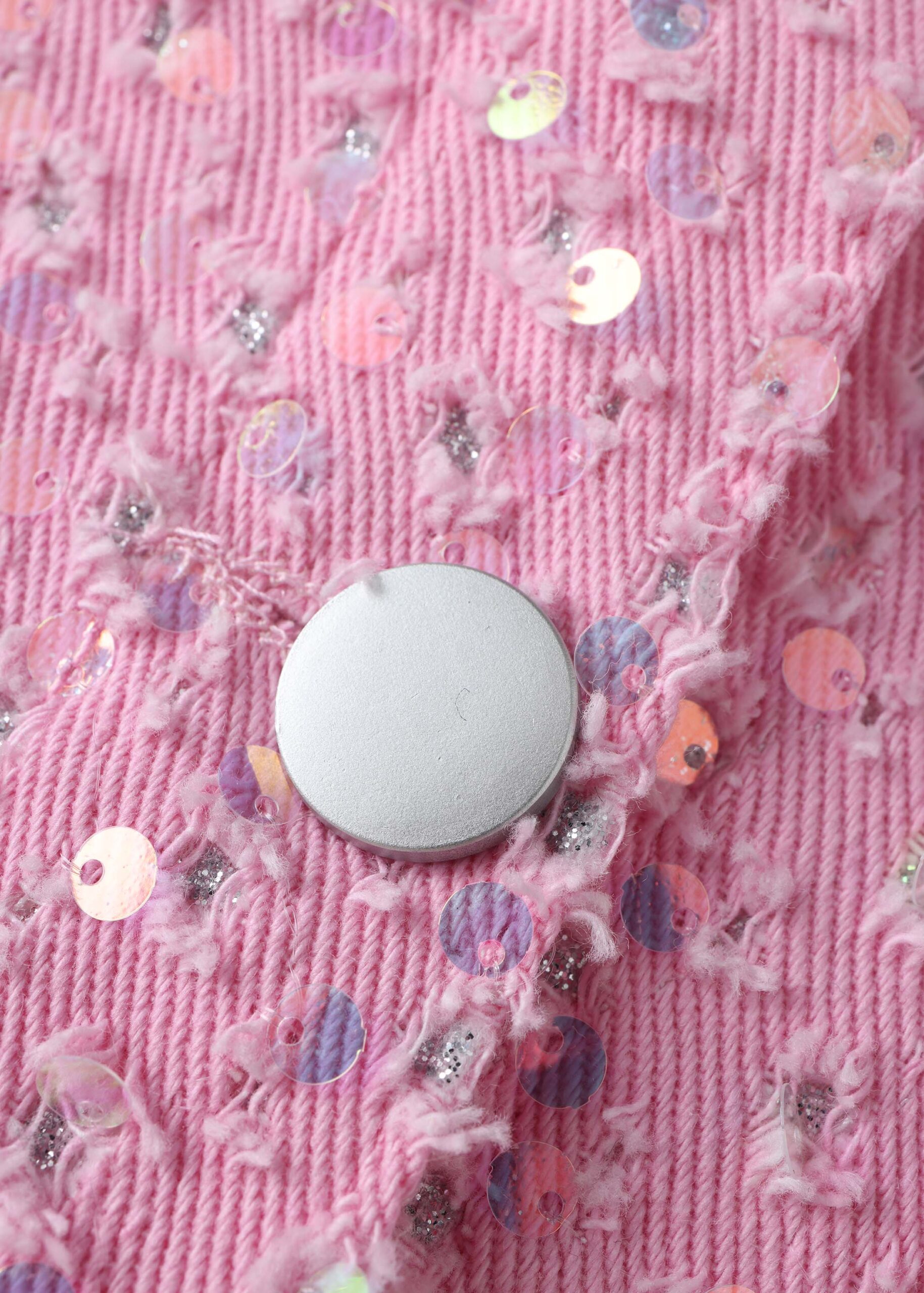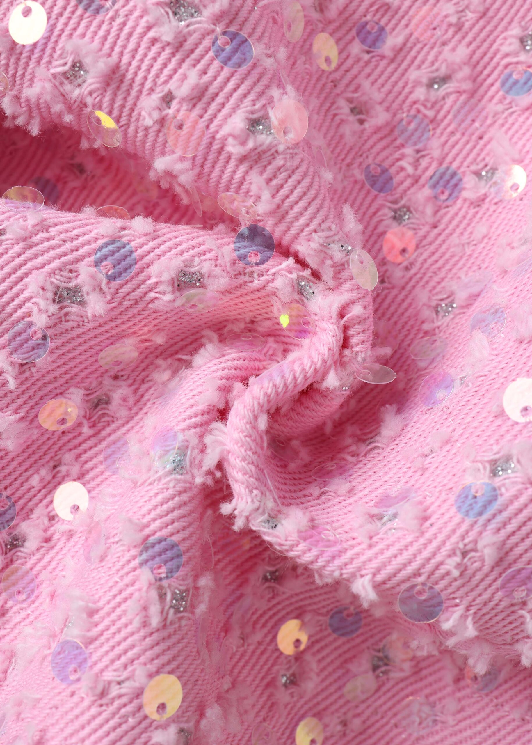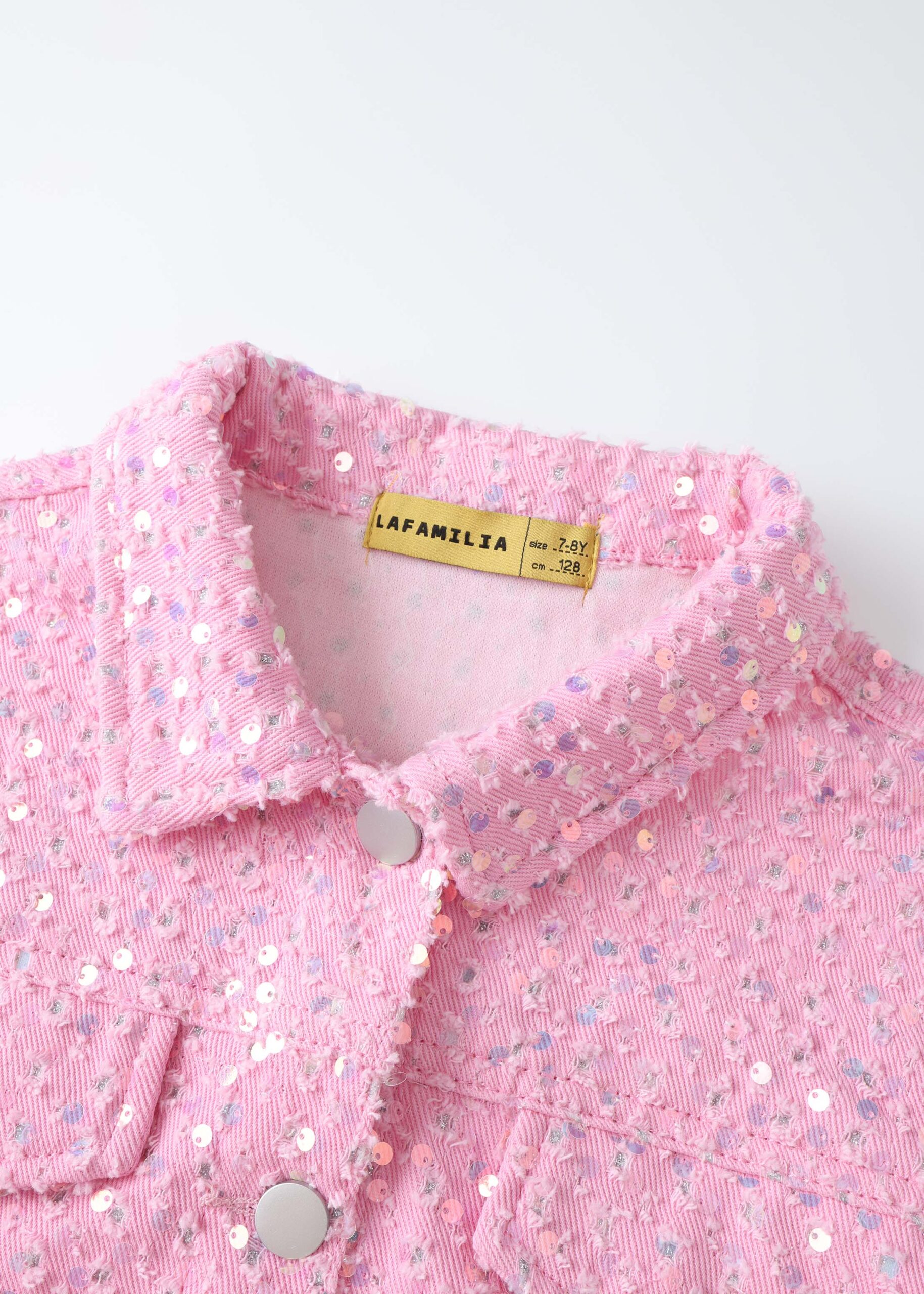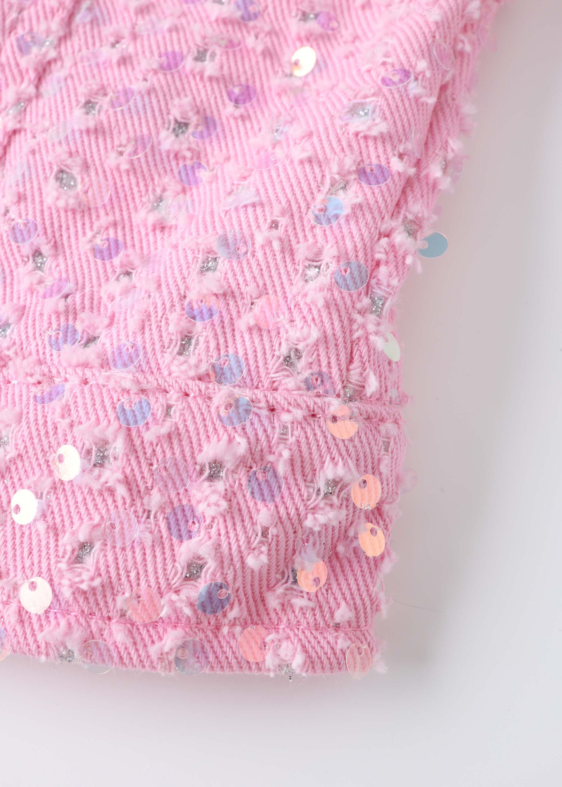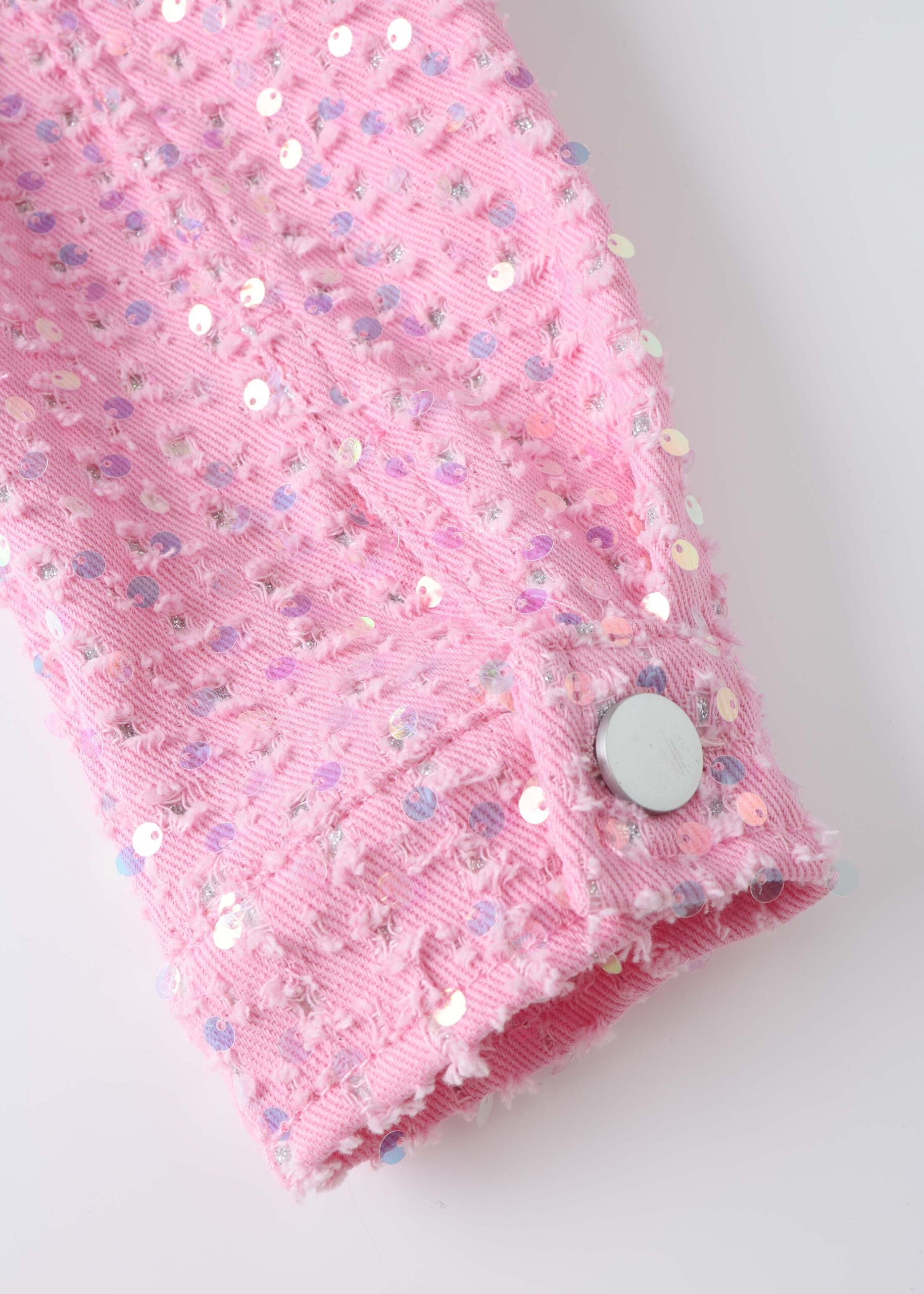 Kids girl jacket, denim with sequin decor, rolled collar, front buttons, long sleeves with tight cuff, front chest pockets, unique and modern