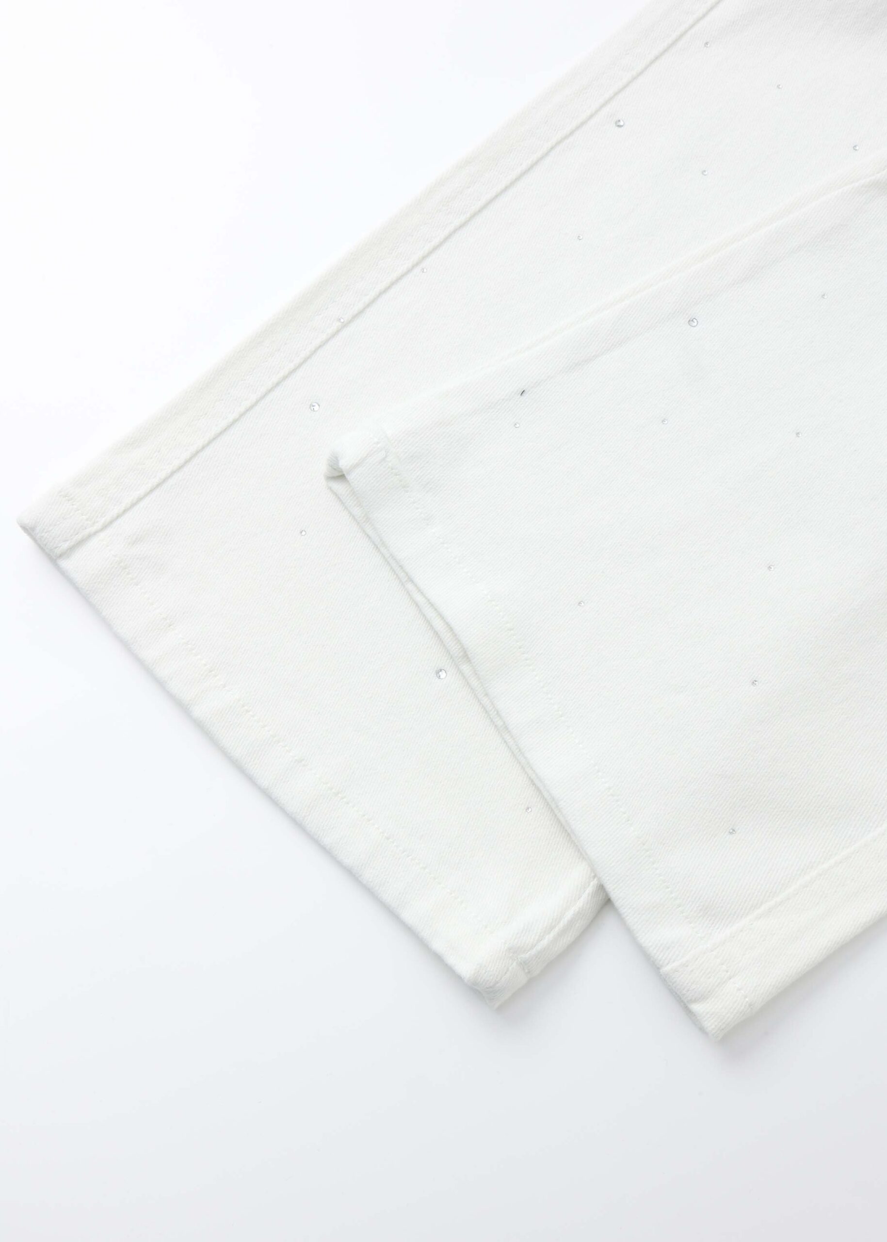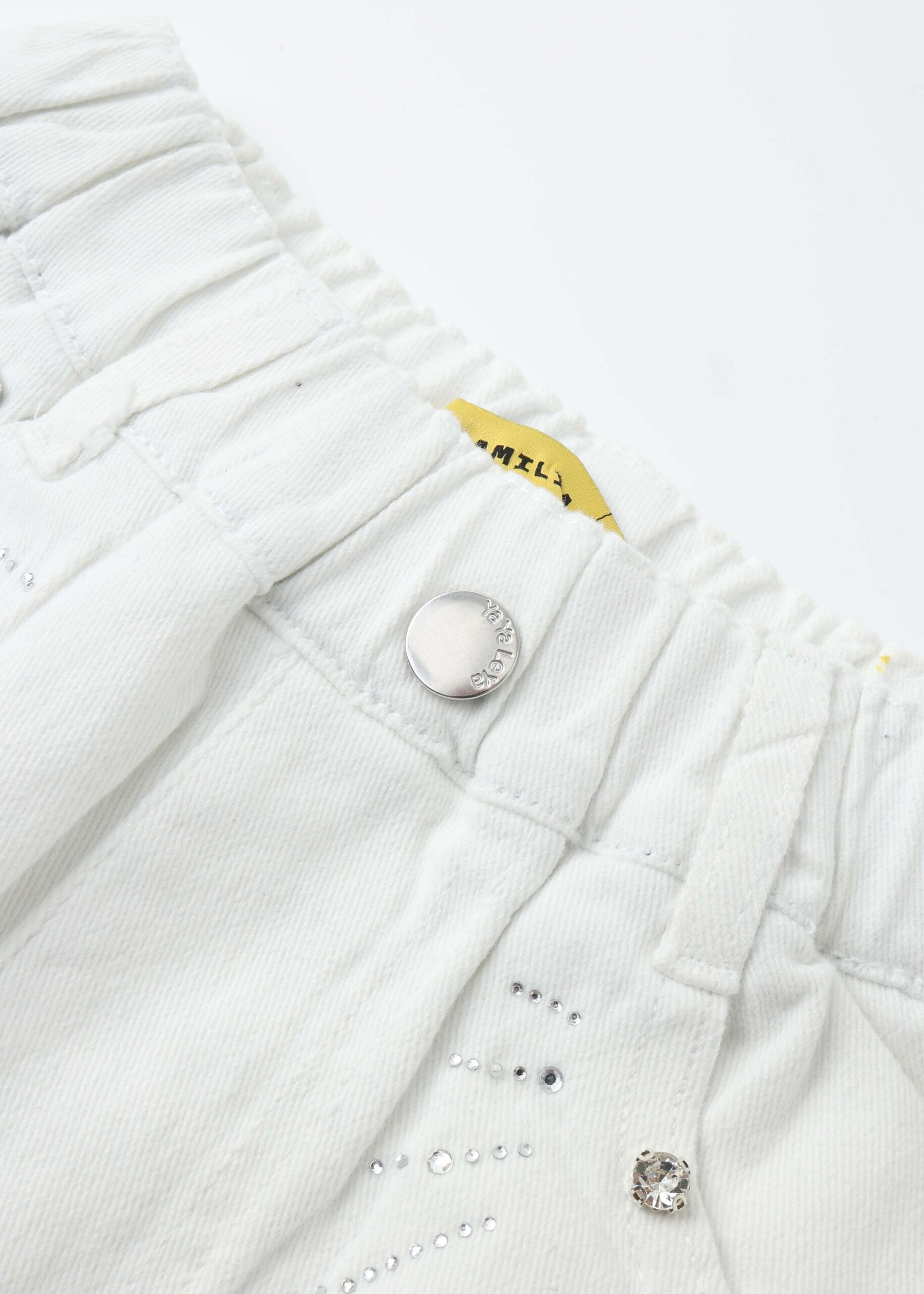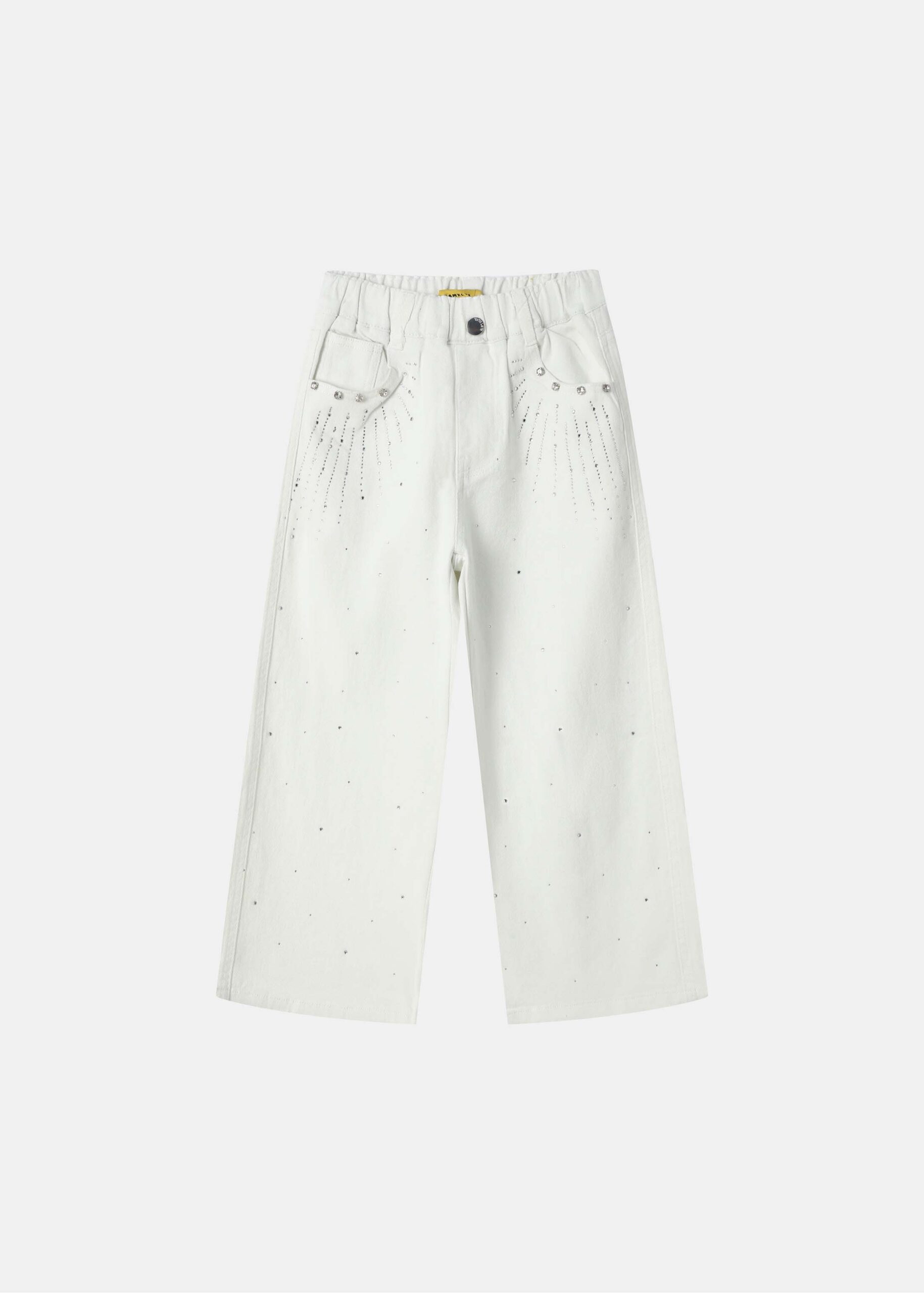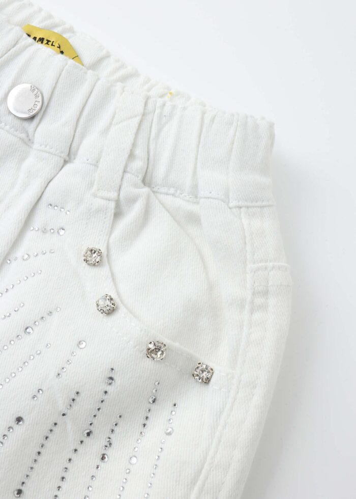 Kids girl trouser, jeans, straight-leg, strass decor, elastic waist, front fake button and zipper, front and back pockets, unique and modern