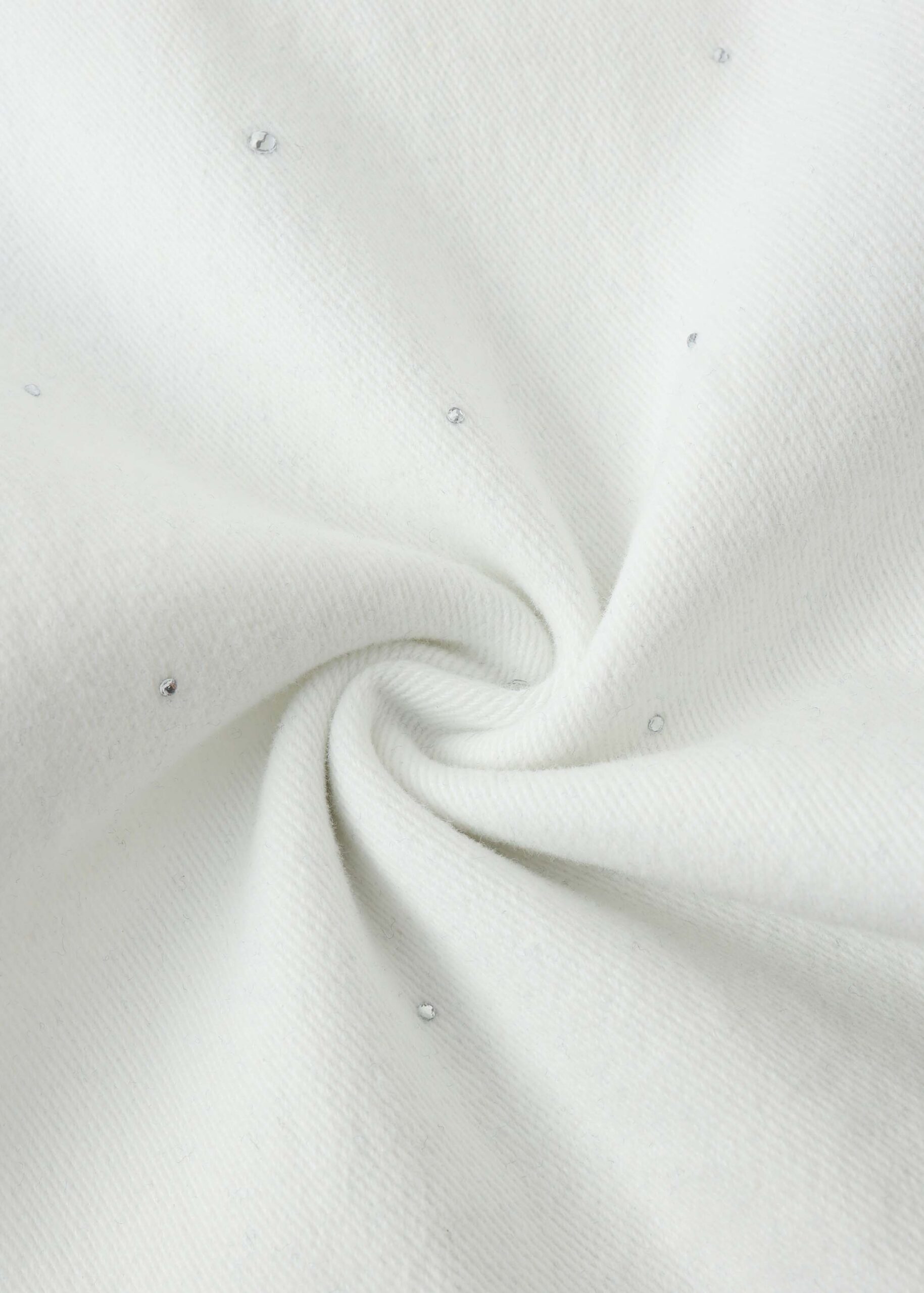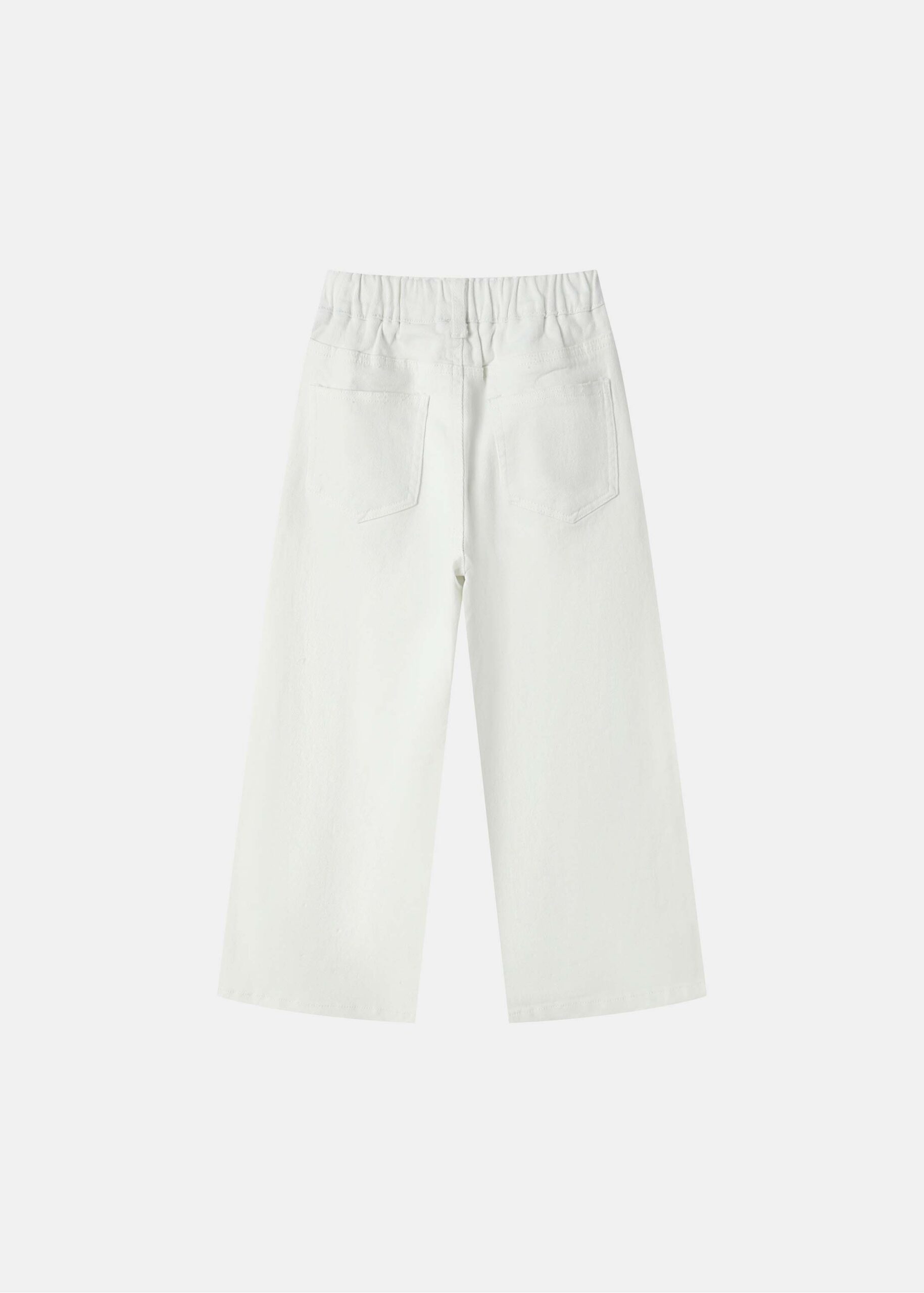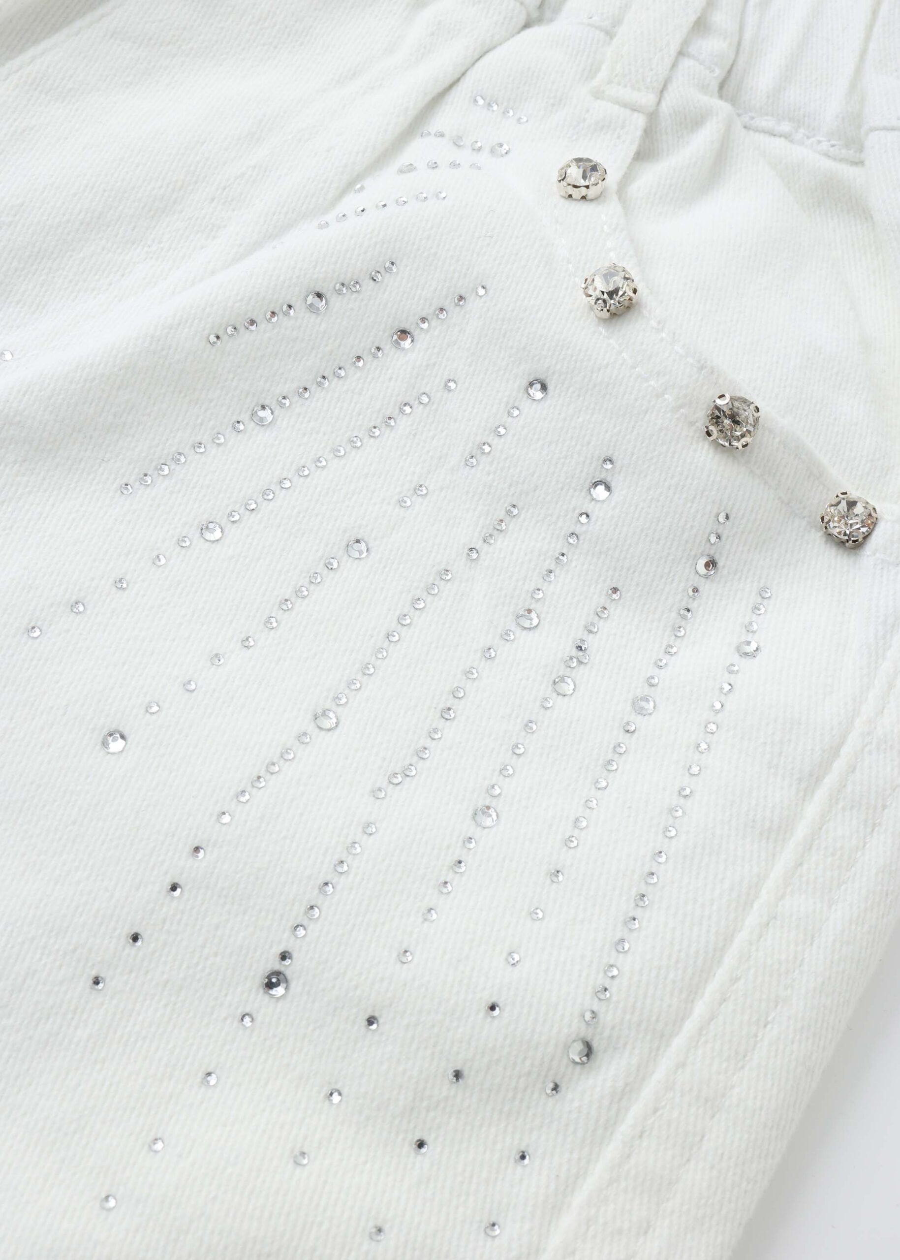 Kids girl trouser, jeans, straight-leg, strass decor, elastic waist, front fake button and zipper, front and back pockets, unique and modern