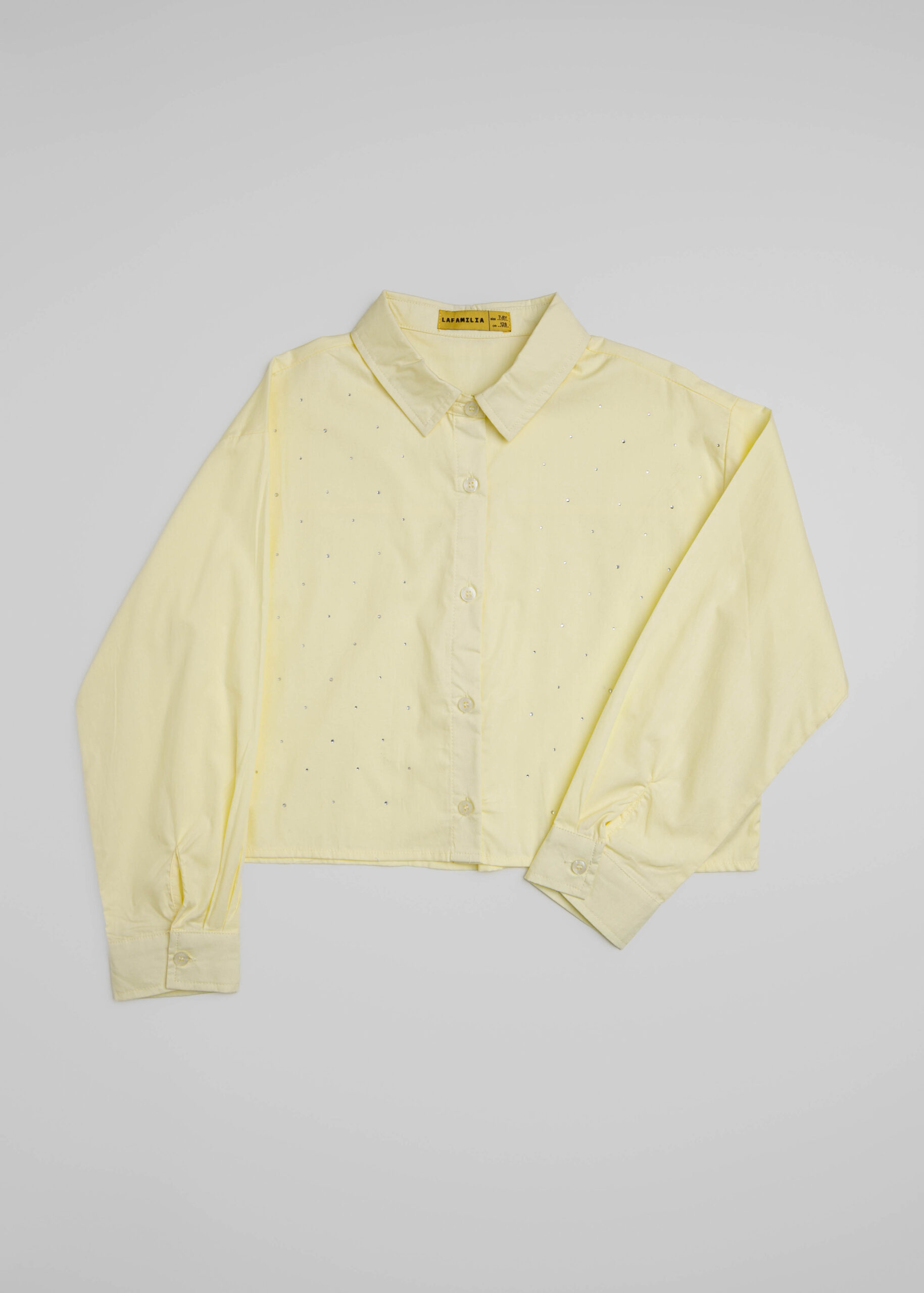 Kids girl shirt, strass decor, rolled collar, fornt buttons to close, long sleeves with tight cuff, unique and modern