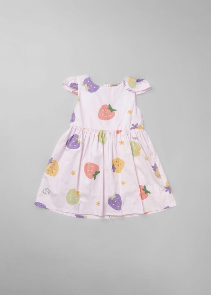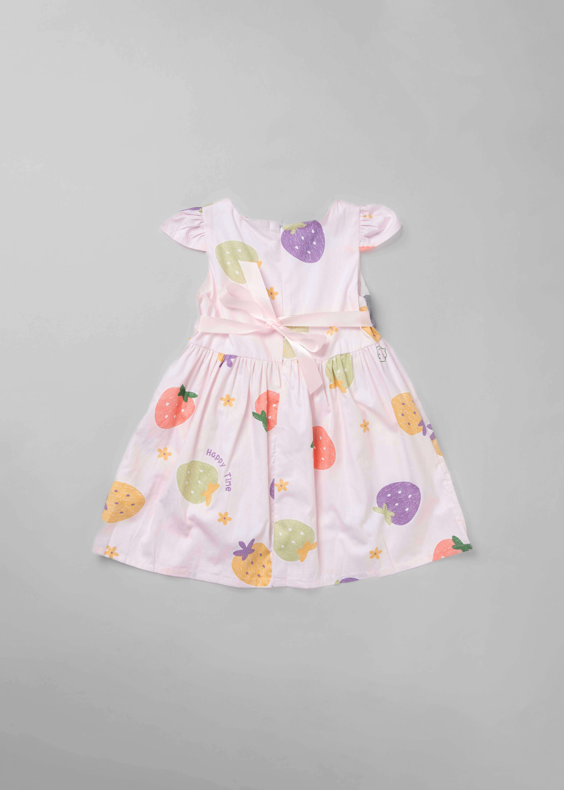 Kids girl dress, strawberry, pleated waist, round neck with back zipper closure, short sleeves, back tie, unique and modern