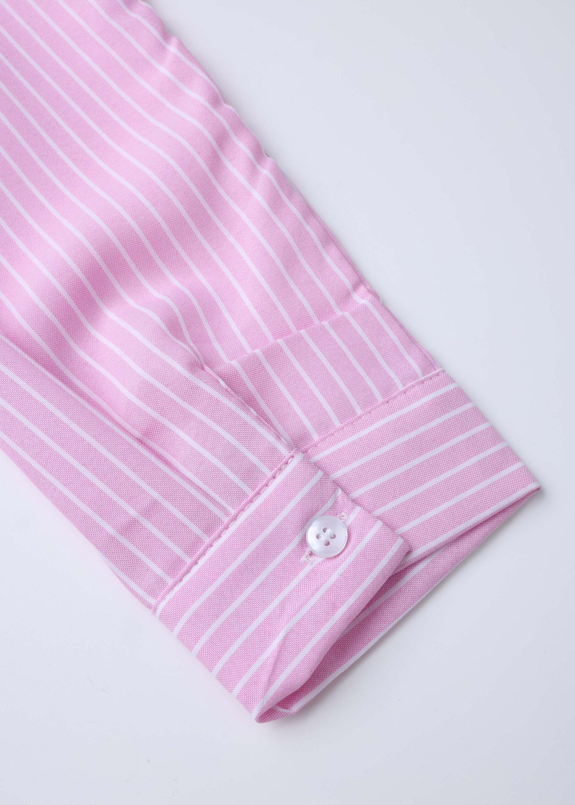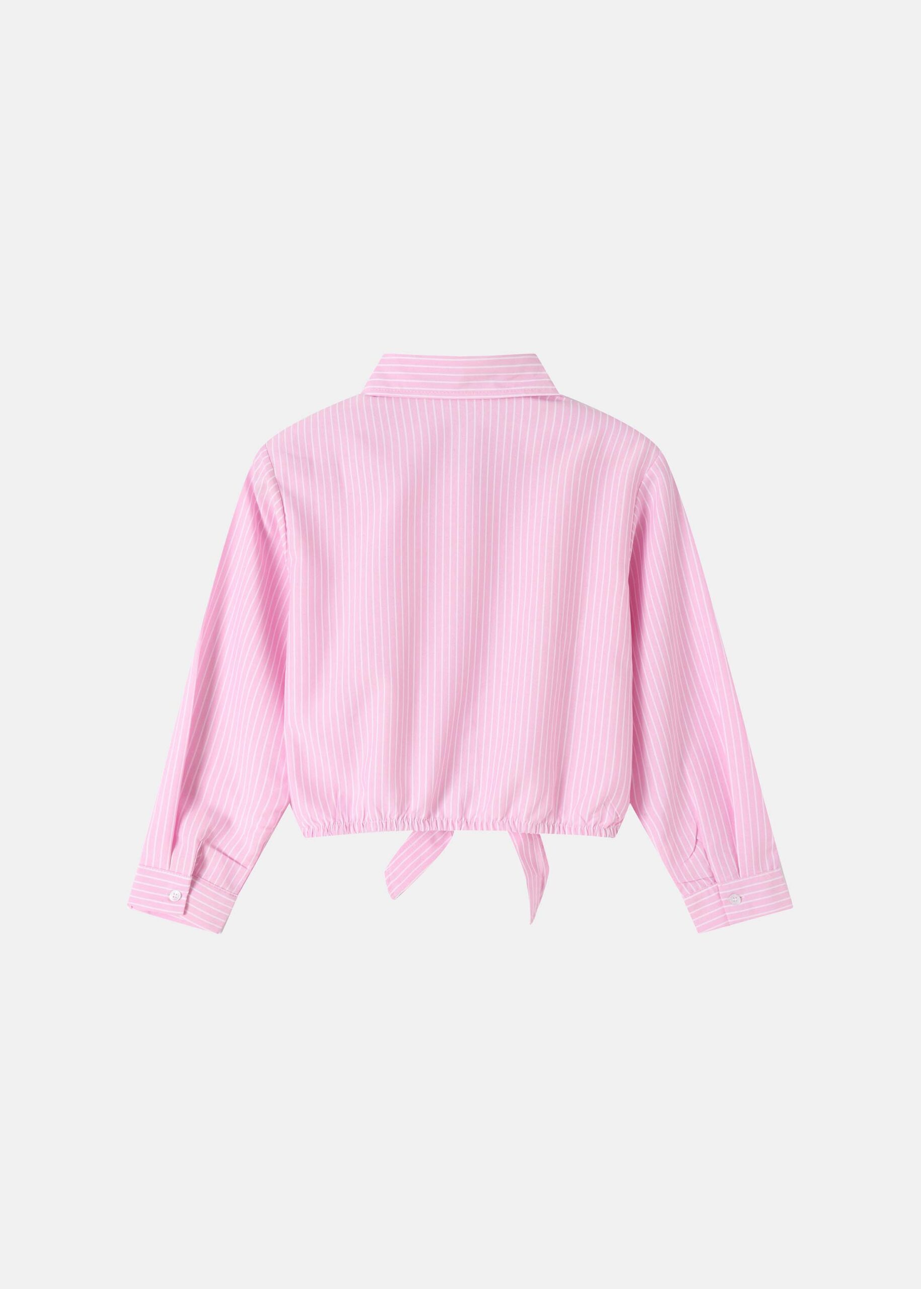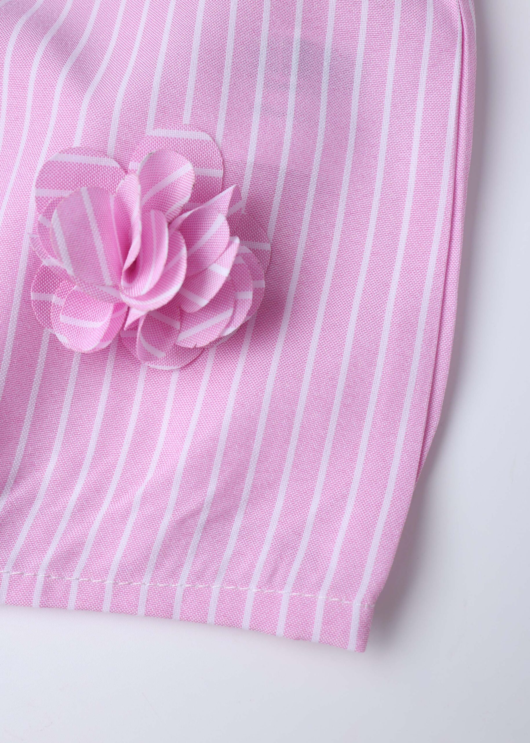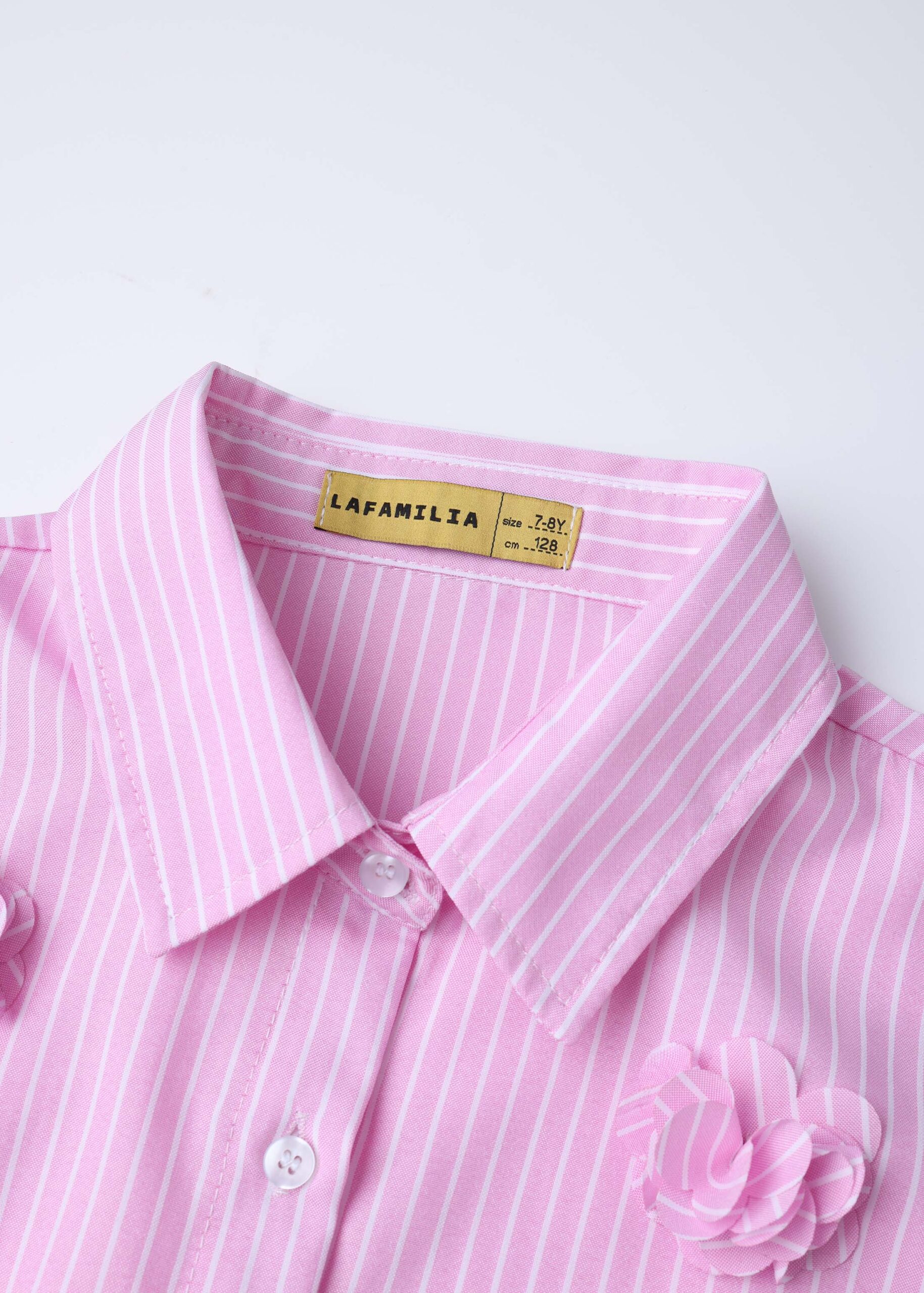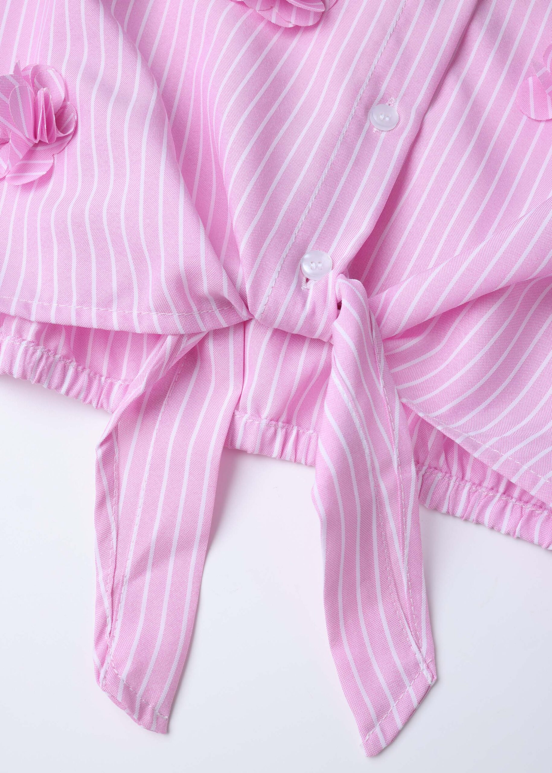 Kids girl shirt, striped, flowers decor, rolled collar, front buttons to close, long sleeves with tight cuff, front tie, unique and modern