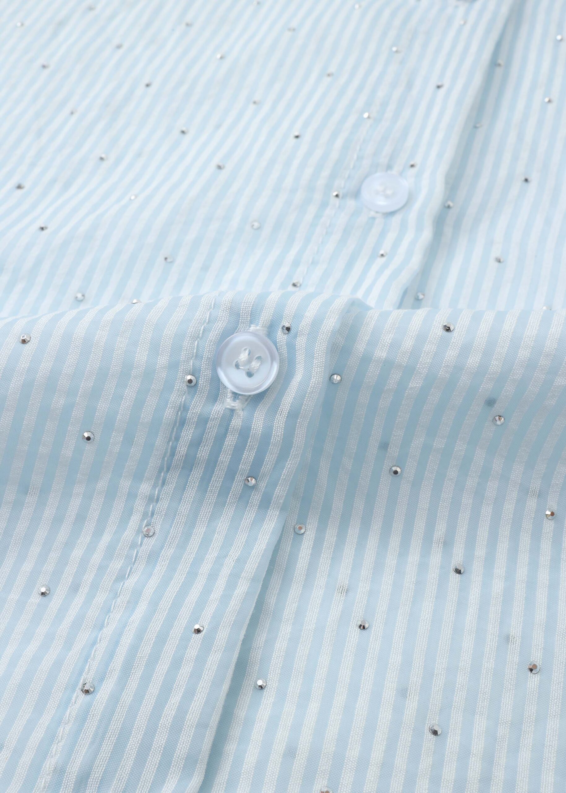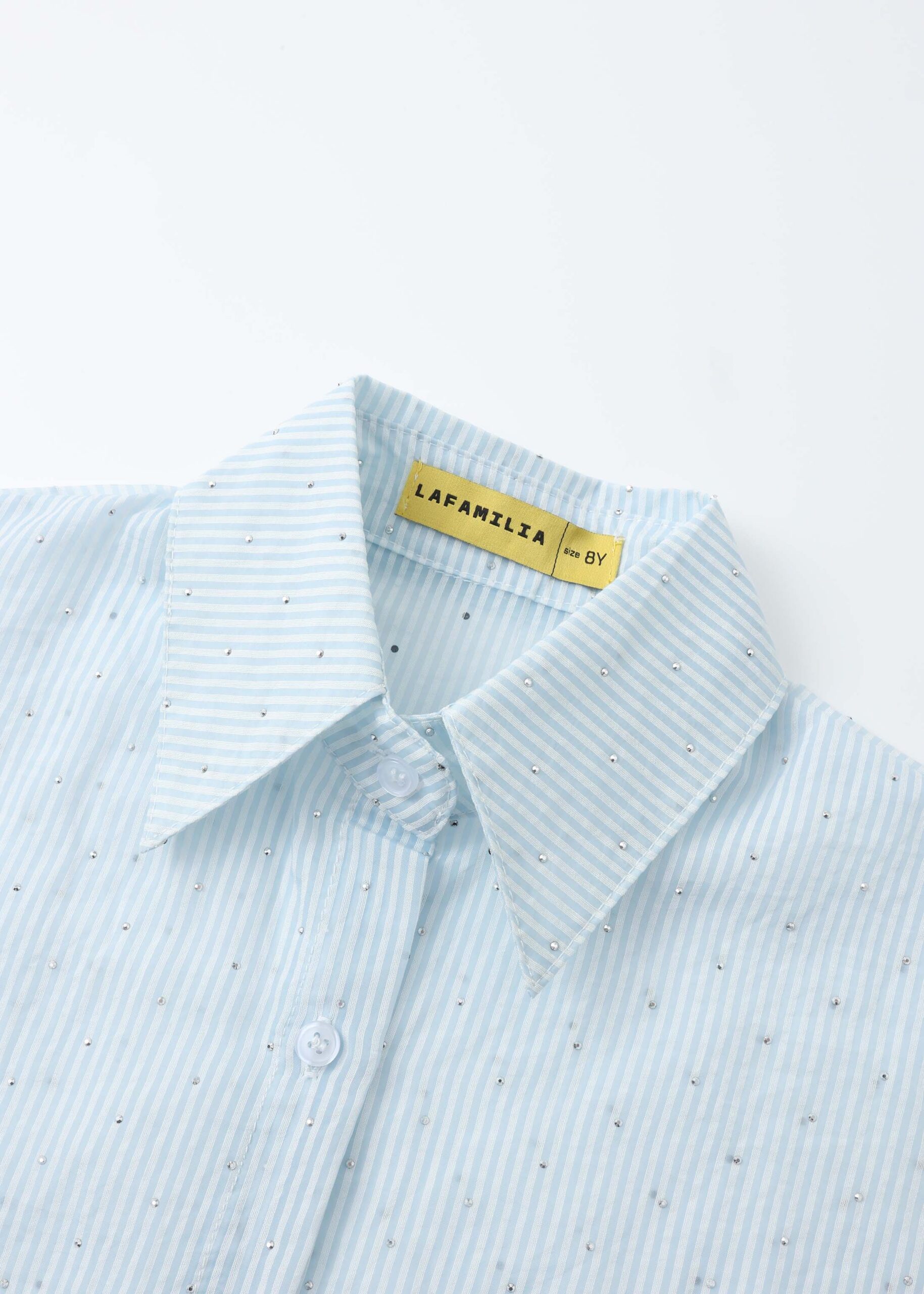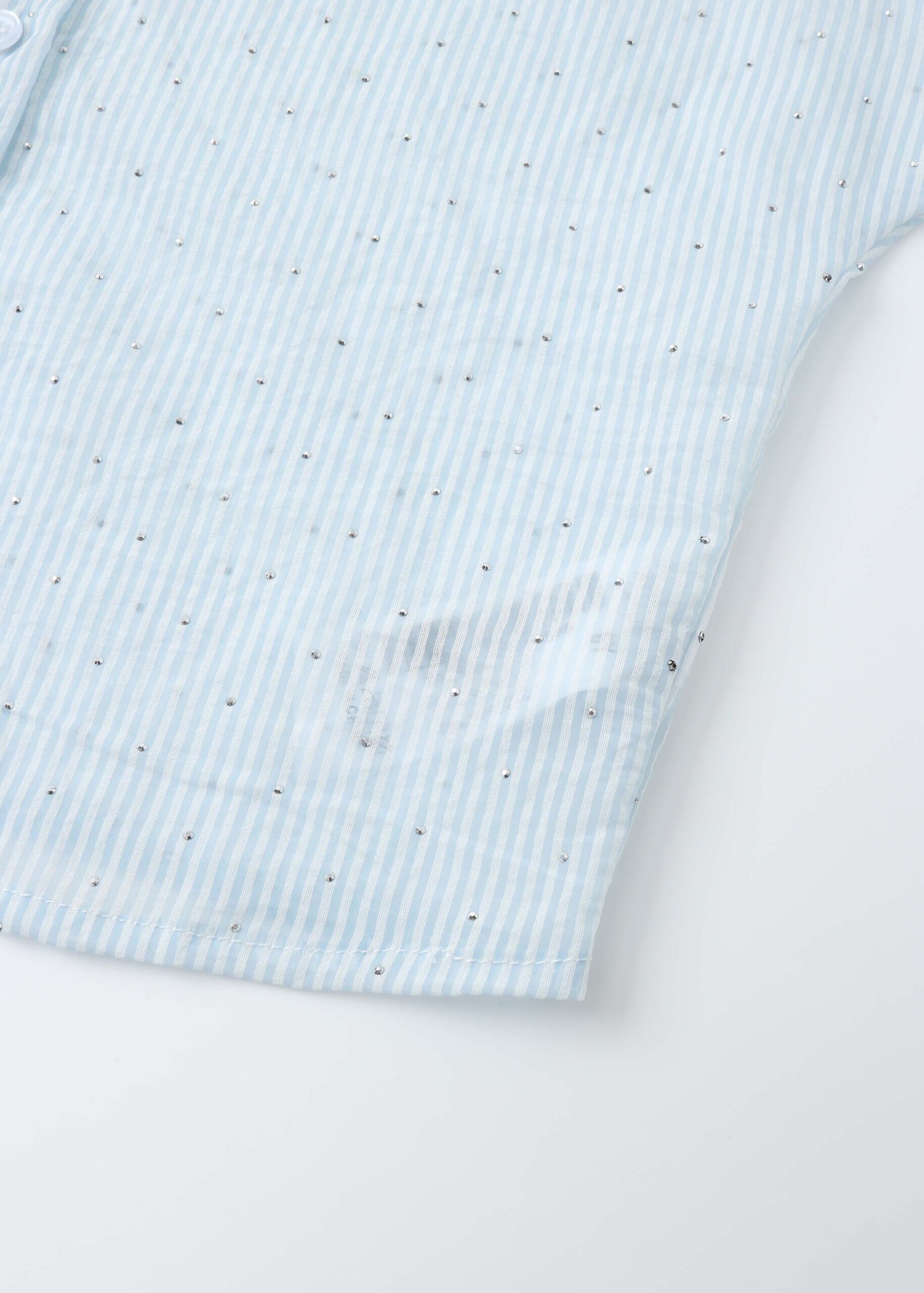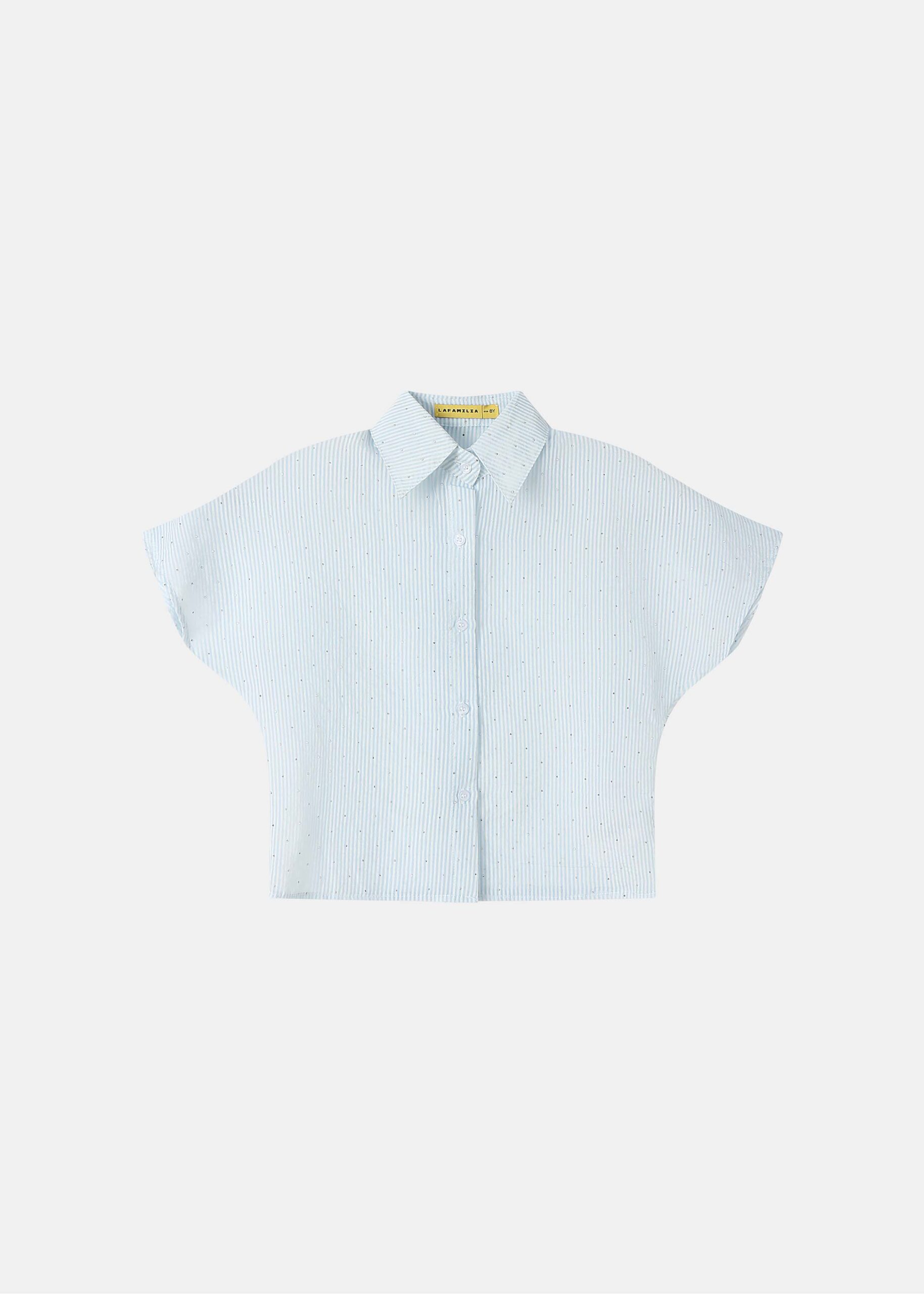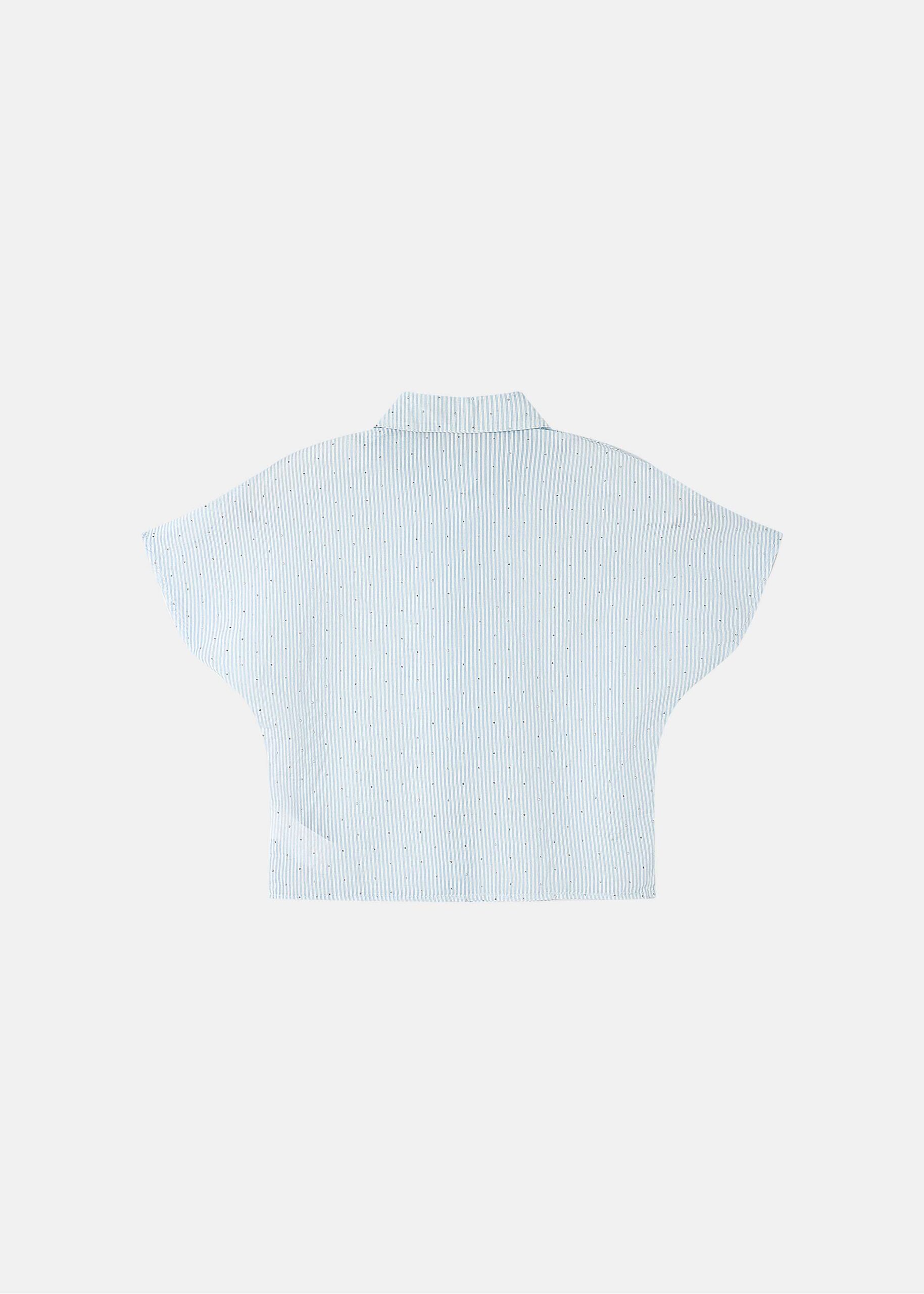 Kids girl shirt, striped, beads decor, wide cut with short sleeves, rolled collar, front buttons to close, unique and modern